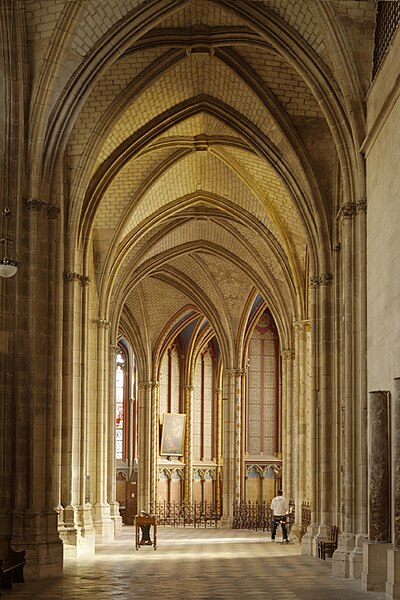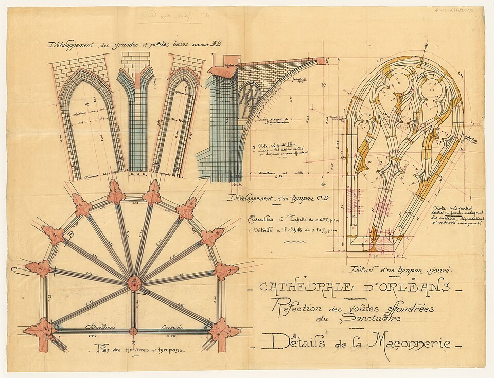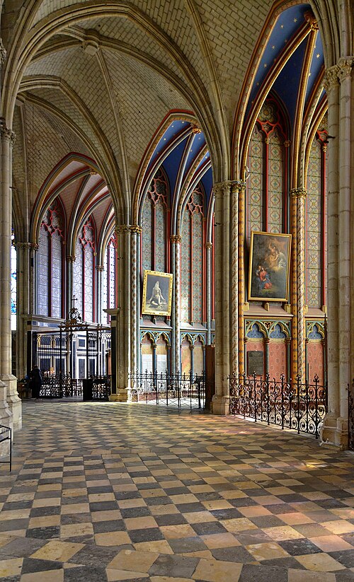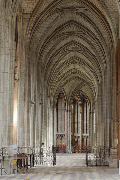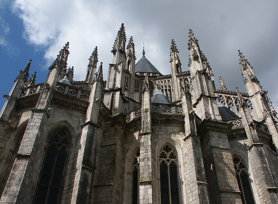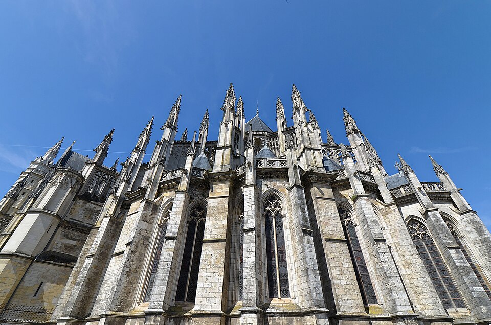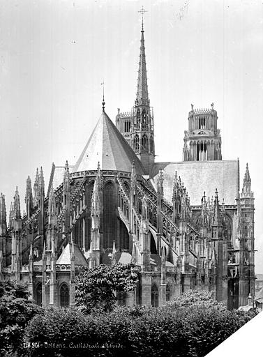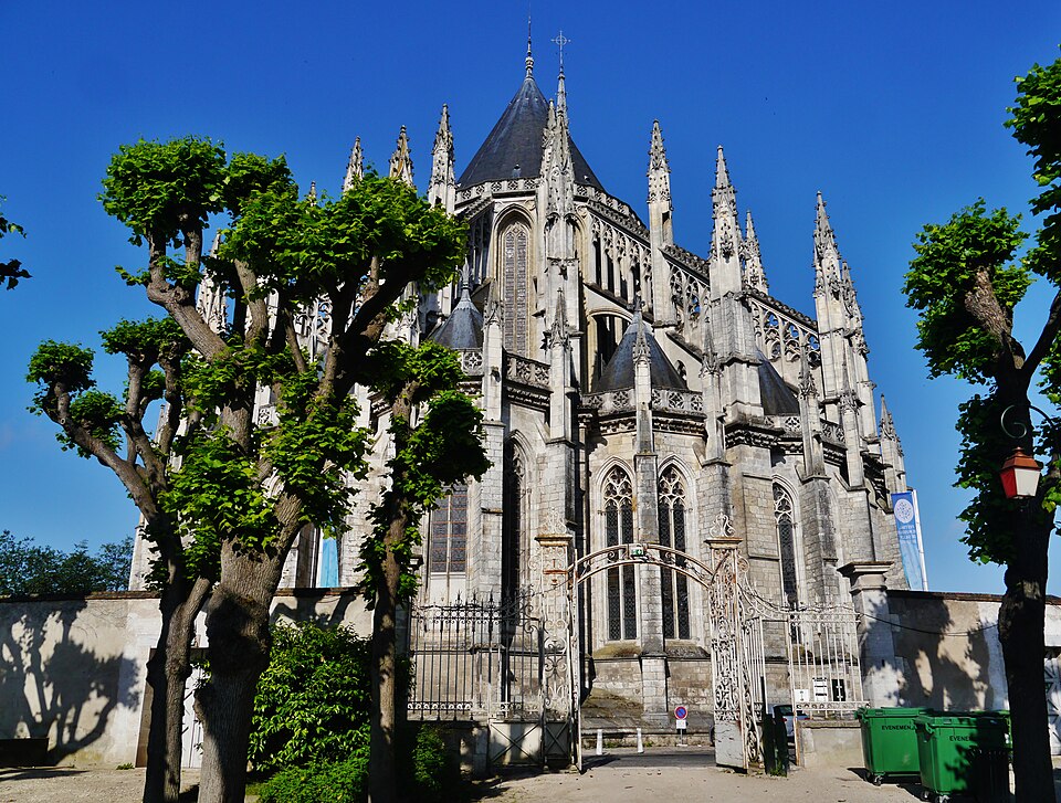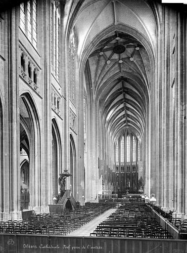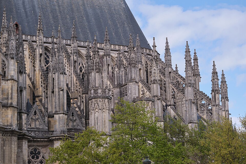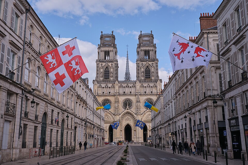 La cathédrale Sainte‑Croix d’Orléans, siège du diocèse et dédiée à la Sainte‑Croix, est un édifice gothique situé dans le Loiret, en région Centre‑Val de Loire ; elle est classée au titre des monuments historiques depuis la liste de 1862 et a été élevée au rang de basilique par le pape Pie IX le 26 janvier 1855. Deux traditions hagiographiques expliquent sa fondation : la Vie de saint Euverte (IXe siècle) fait d’Euverte un sous‑diacre romain choisi miraculeusement pour l’épiscopat à Orléans, qui aurait retrouvé un trésor, reçu des subsides et un fragment de la Vraie Croix et fait édifier une cathédrale consacrée par un prodige divin ; la Grande Passion d’Auxerre (XIe siècle) prétend, plus tardivement, une origine apostolique en attribuant à des missionnaires envoyés par saint Pierre la création de l’Église locale, récit qui relève d’une visée anachronique et de propagande pour le siège métropolitain de Sens. Jusqu’au VIIe siècle, les données sur les constructions et leur emplacement restent incertaines ; le nom du premier évêque connu, Diclopetus, témoigne toutefois de l’existence précoce d’une ecclesia à l’intérieur de l’enceinte urbaine. Des textes médiévaux attribuent à Euverte des travaux sur l’édifice primitif et Grégoire de Tours rapporte la présence du roi Gontran à la messe dans la cathédrale en 585 ; les premières mentions du vocable Sainte‑Croix figurent sur des monnaies du VIIIe siècle. La cathédrale fut le théâtre d’événements historiques : le sacre de Charles le Chauve y est relaté, la ville supporta des incursions vikings et l’édifice aurait été incendié entre 877 et 879, tandis que d’autres cérémonies royales et princières y sont également documentées. Les vestiges archéologiques les plus anciens comprennent des fragments de mosaïque parfois datés du VIIIe siècle, voire attribués au IVe siècle, dont l’inscription partielle renvoie à un texte biblique. Après un incendie signalé en 989, une cathédrale romane reconstruite par l’évêque Arnoul comportait une nef de sept travées, un transept, un chœur avec déambulatoire et chapelles rayonnantes et une croisée marquée par quatre piliers carrés supportant probablement une tour centrale ; une façade harmonique à deux tours fut ajoutée à l’ouest, connue par une abondante iconographie avant sa démolition au XVIIIe siècle. La cathédrale romane a conservé des aménagements tels que le massif du maître‑autel et des restes de mosaïque, mais sa restitution suscite encore des débats sur la configuration des bas‑côtés, du chevet et des tribunes. Au cours du bas Moyen Âge, un vaste chantier gothique débuta à la fin du XIIIe siècle — avec un plan inspiré de Notre‑Dame d’Amiens mais doté de neuf chapelles absidiales — et se poursuivit, entre interruptions et reprises, jusqu’au XVIe siècle ; les travaux furent ralentis par la guerre de Cent Ans et le siège d’Orléans en 1428–1429. Lors des guerres de Religion la cathédrale fut pillée en 1562 et fortement endommagée en mars 1568 lorsque l’explosion des piliers de la croisée entraîna l’effondrement d’une grande partie de l’édifice ; subsistèrent alors, à l’est, la couronne de chapelles rayonnantes et les murs du chœur gothique, au transept des parties muraires et des façades romanes, et à l’ouest quelques travées gothiques et les tours romanes. La reconstruction dite « cathédrale des Bourbons » s’organisa à partir du XVIIe siècle : le chœur et le transept furent relevaillés sous la direction d’architectes comme Étienne Martellange, Jacques‑V. Gabriel et Louis‑François Trouard, et la façade occidentale fut reprise aux XVIIIe–XIXe siècles ; la façade jusqu’à la base des tours fut achevée en 1773, les travaux interrompus par la Révolution, puis repris au XIXe siècle avec une inauguration en 1829 à l’occasion du quatre‑centième anniversaire de la levée du siège. Depuis son achèvement moderne, la cathédrale a subi de nouveaux aléas : le clocher détruit en 1854 fut reconstruit en 1858, les vitraux du chœur dus à Lobin furent posés en 1859, les voûtes du sanctuaire s’effondrèrent dans la nuit du 8 au 9 septembre 1904, et l’édifice subit des dégâts limités lors des bombardements de 1940 et de 1944 ; certaines réparations restent inachevées, l’accès aux tours ayant été interdit depuis 1940, et le bourdon fissuré en 1971 a été refondu et réinstallé en 2012. Les fouilles archéologiques ont confirmé et précisé plusieurs phases : des sondages de la fin du XIXe siècle et des campagnes menées entre 1937 et 1942 par Georges Chenesseau ont mis au jour le chœur roman, le déambulatoire, des tombes, des substructions carolingiennes et des vestiges gallo‑romains, tandis que des sondages de 1903 ont établi l’absence de crypte et ceux de 1940–1942 ont démontré que la nef romane n’avait qu’un seul bas‑côté et que le chevet roman comptait trois chapelles rayonnantes. Jeanne d’Arc est liée indirectement à l’édifice : elle assista à un office vespéral le 2 mai 1429 durant le siège, et la ville commémore chaque année, le 7 mai, une cérémonie johannique sur le parvis, tandis que la rue Jeanne d’Arc, percée au XIXe siècle, débouche sur la façade principale. La cathédrale présente d’importantes dimensions : 143,85 mètres de longueur hors‑œuvre, cinq nefs pour une largeur hors‑œuvre de 50,86 mètres, une hauteur du vaisseau principal de 31,75 mètres, des tours culminant aux alentours de 78 à 82 mètres selon les points mesurés et une flèche centrale qui s’élève à 114 mètres. Le grand orgue, issu d’un échange avec l’abbaye de Saint‑Benoît‑sur‑Loire en 1822, a été remodelé par Louis Callinet, transformé par Cavaillé‑Coll en 1880 puis restauré au début du XXIe siècle ; il compte quatre cl