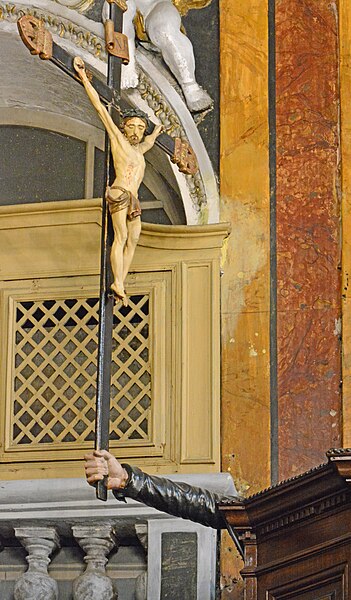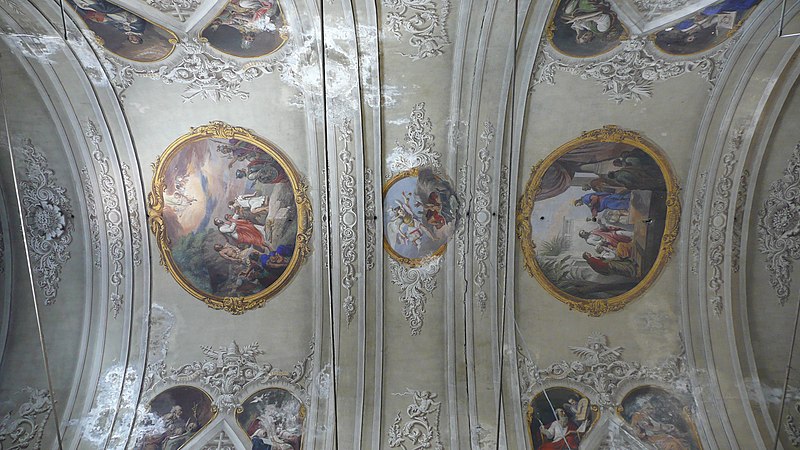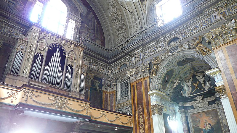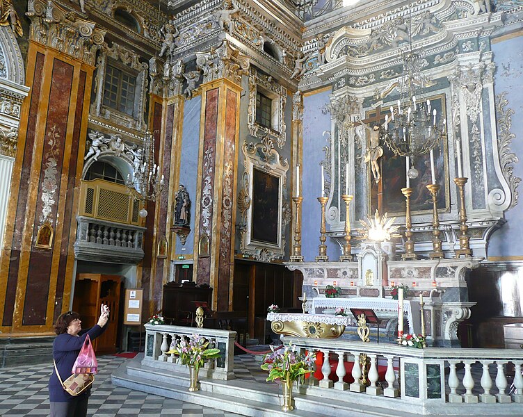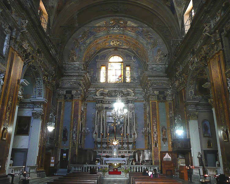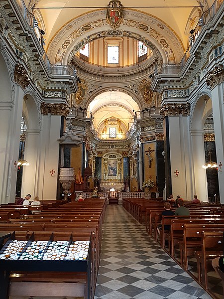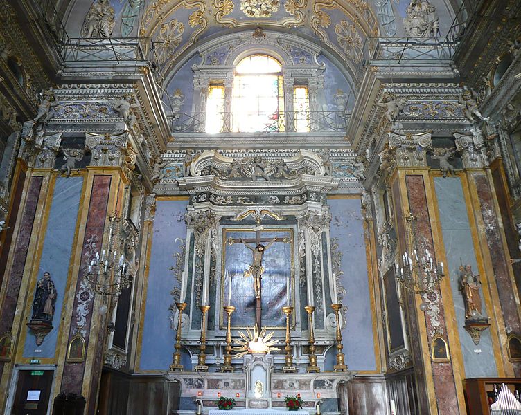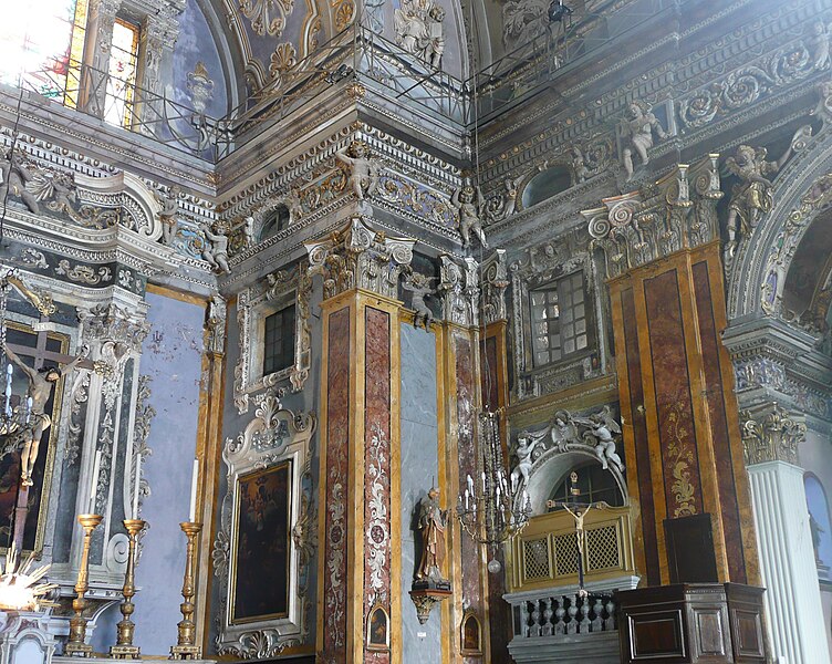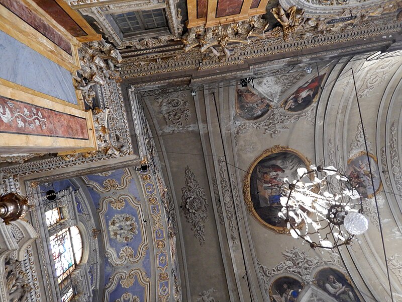La voûte de la nef s’effondra le 18 septembre 1658 devant l’évêque Palletis, qui fut blessé et mourut peu après ; les travaux reprennent en 1673 sous l’évêque Henri Provana de Leyni et sont menés à leur terme par l’architecte Marc-Antoine Grigho, le gros œuvre s’achevant entre 1680 et 1682. La décoration du chœur, commencée en 1655 par le stucateur Giovanni Pietro Riva, s’achève à la fin du XVIIe siècle, et la cathédrale est consacrée le 30 mai 1699 par l’évêque Henri Provana de Leyni.