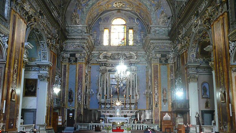 Extérieurement, l’édifice de style baroque est reconstruit sur le modèle de l’église Sainte‑Suzanne de Rome : plan en croix latine orienté à l’est, coupole à la croisée du transept ornée de tuiles vernissées à la mode génoise ; le campanile, ajouté au XVIIIe siècle, masque partiellement la coupole, et des absides latérales ont été ajoutées autour du chœur au début du XXe siècle.