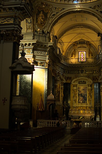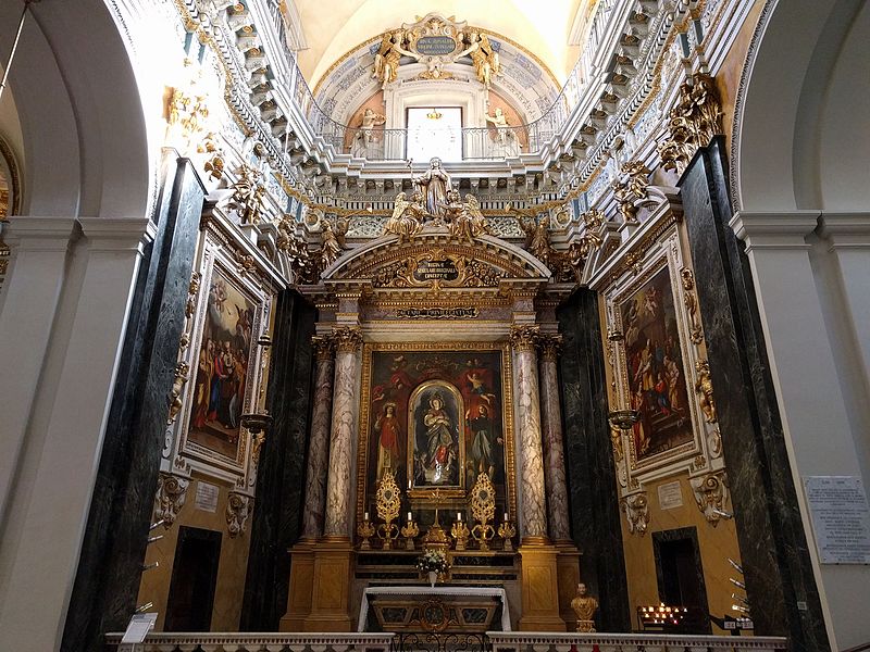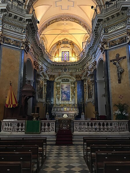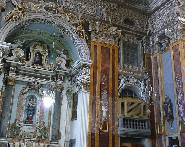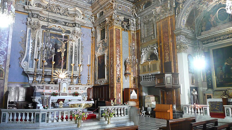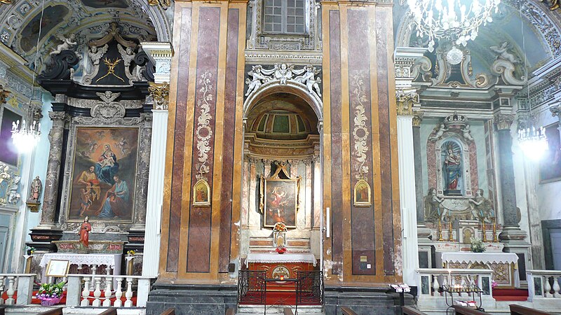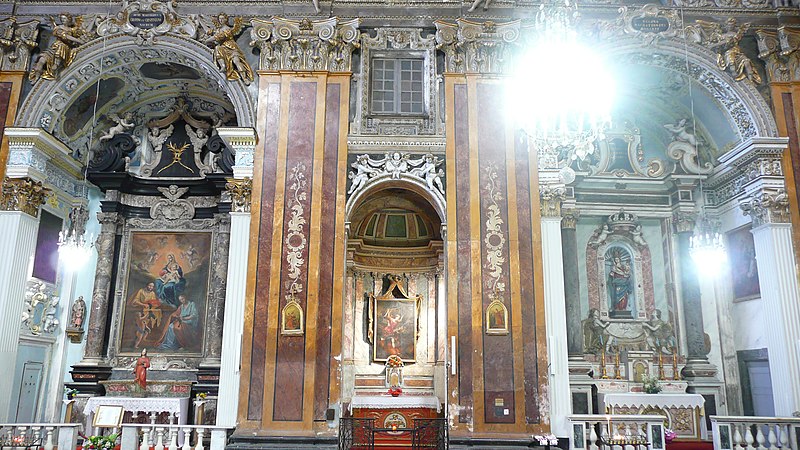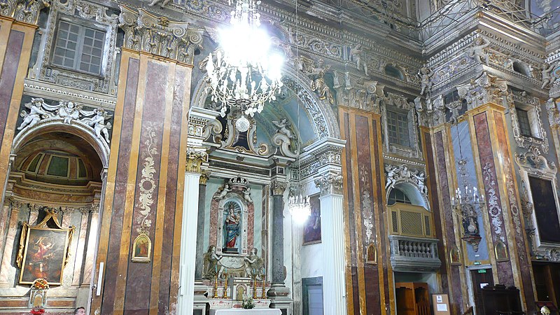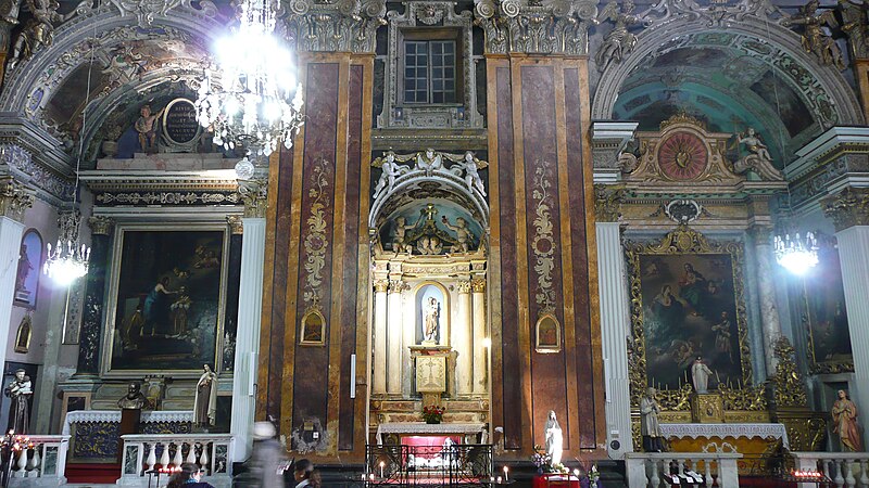 L’intérieur, également baroque, comprend dix chapelles dédiées à diverses dévotions — entre autres la Madone des Sept Douleurs, la Crucifixion, sainte Rose de Lima, saint Joseph, sainte Réparate et saint Jean‑Baptiste — chapelles qui, jusqu’à la fin du XVIIe siècle, appartenaient à des particuliers ou à des corporations chargés de leur entretien. Le maître-autel est surmonté d’une représentation de la Gloire de sainte Réparate et abrite les reliques de la sainte, conservées dans la cathédrale depuis 1690.