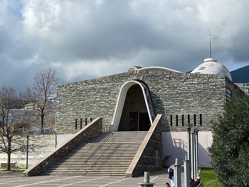 Édifiée en 1969 d'après les plans de l'architecte Louis de Casabianca, l'église s'inscrit dans le programme d'urbanisation des « grands ensembles » des quartiers sud de Bastia. L'architecte fait appel au répertoire formel alors en vogue, notamment aux paraboloïdes hyperboliques, signes de progrès technique et de modernité. Le corps principal, un volume rectangulaire en pierre, laisse jaillir au-dessus du chœur une vaste coupole coiffée d'un oculus. L'entrée principale, orientée à l'est, est précédée d'un escalier-parvis et d'un large porche ouvert, abrité par un voile parabolique. L'opposition marquée entre avant et arrière se traduit aussi par l'association de deux matériaux contrastés : béton lisse et blanc d'un côté, maçonnerie grise et rugueuse de schiste de l'autre. Le parti architectural est fortement symbolique : le béton blanc renvoie au ciel tandis que la pierre assure une assise terrestre. L'aménagement des abords faisait partie du projet initial ; le parvis n'a été réalisé qu'ultérieurement et le clocher n'a jamais été construit.