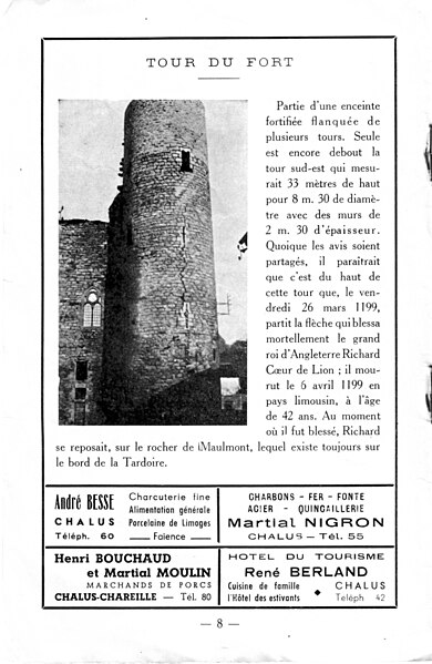 Le château de la ville basse de Châlus, dit Châlus-Maulmont ou tour du Fort, a été édifié entre 1275 et 1280 par Géraud de Maulmont (ou Maumont), conseiller de la vicomtesse de Limoges Marguerite de Bourgogne, sur des terres relevant alors de la seigneurie de Chalusset. Il s'implante sur une butte face au promontoire rocheux du château de Châlus-Chabrol, de l'autre côté de la petite vallée de la Tardoire. À l'origine, au XIIIe siècle, il formait un castrum : une demeure de prestige et de défense entourée d'un mur d'enceinte. Le logis principal est un quadrilatère de 36 mètres sur 13,60 mètres, cantonné à l'est de deux tours, l'une de 8,30 mètres de diamètre et de 33 mètres de haut, l'autre de 7,10 mètres de diamètre dont la hauteur n'est pas connue. Le corps de logis, à deux étages, communiquait avec les tours par des portes en arc légèrement brisé ; l'accès aux tours se faisait au premier étage et les étages supérieurs étaient desservis par un escalier aménagé dans l'épaisseur des murs. Pendant les guerres de Religion, la demeure fut morcelée, et au cours de la Révolution française les courtines et la tour nord-est servèrent de carrière de pierres. Le château a servi de prison d'État au XIXe siècle et fut restitué en 1850 au comte de Bourbon Busset, dont la branche cadette est dite Bourbon-Châlus. Il ne subsista de la forteresse primitive que la façade sud du logis, une partie de la façade est et la tour d'angle sud-est, qui s'est effondrée le 20 mars 1994. Cet effondrement ensevelit deux maisons, une grange et quelques véhicules mais n'occasionna ni morts ni blessés. Déjà en 1888, l'architecte-archéologue limousin Jules Tixier avait dressé un rapport très complet sur l'état de la forteresse et redoutait un effondrement considérable. Le site a été classé au titre des monuments historiques le 25 mars 1981. Il est redevenu propriété de la famille de Maulmont en 1989 et appartient aujourd'hui à la SCI de Maulmont ; il figure sur la route Richard Cœur de Lion. En 2025, Châlus-Maulmont a été sélectionné par le Loto du patrimoine pour un projet estimé à un million d'euros visant à consolider des murs et à réhabiliter l'intérieur afin d'ouvrir le site au public. Jusqu'au milieu du XXe siècle, la tradition locale attribuait à tort à Châlus-Maulmont la tour d'où serait parti le carreau d'arbalète ayant tué Richard Cœur de Lion ; les faits se déroulèrent cependant lors de l'attaque de Châlus-Chabrol en 1199.