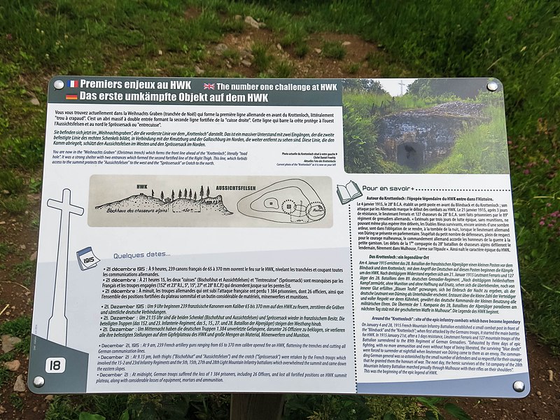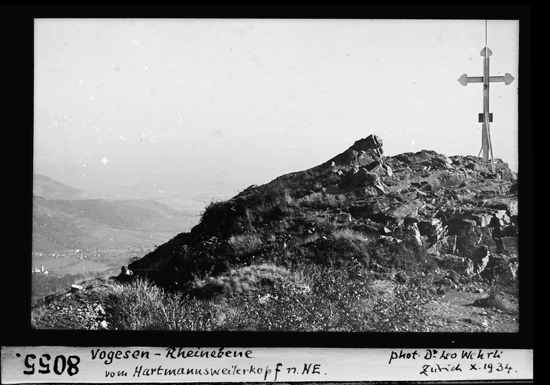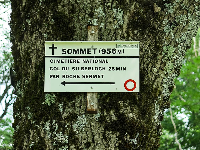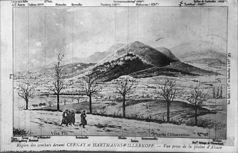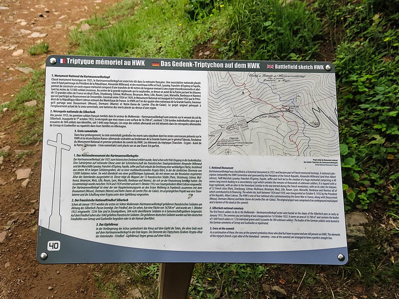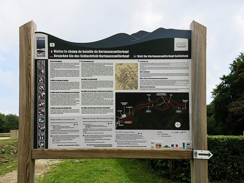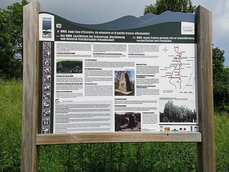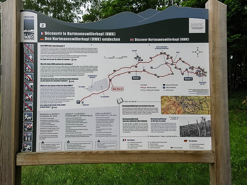 Le Hartmannswillerkopf, rebaptisé Vieil-Armand après la Première Guerre mondiale, est un éperon rocheux pyramidal du massif des Vosges qui domine la plaine d'Alsace à 957 mètres d'altitude. Il a été le théâtre de combats intenses pendant le premier conflit mondial, notamment en 1915, et accueille aujourd'hui un monument national élevé en mémoire de ces affrontements. Le sommet était alors stratégique car il se trouve en ligne à proximité de Thann et de Cernay, entre secteurs disputés par les armées françaises et allemandes. Le nom Hartmannswillerkopf associe celui du village de Hartmannswiller à la butte dite "kopf", tandis que Vieil-Armand est une francisation populaire de Hartmannsweiler, issue d'une déformation phonétique opérée par les soldats français. Le site porte aussi les surnoms de "Mangeur d'hommes" attribué par des soldats français et de "Montagne de la Mort" donné par des soldats allemands. Le sommet est partagé entre les communes de Hartmannswiller, Wuenheim, Wattwiller et Soultz. Le Hartmannswillerkopf domine la plaine rhénane entre Colmar au nord et Belfort au sud, avec Mulhouse à proximité. Il surplombe les communes de Hartmannswiller, Wattwiller, Uffholtz et Cernay. Le cimetière militaire dit du Silberloch se trouve près de la route des Crêtes des Hautes‑Vosges et le monument national comprend un promontoire‑observatoire offrant une vue sur la plaine d'Alsace et l'agglomération mulhousienne. Par temps clair, la ville de Bâle est visible, ainsi que la ligne bleue de la Forêt‑Noire — en particulier le Belchen et le Feldberg — et, par conditions exceptionnellement favorables, les Alpes bernoises, dont le Finsteraarhorn. Les principaux combats se sont déroulés en 1915, notamment les 19 et 20 janvier, le 26 mars, les 25 et 26 avril et les 21 et 22 décembre, et firent près de vingt‑cinq mille morts, en majorité français. Parmi les victimes figurent le général Marcel Serret et le capitaine Joseph Ferdinand Belmont. Après ces offensives, le front se stabilisa et se réduisit à des duels d'artillerie, ce qui valut au sommet des appellations telles que "Montagne sacrée d'Alsace". Au niveau de la croix sommitale, les lignes ennemies se trouvaient à une vingtaine de mètres l'une de l'autre, ce qui imposait une grande vigilance et limitait les possibilités d'action. Le site se compose aujourd'hui de deux entités complémentaires : le monument national, avec sa crypte et la nécropole du Silberloch, et le champ de bataille lui‑même, marqué par des vestiges et des monuments. Le monument national, construit au col du Silberloch au‑dessus de la nécropole, figure parmi les quatre monuments nationaux consacrés aux combattants de la Grande Guerre, aux côtés de l'ossuaire de Douaumont, du mémorial des batailles de la Marne et de la nécropole de Notre‑Dame‑de‑Lorette. Deux statues ailées gardent l'entrée de la crypte‑ossuaire et une statue de la Vierge se situe dans l'axe central ; ces œuvres sont signées du sculpteur Antoine Bourdelle. La nécropole nationale du Silberloch, située sur la commune de Wattwiller, couvre 1,67 hectare et rassemble 1 640 dépouilles de soldats français, dont 1 256 tombes individuelles et 384 sépultures regroupées dans six ossuaires. Sur le champ de bataille subsistent de nombreux vestiges : tranchées, abris et fortins bétonnés, ainsi que des monuments commémoratifs. Les deux monuments les plus connus sont la croix sommitale illuminée en béton armé, haute de 20 mètres, et le monument en bronze du 152e régiment d'infanterie, surnommé "monument des diables rouges", installé en 1954 pour remplacer une œuvre de 1921 détruite après l'annexion. L'emploi massif de béton armé du côté allemand contraste avec des tranchées françaises plus sommaires, traduisant la volonté défensive allemande et la logique offensive française à l'époque. De nombreux ouvrages allemands restent visibles autour du Hartmannswillerkopf, comme la tranchée de la "Suisse Lippique" ou la "cantine Zeller". Le champ de bataille et ses vestiges sont protégés au titre des monuments historiques par arrêté du 2 février 1921. Le site conserve 45 kilomètres de tranchées et un réseau de sentiers qui permettent de le visiter. Dans la perspective du centenaire de la Première Guerre mondiale, les installations ont fait l'objet d'un projet de rénovation et de mise en valeur, incluant un diagnostic du Bureau de recherches géologiques et minières sur l'instabilité des anciens souterrains et des propositions de sécurisation. Le 3 août 2014, les présidents François Hollande et Joachim Gauck se sont rendus au Hartmannswillerkopf pour une commémoration du centenaire de la Grande Guerre, première cérémonie de ce type sur ce site. Le 10 novembre 2017 a eu lieu la cérémonie inaugurale de l'historial franco‑allemand de la Grande Guerre, présidée par les présidents Emmanuel Macron et Frank‑Walter Steinmeier. Le Hartmannswillerkopf a inspiré photographes et peintres, parmi lesquels François Flameng, et le cimetière militaire apparaît dans une scène du film Jules et Jim ; un documentaire de 2004, HWK, la mangeuse d'hommes, réalisé par Daniel Ziegler, traite de la bataille.