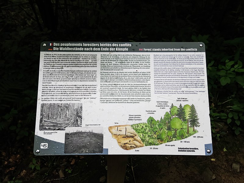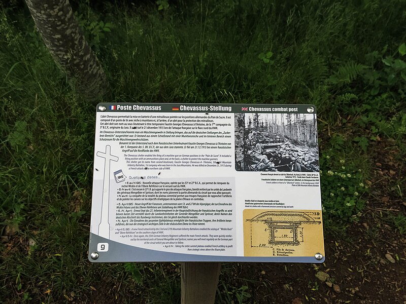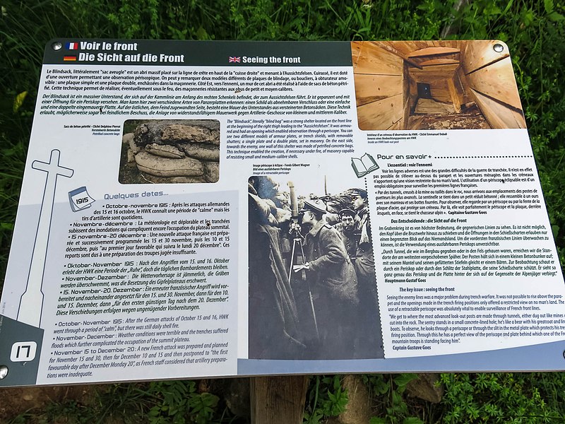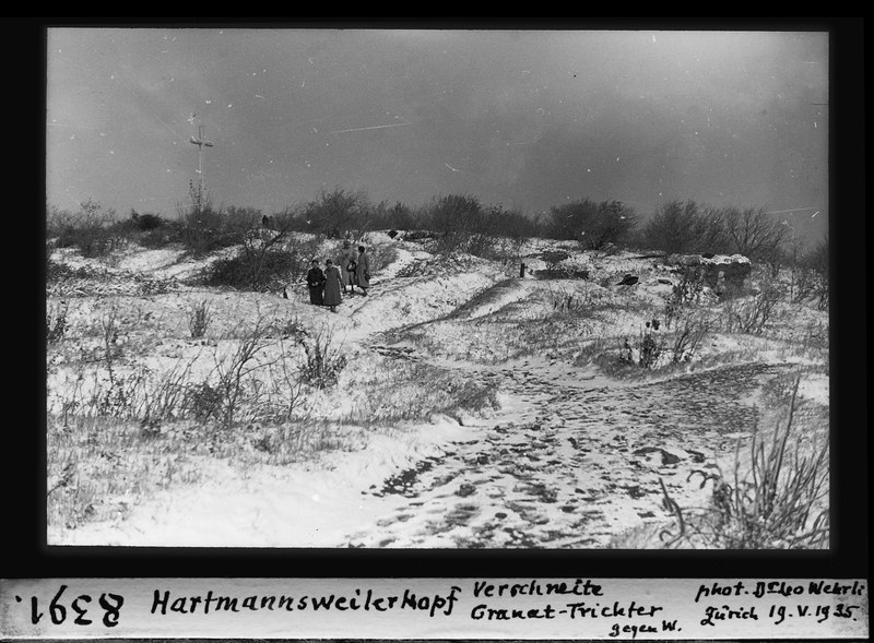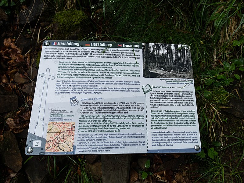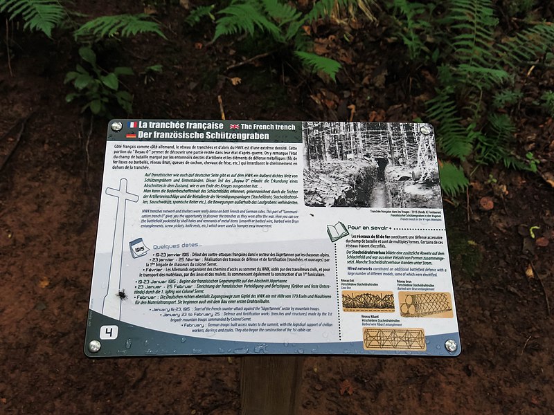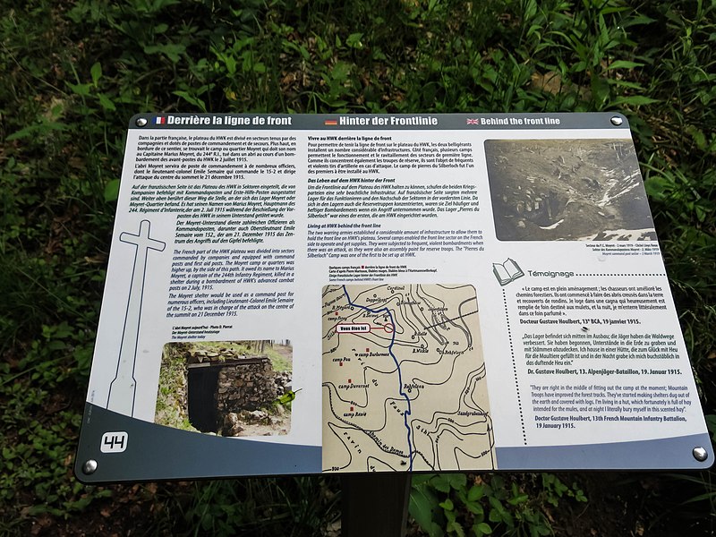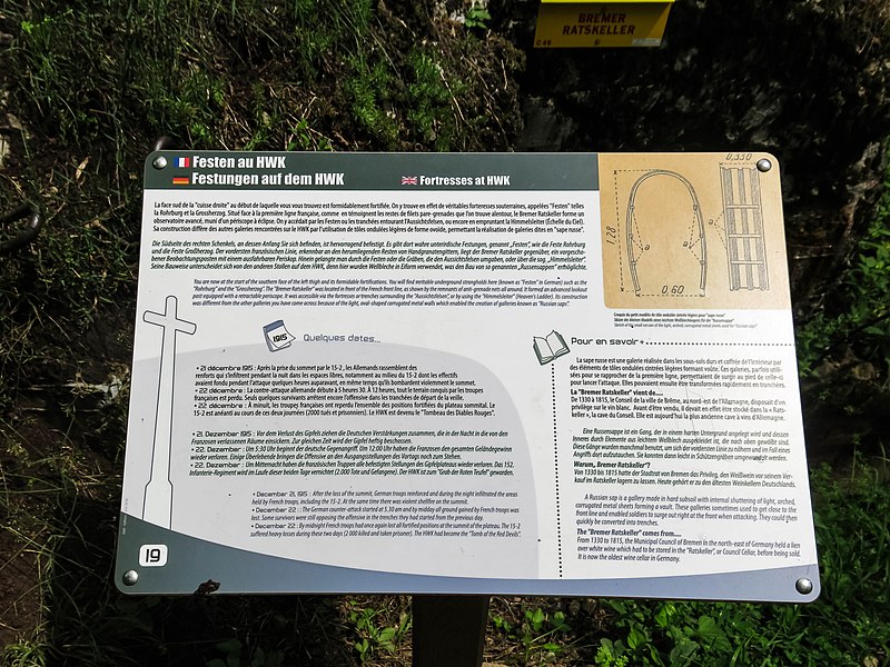 Le Hartmannswillerkopf, rebaptisé Vieil-Armand après la Première Guerre mondiale, est un éperon rocheux pyramidal du massif des Vosges qui domine la plaine d'Alsace à 957 mètres d'altitude. Il a été le théâtre de combats intenses pendant le premier conflit mondial, notamment en 1915, et accueille aujourd'hui un monument national élevé en mémoire de ces affrontements. Le sommet était alors stratégique car il se trouve en ligne à proximité de Thann et de Cernay, entre secteurs disputés par les armées françaises et allemandes. Le nom Hartmannswillerkopf associe celui du village de Hartmannswiller à la butte dite "kopf", tandis que Vieil-Armand est une francisation populaire de Hartmannsweiler, issue d'une déformation phonétique opérée par les soldats français. Le site porte aussi les surnoms de "Mangeur d'hommes" attribué par des soldats français et de "Montagne de la Mort" donné par des soldats allemands. Le sommet est partagé entre les communes de Hartmannswiller, Wuenheim, Wattwiller et Soultz. Le Hartmannswillerkopf domine la plaine rhénane entre Colmar au nord et Belfort au sud, avec Mulhouse à proximité. Il surplombe les communes de Hartmannswiller, Wattwiller, Uffholtz et Cernay. Le cimetière militaire dit du Silberloch se trouve près de la route des Crêtes des Hautes‑Vosges et le monument national comprend un promontoire‑observatoire offrant une vue sur la plaine d'Alsace et l'agglomération mulhousienne. Par temps clair, la ville de Bâle est visible, ainsi que la ligne bleue de la Forêt‑Noire — en particulier le Belchen et le Feldberg — et, par conditions exceptionnellement favorables, les Alpes bernoises, dont le Finsteraarhorn. Les principaux combats se sont déroulés en 1915, notamment les 19 et 20 janvier, le 26 mars, les 25 et 26 avril et les 21 et 22 décembre, et firent près de vingt‑cinq mille morts, en majorité français. Parmi les victimes figurent le général Marcel Serret et le capitaine Joseph Ferdinand Belmont. Après ces offensives, le front se stabilisa et se réduisit à des duels d'artillerie, ce qui valut au sommet des appellations telles que "Montagne sacrée d'Alsace". Au niveau de la croix sommitale, les lignes ennemies se trouvaient à une vingtaine de mètres l'une de l'autre, ce qui imposait une grande vigilance et limitait les possibilités d'action. Le site se compose aujourd'hui de deux entités complémentaires : le monument national, avec sa crypte et la nécropole du Silberloch, et le champ de bataille lui‑même, marqué par des vestiges et des monuments. Le monument national, construit au col du Silberloch au‑dessus de la nécropole, figure parmi les quatre monuments nationaux consacrés aux combattants de la Grande Guerre, aux côtés de l'ossuaire de Douaumont, du mémorial des batailles de la Marne et de la nécropole de Notre‑Dame‑de‑Lorette. Deux statues ailées gardent l'entrée de la crypte‑ossuaire et une statue de la Vierge se situe dans l'axe central ; ces œuvres sont signées du sculpteur Antoine Bourdelle. La nécropole nationale du Silberloch, située sur la commune de Wattwiller, couvre 1,67 hectare et rassemble 1 640 dépouilles de soldats français, dont 1 256 tombes individuelles et 384 sépultures regroupées dans six ossuaires. Sur le champ de bataille subsistent de nombreux vestiges : tranchées, abris et fortins bétonnés, ainsi que des monuments commémoratifs. Les deux monuments les plus connus sont la croix sommitale illuminée en béton armé, haute de 20 mètres, et le monument en bronze du 152e régiment d'infanterie, surnommé "monument des diables rouges", installé en 1954 pour remplacer une œuvre de 1921 détruite après l'annexion. L'emploi massif de béton armé du côté allemand contraste avec des tranchées françaises plus sommaires, traduisant la volonté défensive allemande et la logique offensive française à l'époque. De nombreux ouvrages allemands restent visibles autour du Hartmannswillerkopf, comme la tranchée de la "Suisse Lippique" ou la "cantine Zeller". Le champ de bataille et ses vestiges sont protégés au titre des monuments historiques par arrêté du 2 février 1921. Le site conserve 45 kilomètres de tranchées et un réseau de sentiers qui permettent de le visiter. Dans la perspective du centenaire de la Première Guerre mondiale, les installations ont fait l'objet d'un projet de rénovation et de mise en valeur, incluant un diagnostic du Bureau de recherches géologiques et minières sur l'instabilité des anciens souterrains et des propositions de sécurisation. Le 3 août 2014, les présidents François Hollande et Joachim Gauck se sont rendus au Hartmannswillerkopf pour une commémoration du centenaire de la Grande Guerre, première cérémonie de ce type sur ce site. Le 10 novembre 2017 a eu lieu la cérémonie inaugurale de l'historial franco‑allemand de la Grande Guerre, présidée par les présidents Emmanuel Macron et Frank‑Walter Steinmeier. Le Hartmannswillerkopf a inspiré photographes et peintres, parmi lesquels François Flameng, et le cimetière militaire apparaît dans une scène du film Jules et Jim ; un documentaire de 2004, HWK, la mangeuse d'hommes, réalisé par Daniel Ziegler, traite de la bataille.