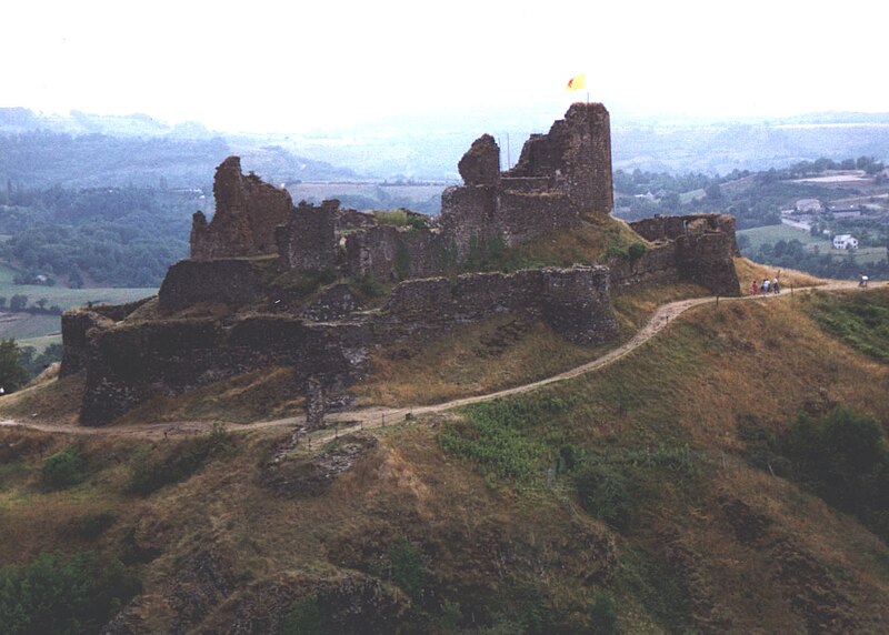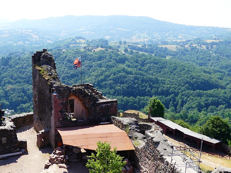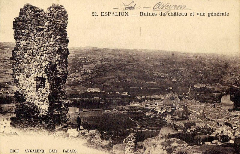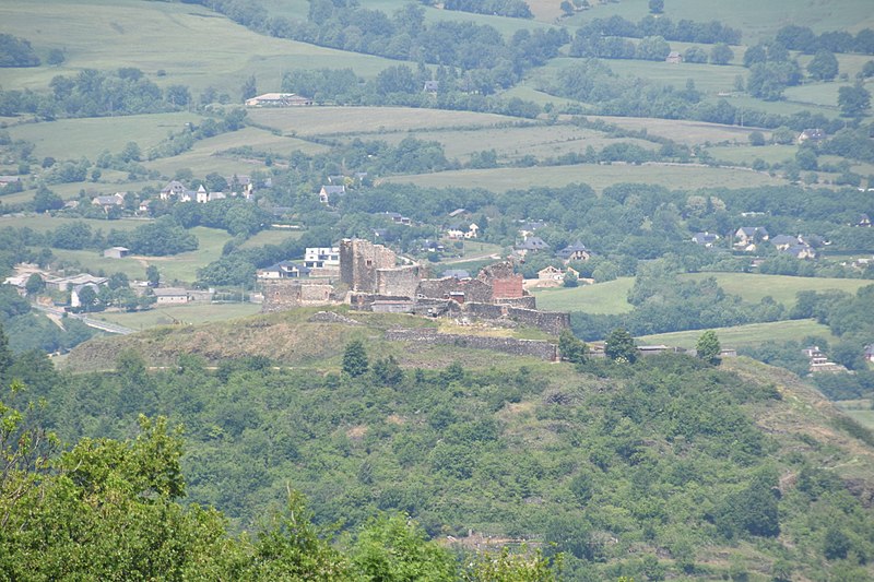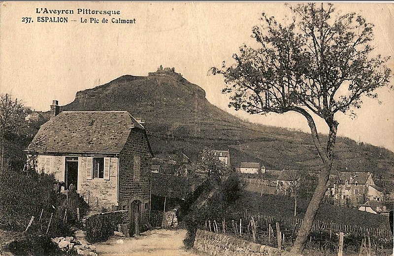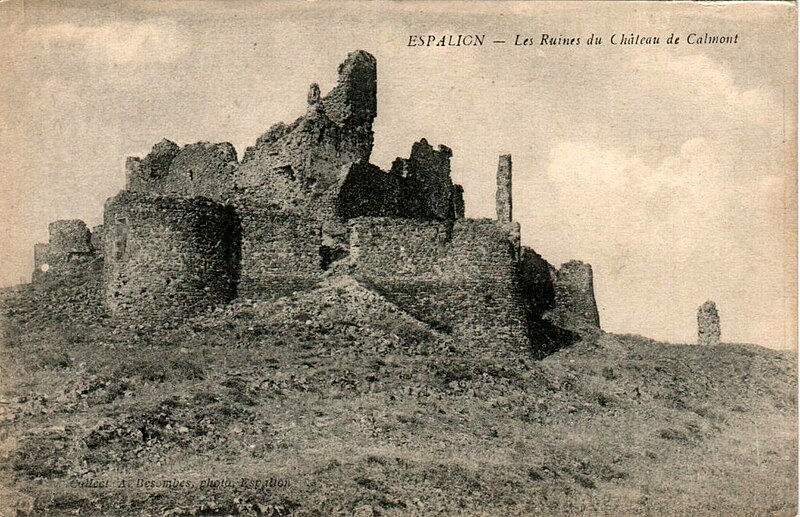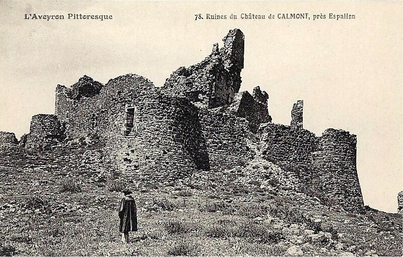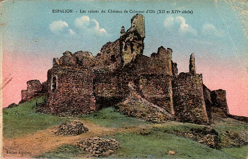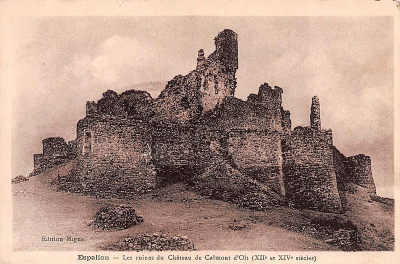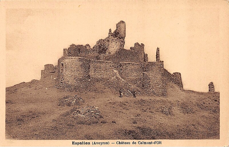 Perché sur un dyke basaltique à 535 mètres d'altitude, le château de Calmont-d'Olt domine la ville d'Espalion et la vallée du Lot d'environ 200 mètres. Un premier château féodal est attesté vers le IXe siècle ; il est ensuite transformé et développé entre le XIe et le XIVe siècle. Le noyau primitif, de plan trapézoïdal, comportait au XIe-XIIe siècle un donjon placé au point le plus élevé, une grande salle et un mur d'enceinte. Au XVe siècle, le site fait l'objet d'aménagements défensifs importants : une enceinte basse est bâtie et flanquée de huit tours « ouvertes à la gorge », tandis que l'enceinte haute conserve le donjon, le corps de logis et deux tours. Une porte orientale donnait accès à la chapelle castrale, située hors de l'enceinte ; de cette chapelle du XIIe siècle subsiste un pan de mur. Le château occupe une position stratégique et symbolique sur la vallée du Lot ; il commandait la route de Rodez vers l'Aubrac et le franchissement du Lot sur l'axe commercial Toulouse–Rodez–Lyon. La seigneurie de Calmont d'Olt, d'origine probablement carolingienne et mentionnée pour la première fois en 883, a donné son nom à la viguerie locale. La famille de Calmont d'Olt, qui domine le site pendant le haut Moyen Âge, s'éteint avec Raimond de Calmont d'Olt, évêque de Rodez ; la baronnie passe ensuite aux Pelet, aux Castelnau, aux Caylus, aux Clermont-Lodève puis aux d'Albert de Luynes. Le château illustre la mutation architecturale des sites castraux du Rouergue entre le XIe et le XVe siècle, liée aux progrès techniques de la guerre médiévale. Après son renforcement au XVe siècle, l'édifice connaît peu de transformations majeures puis, au XVIIe siècle, il est abandonné au profit de demeures plus confortables dans la vallée et sombre peu à peu en ruine. Les sources signalent ensuite plusieurs états des lieux et événements jusqu'aux XVIIIe et XIXe siècles, périodes où l'on relève notamment des occupations temporaires et des représentations du château en ruine. Le site est inscrit au titre des monuments historiques le 24 décembre 1943 ; le château est inscrit le 28 mai 1990 et, le 10 février 1992, le château, les vestiges de la chapelle et la deuxième enceinte sont classés au titre des monuments historiques. Racheté en 1987 par Thierry Plume, le château fait l'objet d'une restauration progressive, conduite avec le concours des Bâtiments de France, du Service régional de l'archéologie et de bénévoles. Des travaux de dégagement réalisés en 2006 ont mis au jour une clé de voûte et une triple arcature romane faisant jour, éléments qui permettent de situer une phase de construction au XIe ou au XIIe siècle. Aujourd'hui, les vestiges du donjon en basalte, des enceintes et de la chapelle témoignent de l'évolution du site du haut Moyen Âge au bas Moyen Âge et de son rôle militaire dans la région.
