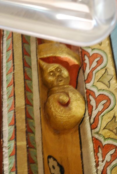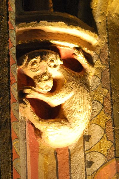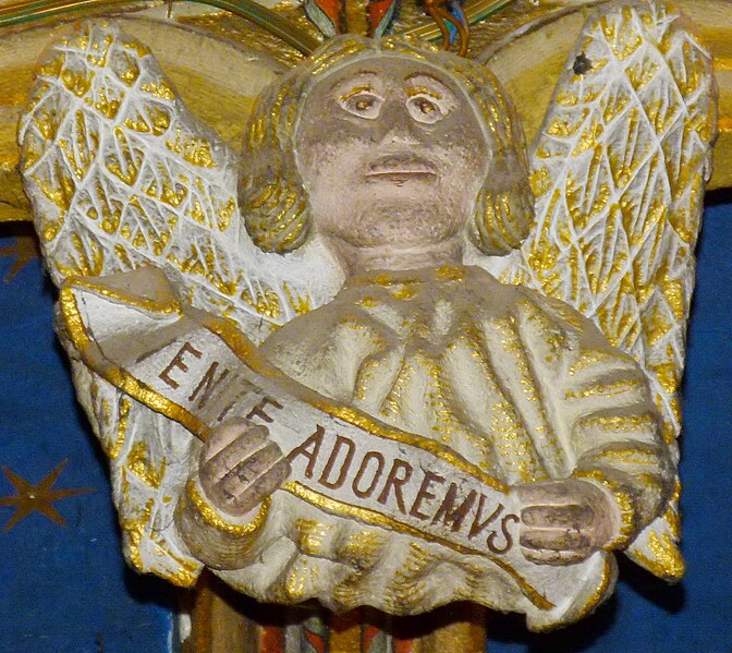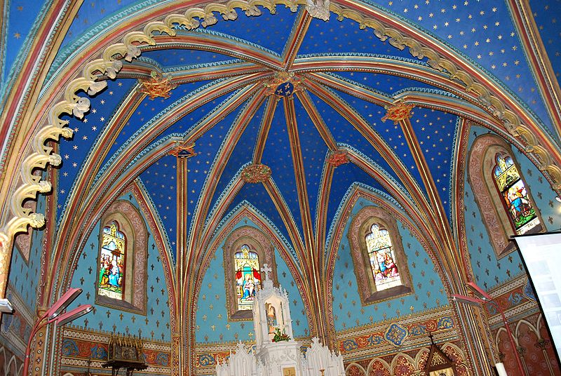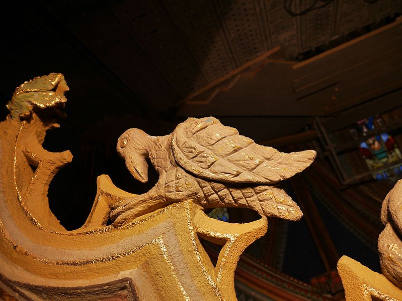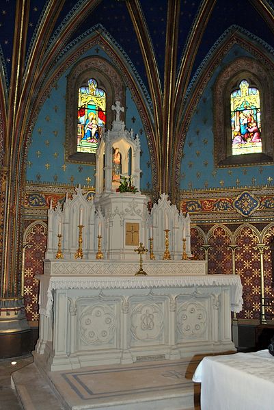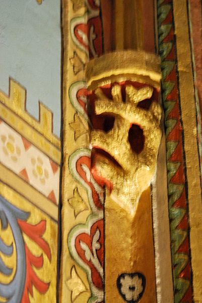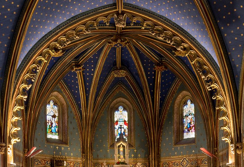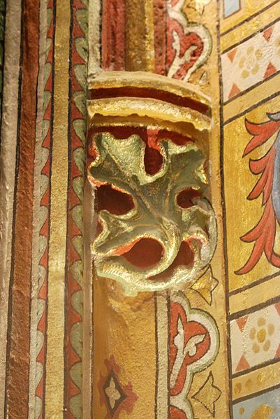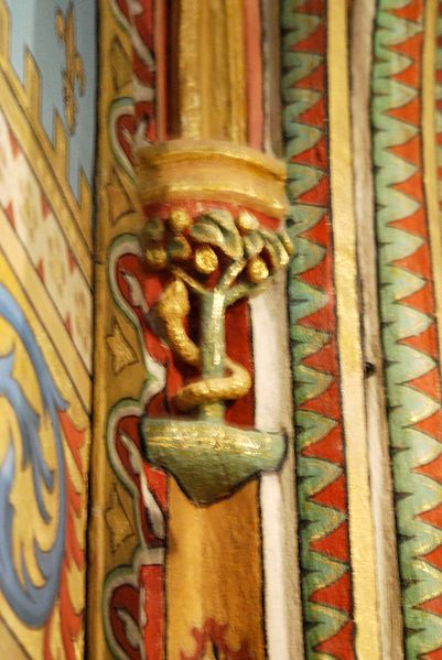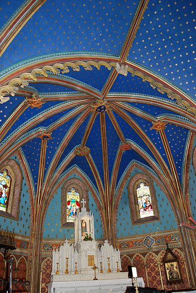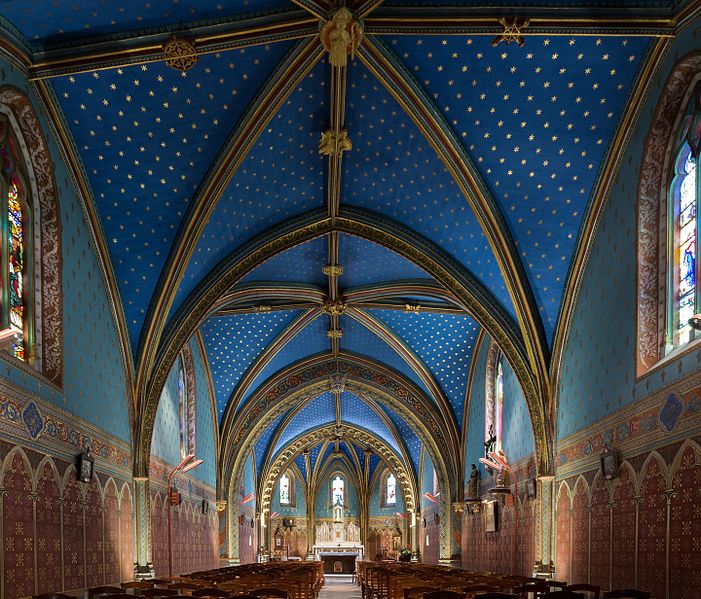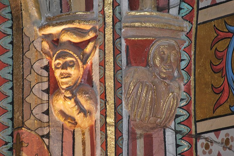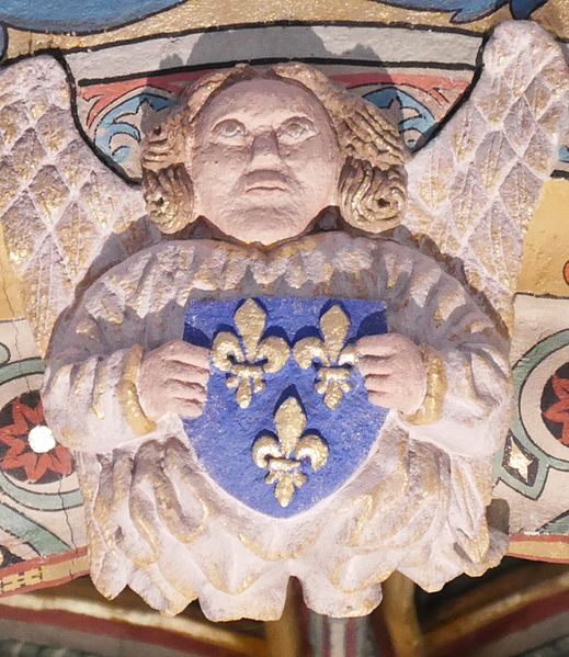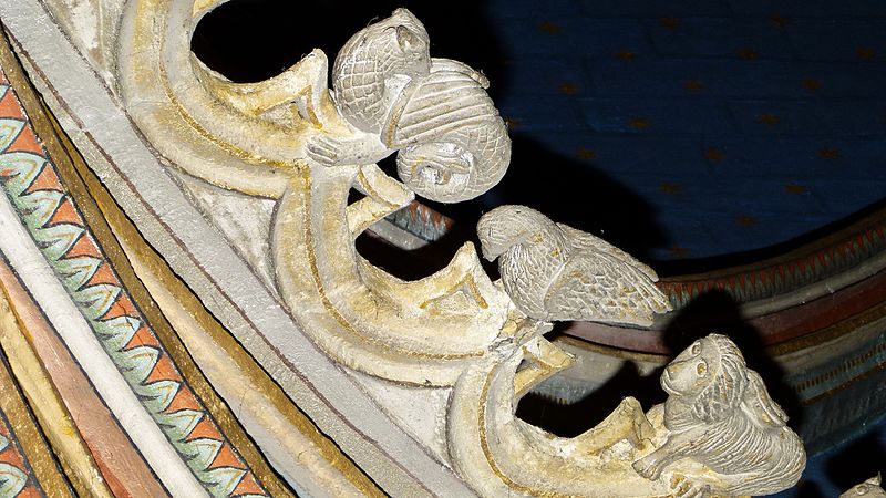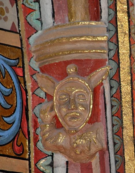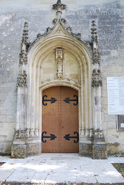 La richesse sculptée intérieure est notable : keystones représentant les armes de France, la Vierge à l’Enfant, un évêque portant crosse et mitre, l’Agnus Dei, ainsi que fleurons végétaux ; l’arc triomphal et les retombées sont ornés de festons, d’animaux fantastiques et de figures symbolisant vertus et vices. On y relève aussi de nombreux motifs animaliers et grotesques, Adam et Ève avec le serpent, un avare avec sa bourse, et divers mascarons et feuilles sculptées.