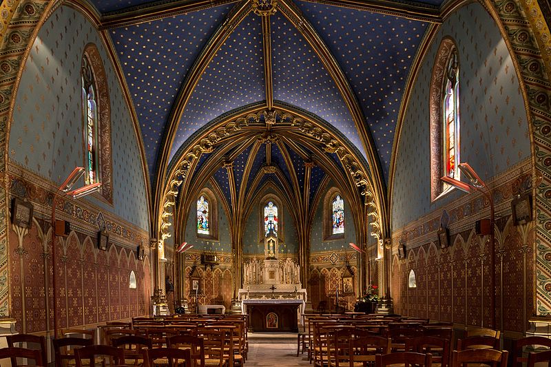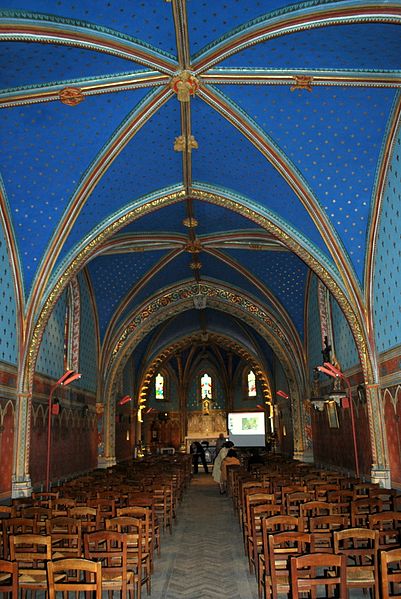 L’édifice se compose d’une nef et d’un chœur d’environ 31,75 m de longueur sur 7,30 m de largeur, divisés en quatre travées qui augmentent légèrement de longueur à mesure qu’elles se rapprochent du sanctuaire, créant un effet d’optique depuis l’entrée. Ces travées sont délimitées par des arcs ogivaux en plein cintre brisé et couverte par des voûtes à croisée d’ogives ; le chœur et la travée d’entrée présentent des liernes et des tiercerons. Les clefs de voûte, les points de jonction des nervures et les culs-de-lampe portent des écussons, fleurons et figures sculptées, et un escalier à vis est logé à l’angle nord‑ouest.
