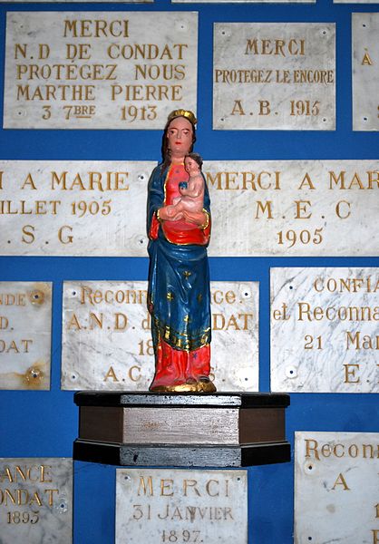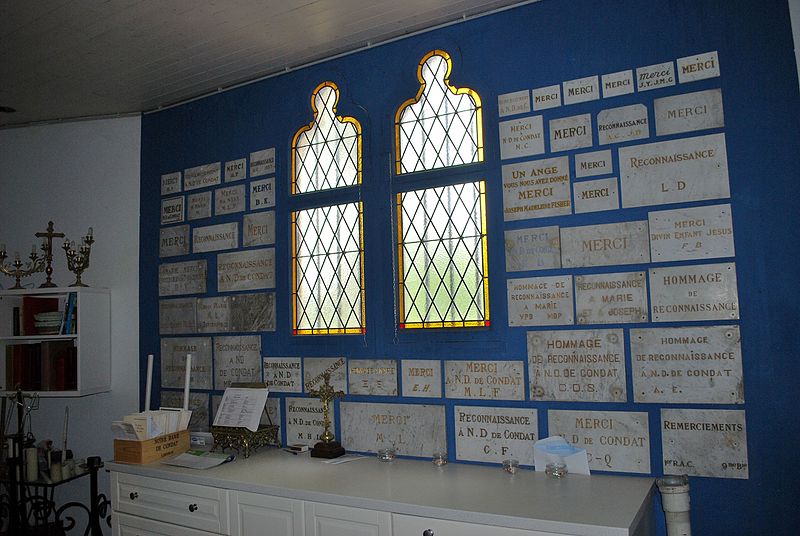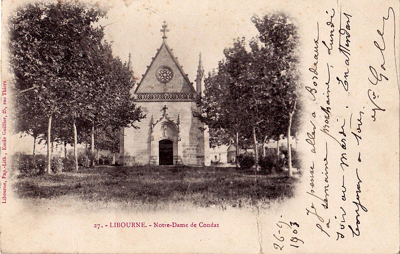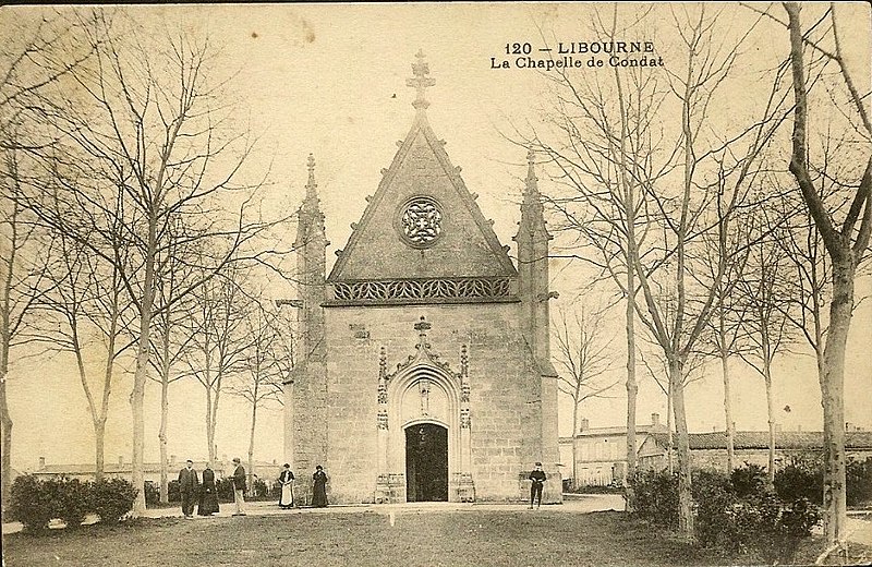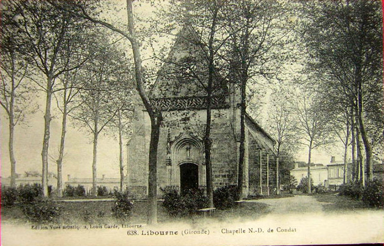 La chapelle de Condat se trouve au lieu-dit Condat, à un kilomètre et demi au sud‑est de Libourne, sur la rive droite de la Dordogne à l’entrée d’une presqu’île. Elle est le seul élément subsistant d’un château rasé par les soldats de Charles VII et, située à l’extérieur de la forteresse, servait aux châtelains comme aux tenanciers, serfs et habitants des environs. Les parties les plus anciennes paraissent remonter au XIe siècle ; l’édifice a été restauré et agrandi dans la seconde moitié du XVe siècle, probablement par Charles de Berry, et présente un style de transition entre le gothique et la Renaissance. Vendue comme bien national à la Révolution puis détournée de sa fonction religieuse, elle fut rachetée par la famille Piola en 1865, rendue au culte après une restauration et rendue au public en 1868. La chapelle a été inscrite au titre des monuments historiques par arrêté du 24 décembre 1925 et donnée plus tard à l’évêché de Bordeaux.