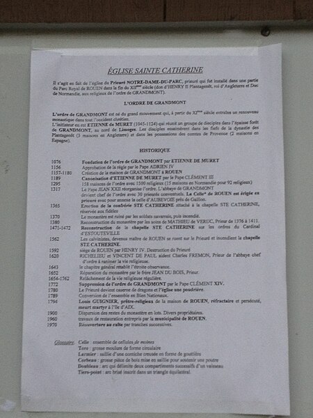 Le prieuré Notre-Dame-du-Parc, dit prieuré de Grandmont ou prieuré de Grammont par les Rouennais, a été fondé entre 1157 et 1180 par l'ordre de Grandmont, originaire du Limousin. En 1317, le pape Jean XXII réorganise l'ordre et charge Grandmont de la direction de trente prieurés conventuels ; la cella de Rouen est cette année-là érigée en prieuré et accueille quatorze religieux. Le prieuré est ruiné et incendié par des soldats navarrais en 1370, puis reconstruit par le prieur Matthieu de Veruc en 1380. Au XVe siècle, le cardinal d'Estouteville, prieur commendataire, fait édifier en 1471-1472 la chapelle latérale Sainte-Catherine au côté nord de l'église, chapelle qui est détruite en 1562 par les huguenots. En 1547, le prieur commendataire Étienne Pourret, évêque de Bayonne, fait réparer le cloître. Lors du siège de Rouen par Henri IV en 1592, le prieuré est partiellement détruit ; il abrite alors quatre prêtres, un convers et deux novices qui doivent évacuer les lieux, le convers restant pour garder les murs. La vie religieuse reprend vers 1620 à l'époque de saint Vincent de Paul, la stricte observance est rétablie par le chapitre général de 1643 et le prieuré est réparé en 1652 ; en 1670 on y compte treize religieux, dont trois étudiantes à Paris. L'ordre de Grandmont est supprimé en 1772 par le pape Clément XIV, le domaine devient caserne de dragons et en 1780 l'église est transformée en magasin de poudre. Les restes du prieuré sont dispersés en 1900 et seule subsiste l'église.