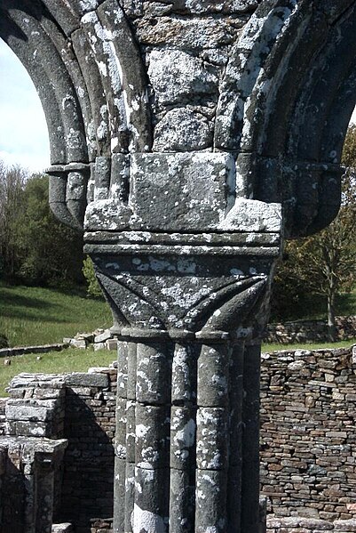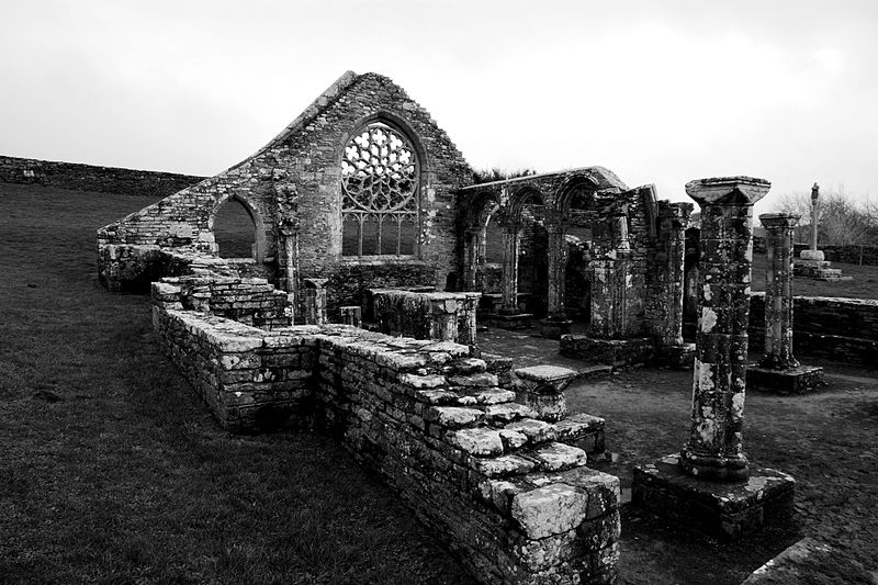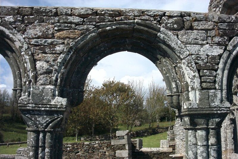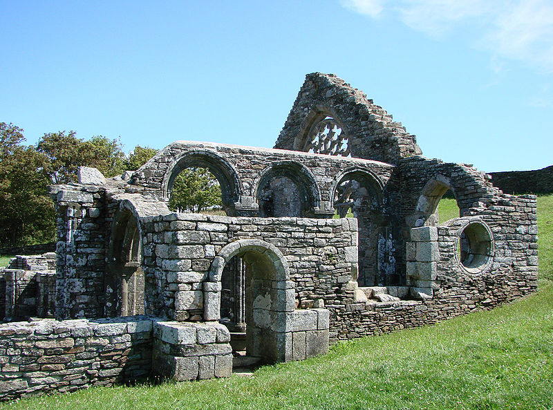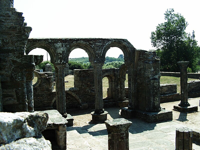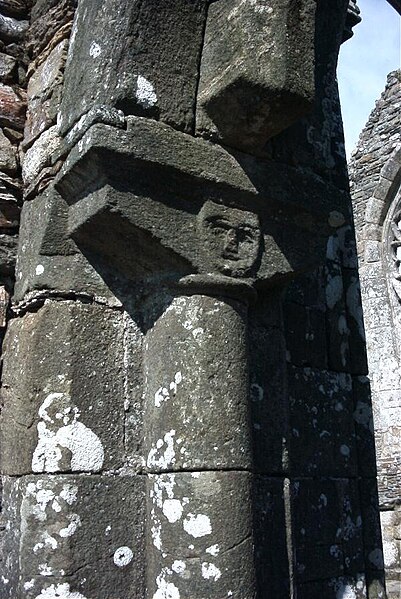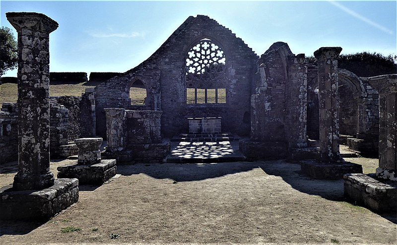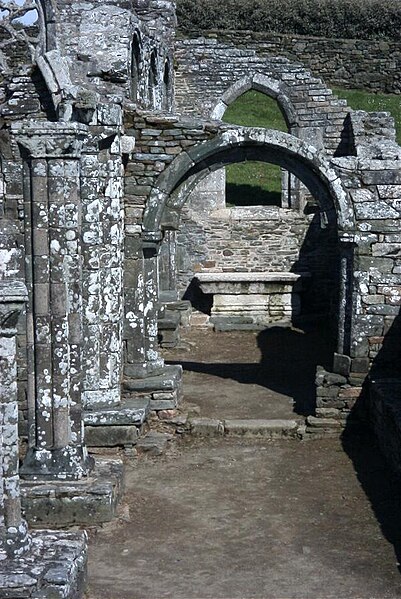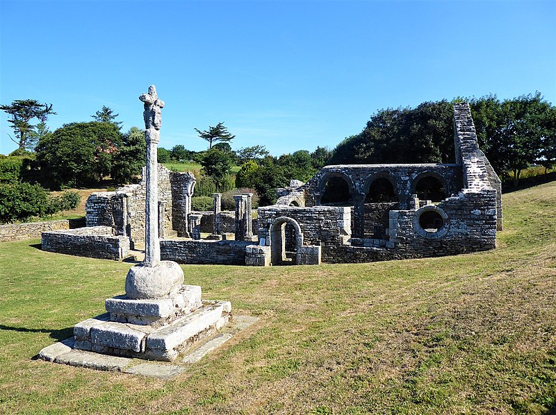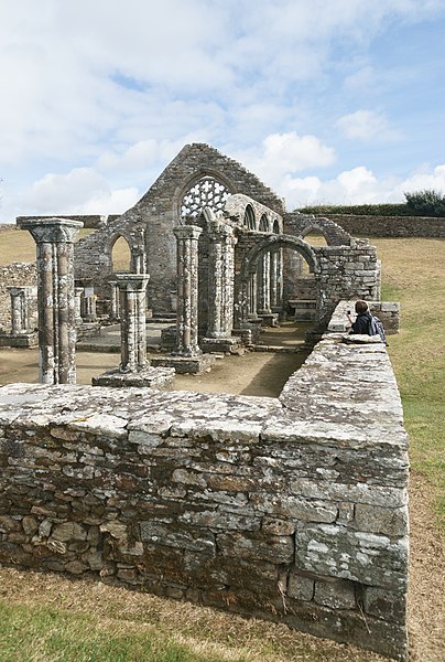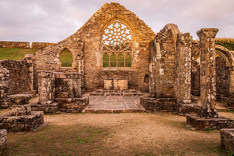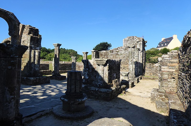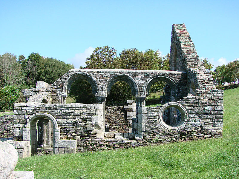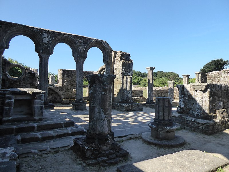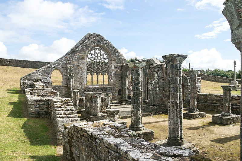 À l'intérieur, le chœur, mieux conservé que la nef, comprend trois vaisseaux sur trois travées et conserve les grandes arcades sud en place ; ces arcades, avec leurs fûts à colonnettes, chapiteaux et culots d'encorbellement, sont très proches stylistiquement de celles de Notre-Dame de Roscudon. Les grandes arcades nord n'ont conservé que leurs socles et plusieurs piliers ont été remontés de façon approximative lors de restaurations anciennes, entraînant un mélange des éléments. L'arc diaphragme, aujourd'hui disparu, reposait sur deux piles massives et était contrebuté par des arcs transversaux dans les collatéraux, ce qui indique qu'il devait soutenir un clocher central disparu ; un chancel fermait probablement cette séparation.