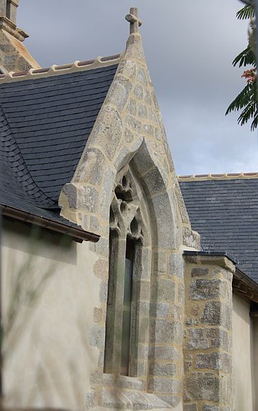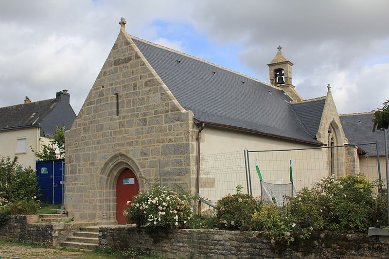 La chapelle de Locmaria, aussi appelée Notre-Dame-de-Bonne-Nouvelle, se situe rue de la Côte au bourg de Nostang (Morbihan). Elle tient ses origines d’une ancienne aumônerie de l’ordre de Saint-Jean de Jérusalem, mentionnée au XIIe siècle, puis passe au XIIIe siècle sous la dépendance de l’abbaye Notre-Dame de la Joie ; l’édifice est reconstruit au XVe siècle. De plan en Tau, la chapelle présente deux nefs désaxées séparées par un mur diaphragme surmonté d’un clocheton ; la nef haute est entièrement peinte au XVe siècle, avec des personnages figurés sur fond d’arabesques et une danse macabre probablement liée au dit des Trois morts et des Trois vifs ; une Annonciation se trouve dans l’ancienne chapelle nord. Les chartes de 1308 évoquent le village sous les noms de « Locmaria de Laustence » et « Notre-Dame de Laustenc ». À la fin du XVIIe siècle, alors que la première église de Nostang tombe en ruine, les offices paroissiaux y sont célébrés entre 1681 et 1685. Au XVIIIe siècle, l’ancien clocher est remplacé. À une date indéterminée, le bras nord du transept, à l’origine ouvert comme le bras sud, est partiellement obturé et une porte y est aménagée ; la nef a par ailleurs été rallongée d’une ferme et la façade ouest semble avoir été déplacée. En 1981, l’atelier Hubert de Sainte-Marie restaure et remplace quelques fragments de vitraux dans le quadrilobe et les lancettes de la baie axiale ; d’après les sources, l’ordre des pièces de verre aurait été modifié lors de cette intervention. Au centre de la verrière restaurée apparaît le visage du Christ ; dans le lobe supérieur figure un écu d’azur au chevron d’argent autrefois accompagné de trois billettes d’or — l’une a été perdue — attribut de la famille Botdéru ; le lobe droit porte un écu losangé mêlant les armes de la Bretagne et de la France, le lobe inférieur les armoiries de la Bretagne, tandis que le lobe gauche reste non identifié. Le mur méridional de la nef est démoli puis reconstruit en 1992 ; en 1994 le lambris de la partie ouest de la nef est démonté puis remonté, et cinq ans plus tard la toiture et la charpente de cette nef sont refaites. Le transept nord fait l’objet d’une restauration en 2001 ; une campagne de restauration supplémentaire est jugée nécessaire dès 2013. La chapelle fait l’objet d’un classement au titre des monuments historiques depuis le 29 avril 2005. La fresque du XVe siècle dite « des Trois morts et des Trois vifs » représente trois morts sortant des tombes et s’adressant à trois cavaliers pour les mettre en garde ; le texte met en regard les paroles des vivants — « Nous sommes en gloire et honneur. Remplis de tous biens et chevance. Au monde, mettons notre cœur. En y prenant notre plaisance. » — et la réponse des morts — « Nous avons bien esté en chance. Comme vous estes présent. Mais vous viendrez à notre danse. Comme nous sommes maintenant. » — seuls les trois morts restent encore visibles, la fresque étant très dégradée.