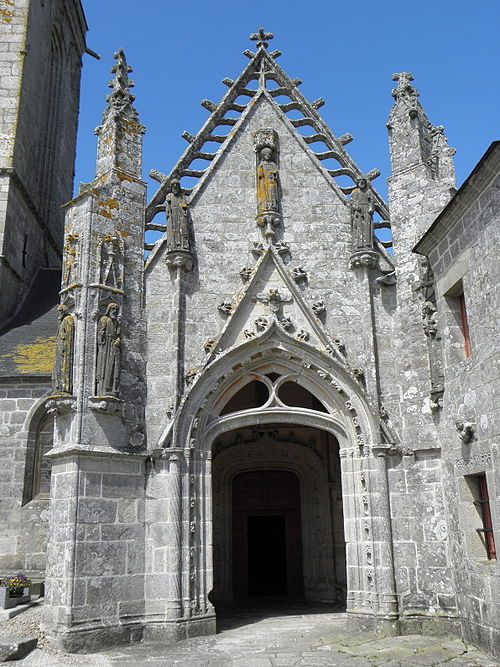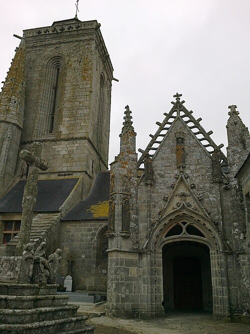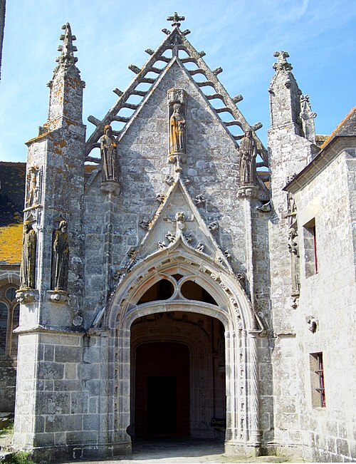 La chapelle Saint-Tugen, située à Saint-Tugen en Primelin (Cap Sizun, Finistère), est un édifice des XVIe et XVIIe siècles inscrit comme monument historique en 1909 ; son placître et sa porte triomphale le sont en 1963. Saint Tugen, ou Tujan, recteur de Brasparts et deuxième abbé de Daoulas, est représenté en abbé mitré tenant la crosse et la clef de saint Pierre, relique associée à son pouvoir thaumaturgique contre la rage, puis par extension contre les rages de dents. Le sanctuaire fut longtemps lieu de pèlerinage et de pardons : on venait par milliers de Cornouaille, du Trégor ou du Vannetais pour invoquer le saint, faire bénir et acheter de petites clefs apotropaïques en plomb, et participer au grand pardon de juin. La tradition rapporte aussi des pratiques rituelles particulières, comme le percement de pains avec une clef attribuée à saint Tugen et l'usage de ces pains pour éloigner les chiens présumés enragés, ainsi que la vente des clefs lors du pardon. Au début du XXe siècle la presse signalait l'état dégradé de la chapelle et des travaux de restauration entrepris pour préserver l'édifice, qui devint ensuite, au fil du XXe siècle, un événement plus touristique mais toujours fréquenté lors du pardon de juin. L'enclos se compose d'un placître accessible par cinq échaliers et deux entrées : une porte triomphale ogivale côté sud, richement sculptée et surmontée d'un Christ aux liens, et une porte plus simple à l'ouest. Le calvaire ancien fut détruit vers 1794 ; le socle et des sculptures réemployées subsistent au sud du placître, reposant sur degrés et présentant bas-reliefs, une inscription liée à la conception du nouveau calvaire et plusieurs statues dont une Vierge de pitié et une figure de saint tenant une clef. La chapelle, massive, mesure environ vingt-neuf mètres de long sur vingt-huit de large et se développe dans un vaste enclos ; sa présence comme trève est attestée dès 1118 et son statut fut confirmé aux XVe et XVIe siècles, dépendant jadis de plusieurs manoirs et villages et desservie par plusieurs chapelains. Les travaux menés entre le XVIe et le XVIIIe siècle ont donné à l'édifice sa physionomie actuelle : élévation de la tour, adjonctions de transepts et chapelles, sacristie et remaniements successifs, reflétant la prospérité maritime locale et l'engagement des marins. Les murs extérieurs portent des bas-reliefs dits « vaisseaux de pierre », sculptés par des marins pour affirmer leur participation financière à la construction. La tour carrée occidentale, haute d'environ vingt-huit mètres, joue le rôle de clocher et reprend un langage architectural inspiré des tours quimpéroises avec baies étroites, fausses arcatures, corniche à modillons, gargouilles et balustrade ; elle est flanquée de tourelles dont l'une abrite un escalier à vis et une galerie flamboyante. Le portail occidental et le portail méridional montrent l'influence de l'atelier de Quimper : gables ornés, choux frisés, pinacles, niches abritant les évangélistes et sculptures accompagnées de phylactères où l'on lit des inscriptions liturgiques. Le porche méridional, monumentale travée voûtée, présente un tympan sculpté où saint Tugen tient la clef, des contreforts à niches et pinacles et un décor de colonnettes et d'arcatures très travaillées, en lien avec d'autres portails régionaux. La statuaire extérieure en kersanton s'inscrit dans le style du maître de Plougastel : visages ronds et sévères, plis structurés des vêtements ; plusieurs têtes mutilées ont été restituées en 1996 par l'atelier Le Floc'h, et de nombreuses statues sur les contreforts et sous le porche représentent apôtres, saints et scènes évangéliques. À l'intérieur, la tour comporte des pièces latérales datées et inscrites, et la nef se compose de quatre travées aux arcades ogivales irrégulières, avec une voûte ogivale en bois dont les sablières sont richement sculptées de personnages, scènes de pêche, grotesques et armoiries. Le chœur, autrefois fermé par un jubé dont il subsiste des vestiges, est éclairé par une verrière en verre blanc et conserve une dalle funéraire des seigneurs de Leuzerec. Le baptistère monumental, situé dans le bas-côté, est clos par une balustrade en bois datée de 1705 et décoré de peintures représentant mariage, baptême, confession et confirmation, avec des inscriptions précisant les donateurs et les dates. Le catafalque, installé en 1642, et la chaire en chêne datée de 1766, surmontée d'un ange sonnant de trompette, font partie des mobiliers remarquables, tout comme les litres funéraires peintes autour de la nef qui témoignent de la prééminence de la famille du Ménez. Les armoiries et devises des familles prééminencières—du Ménez de Lézurec, Gourcuff, Aultret de Lezoualc'h, Brézal, Bouilly de Trébry, Keridiern, Saluden de Kernysan et Penfentonio—figurent sur pierres, retables et éléments de la voûte, rappelant les fondateurs et donateurs. Quatre retables subsistent : le maître-autel baroque du chœur, richement composé et abritant entre autres saint Primel, saint Jean et saint Tugen ; le retable du Rosaire réalisé pour la confrérie et orné d'un tableau du XIXe siècle ; le retable de sainte Barbe réemployant une statue du XVIe siècle ; et le retable de la Vierge en trois niveaux, avec statues et bas-reliefs consacrés à la Trinité. De nombreuses statues d'applique et de procession, des ex-voto maritimes, et une vitrine d'orfèvrerie témoignent de la vie de dévotion et de la richesse passée du sanctuaire ; y figurent notamment un calice d'exception attribué à l'orfèvre morlaisien François Lapous, une patène médiévale et un étui en argent pour la clef de saint Tugen portant le poinçon de René Blanchet. Les sablières, blochets et culots présentent un bestiaire et des motifs parfois fantastiques—barques, masques, figures h