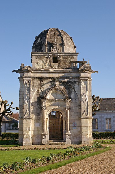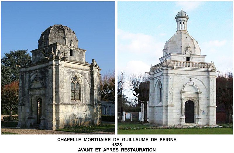 La chapelle de Seigne, dite chapelle Jehan de Seigne, est une ancienne chapelle funéraire située à Bléré (Indre‑et‑Loire). Élevée en 1526 sur un terrain qui accueillera au XVIIIe siècle le cimetière communal, elle est dédiée à saint Jean‑Baptiste. Classée au titre des monuments historiques en 1875, la chapelle a fait l'objet d'une restauration complète en 2020. Elle se dresse place de la République, au sud‑est du cœur de la ville, à l'angle de l'avenue du 11‑novembre‑1918 et de l'avenue Carnot. Orientée ouest‑est, elle s'ouvre à l'ouest. La tradition attribue la construction à Jehan de Seigne pour recevoir le tombeau de son père Guillaume, mort en 1526 ; Jehan n'ayant que douze ans cette année‑là, il est probable que Guillaume ait lui‑même pris l'initiative de l'édifice. Lors du déplacement du cimetière de Bléré en 1776, la chapelle est signalée en ruine, dépourvue de son autel et de ses tombeaux. La restauration de 2020 a notamment reconstruit le lanternon qui coiffait le dôme et avait disparu avant 1890, puisqu'il n'apparaît pas sur des photographies de Séraphin‑Médéric Mieusement prises cette année‑là. La chapelle comprend une unique travée sur plan carré, prolongée par une abside semi‑circulaire. Un portail Renaissance en anse de panier, soutenu par des colonnettes, ouvre la façade ouest. Le riche décor de l'anse de panier ne comporte aucun motif religieux mais des projectiles enflammés et des boulets, rappelant la fonction de Guillaume de Seigne comme trésorier général de l'ordinaire de l'artillerie du roi ; la clé conserve des traces de peinture polychrome. Les faces nord et sud sont percées d'une baie flamboyante, et l'abside est éclairée par trois baies identiques. Le corps principal est couronné d'un dôme octogonal désormais surmonté du lanternon restitué en 2020. Les gargouilles disposées aux angles, au niveau de l'entablement à la base du dôme, sont des ajouts du XIXe siècle. L'iconographie et la documentation comprennent des vues générales de 1890 et de 2011, des détails du portail, des images de l'intérieur de l'abside, des photographies des gargouilles et des éléments décoratifs entreposés dans la chapelle.