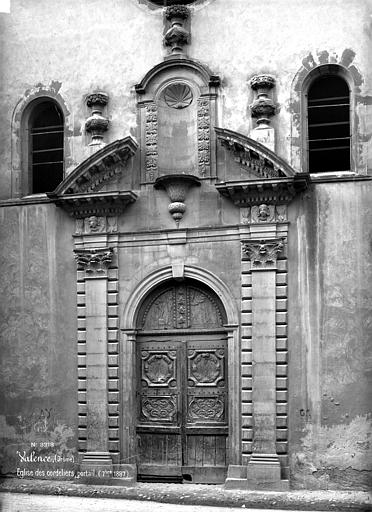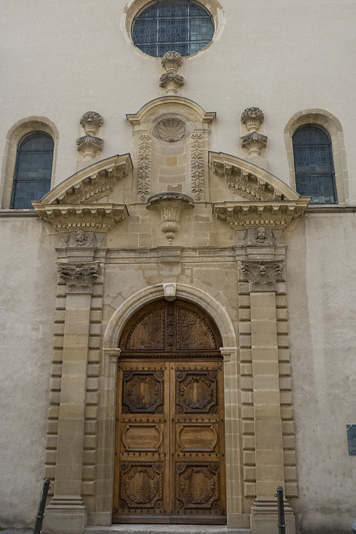 La façade est l'élément le plus remarquable de cette église d'allure simple. Le portail monumental de style baroque, sur la rue André-Lacroix, a conservé sa menuiserie d'origine ; il s'inscrit dans une travée à ordres corinthiens, surmontée d'un fronton cintré brisé et d'un édicule à niche. De part et d'autre du portail, la façade est percée de deux fenêtres en plein cintre et d'un oculus circulaire au-dessus.