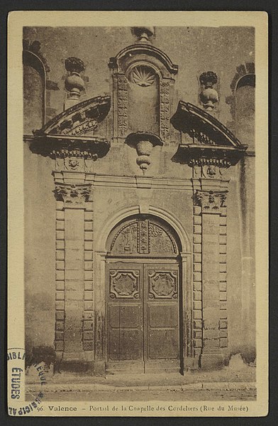 Située à Valence, dans la Drôme, la chapelle des Cordeliers est un ancien lieu de culte catholique aujourd'hui désaffecté et classé au titre des Monuments historiques depuis 1983. Les Cordeliers s'installent à Valence au XIIe siècle ; leur couvent, élevé au nord de la ville, est à deux reprises ruiné lors des guerres de religion puis reconstruit au XVIIe siècle non loin de son emplacement d'origine. La chapelle, consacrée en 1696, est le seul vestige de cet ensemble. Durant la Révolution, le bâtiment est successivement transformé en magasin à fourrages, en magasin de munitions et en salle de réunions ; après 1945 il accueille les Archives départementales et il abrite aujourd'hui le siège du Conservatoire du patrimoine de la Drôme.