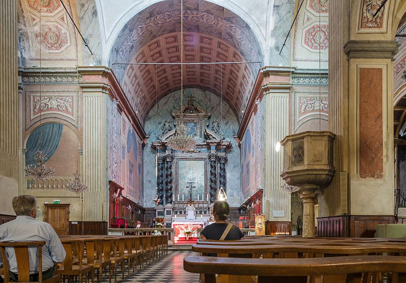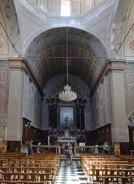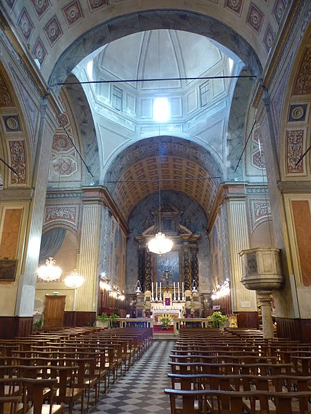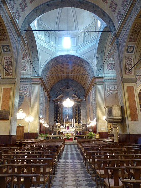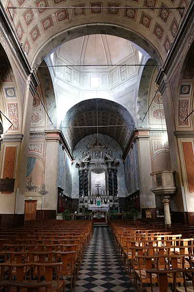 Architecturalement, l'édifice, monumental et attribué sans preuve à Giacomo della Porta, présente une nef de deux travées flanquée de collatéraux et témoigne d'influences ligures et baroques. Le grand maître‑autel en marbres polychromes date du XVIIe siècle, proviendrait de Lucques et a été installé en 1813 sous la direction de l'architecte Corradi ; il a remplacé un autel antérieur, probablement génois, daté de 1617. Faute de moyens de la fabrique, la décoration générale restait sobre, seules les chapelles latérales financées par des particuliers ou des confréries bénéficiant de peintures et de stucs plus riches.