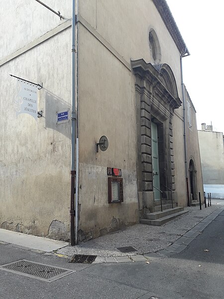 La chapelle a été édifiée par les Jésuites ; le Collège de Carcassonne, d'abord confié à des régents, leur fut remis en 1623. En 1637, le receveur des tailles Malecoste fit un legs destiné au bâtiment de l'église, qui fut bénie en 1666 par l'évêque de Mirepoix. Le plan est dissymétrique : une nef unique est bordée, côté de l'Épître, par une galerie surmontée de tribunes, tandis que le côté de l'Évangile présente de fausses arcatures. Le chevet plat est engagé dans les bâtiments scolaires. Le portail, encadré de pilastres à refends, est surmonté d'une architrave à plates-bandes, d'une frise nue, d'un entablement très saillant et d'un fronton circulaire dont le tympan devait porter un cartouche ou un blason. La nef communique avec le bas-côté par six arcades en plein cintre ; ces mêmes arcades se retrouvent à la galerie du premier étage. Le sanctuaire est couvert par une voûte en pierre taillée, soutenue par des arêtiers ; cette voûte, sur plan carré, est composée de liernes et de tiercerons qui, prolongés jusqu'à l'arc diagonal, dessinent un polygone central. Le clocher, dit tour Mirande, est engagé dans les bâtiments scolaires sauf à l'étage supérieur : d'abord de plan carré, il passe à un octogone inscrit par le biais de quatre trompes d'angle et chaque face de la partie octogonale est percée d'une baie en plein cintre.