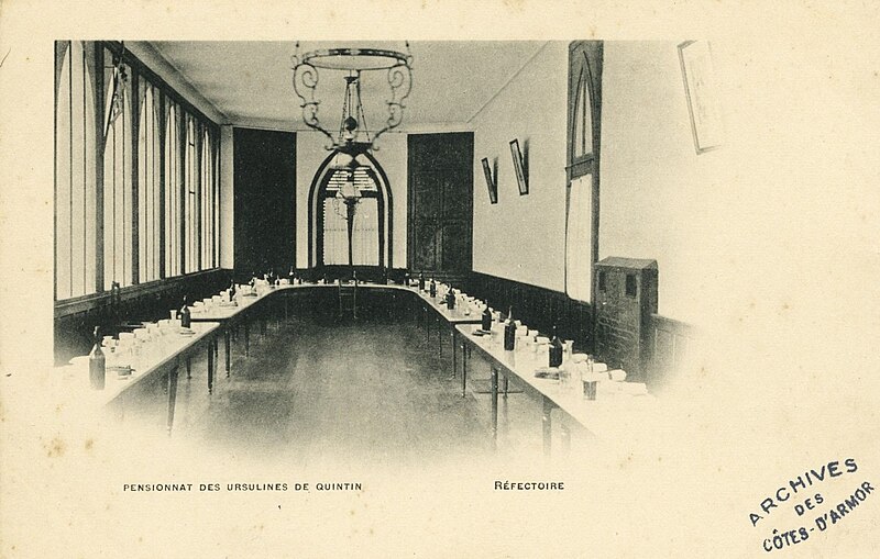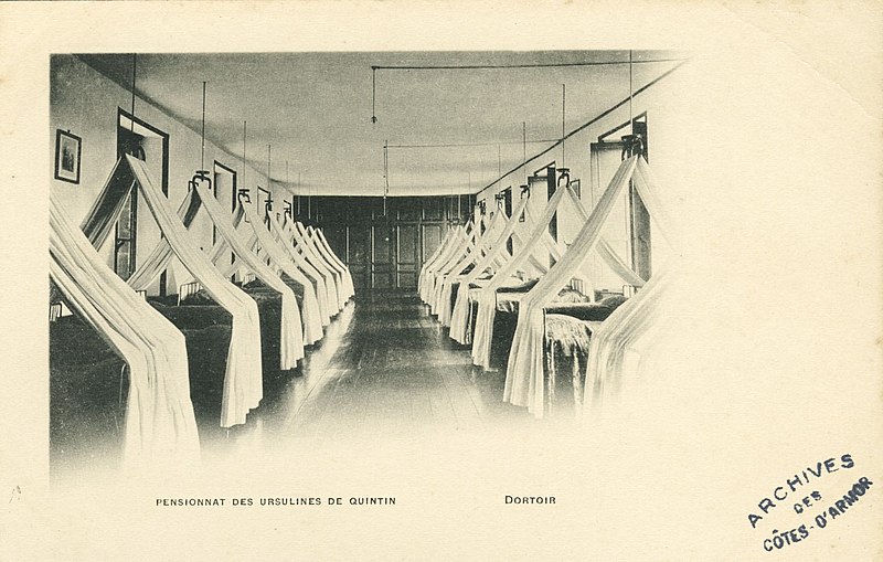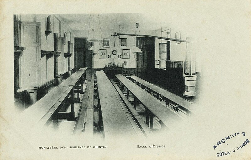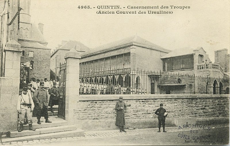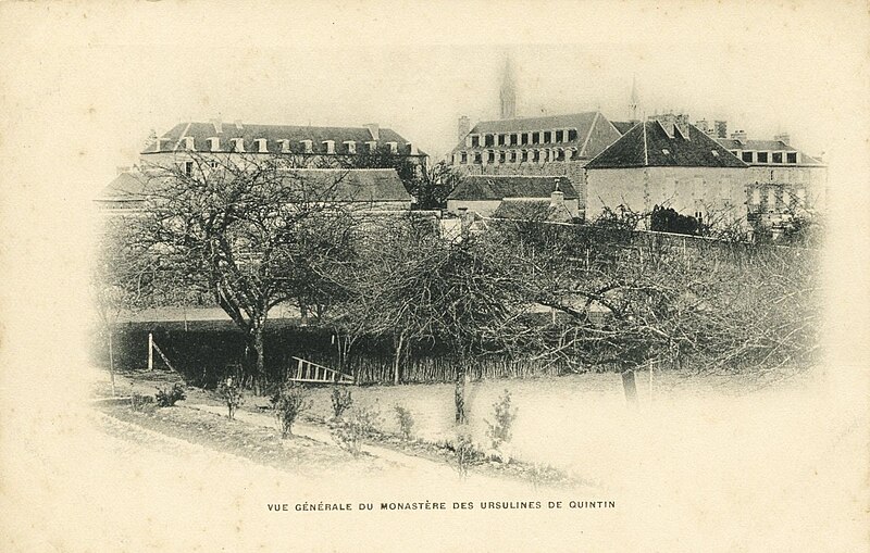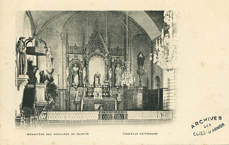 La communauté des Ursulines de Quintin fut fondée en 1707 par le duc de Lorges ; les premières religieuses arrivèrent le 20 mai 1707 et s'établirent provisoirement rue Saint-Thuriau. Un terrain près de la chapelle Saint-Yves, appelé la terre de Bel-Orient, ainsi que le Clos des Forges, fut ensuite acquis pour l'établissement. Les premières constructions commencèrent en 1711 ; la pose solennelle de la première pierre du chœur eut lieu le 23 mars 1730 et l'église extérieure fut achevée en 1736. La chapelle, d'abord dédiée à la Sainte-Famille puis au Saint-Esprit, présente la particularité architecturale d'un juvéna — dortoir à deux niveaux — élevé au-dessus de la nef, éclairé par un oculus et deux rangées de fenêtres, dont une seule est conservée. Pendant la Terreur, les personnes supposées hostiles à la Révolution y furent placées en résidence surveillée tandis que les religieuses furent enfermées au château. Jusqu'à la fermeture du couvent en 1904, les Ursulines avaient pour mission principale l'éducation des filles. Le couvent devint bien national l'année suivante et la ville de Quintin, devenue propriétaire, transforma les bâtiments en logements et écoles. En 1940, la nef accueillit des chars allemands puis elle servit de salle de sports au lycée Jean Monnet. L'église, intégrée aux bâtiments conventuels, est aujourd'hui louée par BSB (Bâtiments et Styles de Bretagne) pour des logements sociaux. Inscrite aux monuments historiques sous la dénomination « Chapelle des Ursulines » (cad. C 434) par arrêté du 14 mai 1986, elle a fait l'objet d'un échafaudage complet de la nef jusqu'en 2022. Depuis 2011, ce monument est rattaché à la fondation de la Maison des Pages de Camille Aubaude (Amboise) et, de ce fait, à la Fédération nationale des maisons d'écrivains et des patrimoines littéraires. La pièce L'Église de Louis-Ferdinand Céline, une comédie en cinq actes qui se réfère à cette église, rappelle que Céline y soigna des blessés pendant la Première Guerre mondiale ; il s'y est marié le 10 août 1919.