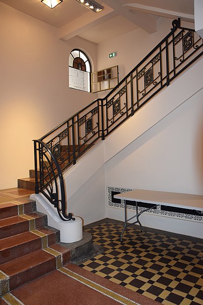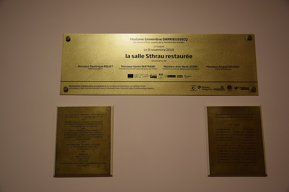 L'ancienne chapelle du collège des Jésuites, aujourd'hui nommée salle Sthrau, a été édifiée au début du XVIIe siècle (1620-1625) et attribuée à Jean de Block en 1624 ; ses façades et toitures, de style baroque, ont été inscrites aux Monuments historiques en 1958. Désaffectée au culte en 1793, elle prit le nom de salle Sthrau et servit successivement de magasin d'armée, d'écurie de garnison, de caserne, de musée, puis, à la veille de la Première Guerre mondiale, de bibliothèque et de salle de musique. Les combats du siège de Maubeuge en septembre 1914 détruisirent l'intérieur et la toiture : il ne resta que les murs extérieurs et le pignon. La ville décida de reconstruire une salle des fêtes derrière la façade conservée ; les architectes maubeugeois Jean et Henri Lafitte proposèrent une réorganisation sur deux niveaux, avec une salle de musique au rez-de-chaussée et une salle de bal à l'étage, reliés par un escalier d'honneur monumental. Le béton armé permit la création de nouveaux planchers et d'une charpente moderne, et le décor fut réalisé par Henri Lafitte. Les projets et relevés réalisés dans les années 1920 furent approuvés par le conseil municipal, qui alloua une subvention, et les travaux de reconstruction furent achevés entre 1927 et 1929. L'édifice, qui a échappé aux destructions de la Seconde Guerre mondiale, est un exemple notable d'expression Art déco dans la ville. Outre les façades et toitures, l'inscription au titre des Monuments historiques a été étendue en 1997 aux décors intérieurs, comprenant la salle de bal, la salle de musique, le foyer, l'escalier d'honneur et leurs ornements. Fermée au public pour raisons de sécurité en 1998, la salle a fait l'objet d'une restauration conduite en 2018 dans le cadre d'une convention entre la Ville et la Fondation du Patrimoine, accompagnée d'une campagne de mécénat populaire. Le chantier, chiffré à cinq millions d'euros et confié à une quinzaine d'entreprises spécialisées, a repris le clos et le couvert, mis aux normes l'édifice, démonté le sous-plafond de la salle de musique pour retrouver les volumes d'origine, consolidé les voûtes du second étage, transformé les anciens sanitaires en loges et créé un espace pour un ascenseur. Les décors (plafond en stuc, voûte en berceau du foyer, vitraux, miroirs, ferronneries) ont été restaurés, la restauration des verrières ayant été confiée au maître verrier Luc‑Benoît Brouard. La salle Sthrau relève aujourd'hui du pôle culturel de la ville de Maubeuge et conserve les traces de son histoire plurielle, de la chapelle jésuite au lieu de fête et de culture.