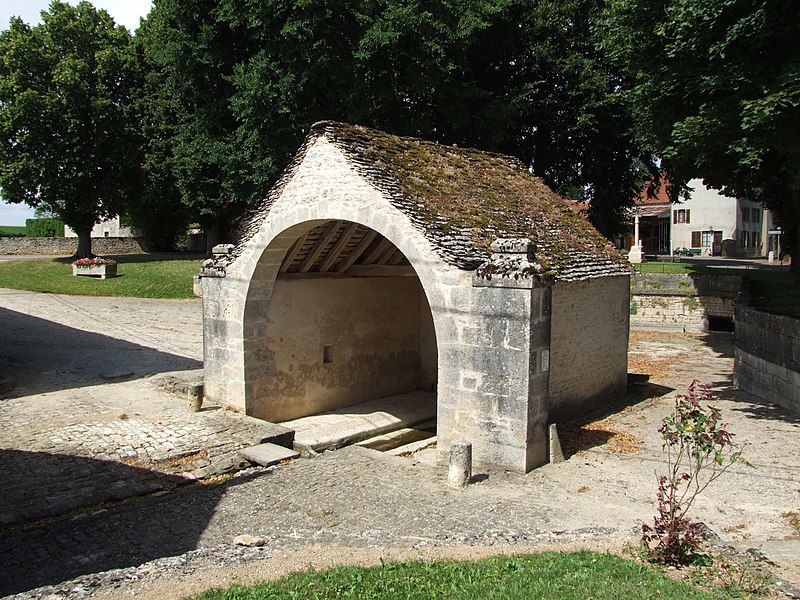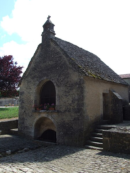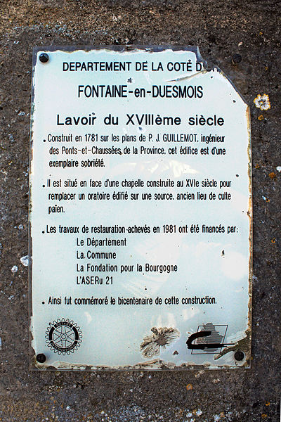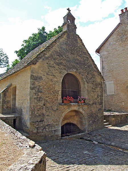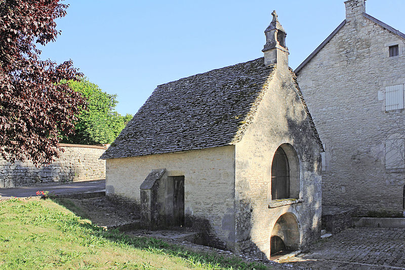 La chapelle Saint-Nicolas, le lavoir et l'abreuvoir forment un ensemble situé à Fontaines-en-Duesmois, rue aux Serains (RD 21), dans le département de la Côte-d'Or en Bourgogne-Franche-Comté. La chapelle, dédiée à saint Nicolas, est bâtie sur deux niveaux, le niveau inférieur abritant le bassin d'où jaillit la source. Ce niveau, en grande partie enterré, est éclairé par un soupirail en plein cintre côté ouest et son accès est protégé par un grillage métallique. L'accès à la partie élevée du terrain se fait par des portes latérales nord et sud qui ouvrent sur l'abside enchâssée. L'édifice présente une voûte en berceau et une couverture en laves de pierre calcaire, la façade ouest étant surmontée d'un clocheton. Une fenêtre en plein cintre, située au-dessus du soupirail, éclaire l'intérieur, où subsistent des peintures représentant deux personnages assis pouvant être saint Augustin et saint Ambroise. En vis-à-vis de la chapelle, le lavoir s'ouvre par une grande baie en plein cintre sans porte, permettant l'accès aux deux côtés du bassin. Sa faible épaisseur entre le cintre et les pans du toit est contrebalancée par deux piliers massifs de chaque côté de la baie ; la couverture en laves repose, comme pour la chapelle, sur une charpente apparente. Le bassin du lavoir est alimenté par une rigole qui court depuis le soupirail de la chapelle et l'eau poursuit son cours sous la place, puis sous la route, pour alimenter les douves de l'ancien château au nord. Un panneau indique que le lavoir a été construit en 1781 par l'ingénieur des Ponts et Chaussées P. J. Guillemot, et il a fait l'objet d'une restauration en 1981. À droite de la chapelle se trouve un abreuvoir alimenté directement par la source ; une rigole conduit ensuite l'eau vers la limite de la zone pavée où elle disparaît dans une conduite souterraine. D'autres abreuvoirs, en enfilade, se situent quelques mètres plus loin sur la place derrière le lavoir ; ils se trouvent sur le trajet apparent de l'eau avant le passage sous la route et devaient recevoir les troupeaux. La chapelle a été édifiée aux XVIe et XVIIe siècles sur le site d'un premier oratoire lié à la source et possiblement à un lieu de culte païen. L'ensemble chapelle-lavoir-abreuvoir, ainsi qu'une croix gravée "A LA DEVOTION DE RENE NOIROT ET DE JENNE QUINIER SA FEMME 1787", sont classés au titre des monuments historiques par arrêté du 6 mars 1950. La chapelle a été restaurée l'année suivante et des installations fixes ont été ajoutées pour permettre des pique-niques en ce lieu pittoresque.
