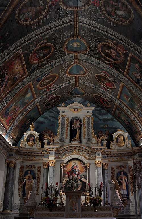 La chapelle Notre‑Dame‑de‑Carmès est un lieu de culte catholique du village de Carmès, sur la commune de Neulliac (Morbihan), situé au bord de la départementale 767 à 2 km du bourg en direction de Pontivy. L'édifice, de plan en croix latine et long de 33 mètres, est construit en granit et en schiste selon une polylithie visible : schiste bleu pâle, schiste briovérien gris‑vert en longs moellons plats, médiocres moellons briovériens sur l'élévation nord, granite fin au porche méridional et granite à gros grain de Pontivy. Les attributions chronologiques varient : le porche occidental et la nef sont datés du XVIe siècle, tandis que d'autres indications rattachent au XVe siècle le transept, la nef et l'amorce du chœur ; le clocher‑porche porte la date de 1521. Les croisillons et le chœur ont été entièrement refaits en 1768 et les parties hautes du clocher ont été remaniées au XVIIIe siècle. C'est aux travaux du XVIIIe siècle que la chapelle doit sa voûte actuelle, son riche décor intérieur et le prolongement du chœur par une sacristie axiale. La fontaine, la sacristie et le décor intérieur sont classés au titre des monuments historiques depuis le 10 avril 1980. La façade est orientale présente une porte en arc brisé ornée d'une moulure en accolade ; le gâble est surmonté d'une croix à chou frisé et les moulures sont décorées de sculptures de pampres. Le porche, décrit comme méridional, est abrité sous une grosse tour carrée de granit coiffée d'une flèche en ardoise ; il est couvert d'un lambris peint, ses murs portent des portraits des apôtres et une tourelle semi‑polygonale renferme l'escalier d'accès. Le lambris peint à l'huile comprend seize panneaux qui racontent la vie de Jésus et de la Vierge : le premier représente Notre‑Dame‑du‑Scapulaire et les quinze suivants illustrent les mystères du Rosaire. Ces scènes sont surmontées d'une galerie de portraits comprenant évangélistes, pères et réformateurs de l'Église ainsi que le roi Louis XIII consacrant la France à la Vierge du Rosaire. Les plus anciennes et importantes peintures murales sont en partie signées « La Palme, peintre 1705 », signature visible sur le panneau du Couronnement du Christ. La Palme, qui a réalisé un tableau pour la chapelle Saint‑Samson de la commune et serait peut‑être d'origine espagnole, a exécuté une part notable du lambris en 1705. L'ensemble a été complété en 1778 par Deduy, restauré en 1814 par Blévin, de Loudéac, puis restauré entre 1986 et 1990 par l'atelier parisien François Bailly. La chapelle a abrité des confréries, notamment celles des Âmes du purgatoire et du Scapulaire, et elle est connue pour son pardon au mois d'août, qui donne lieu à d'importantes festivités. Le nom de Notre‑Dame‑de‑Carmès est déformé : le site n'a jamais accueilli de fondation de Carmes et l'appellation semble d'origine celtique, Car ar maez, signifiant « domaine des champs ». La richesse de l'ensemble a été soulignée par l'abbé Guillôme et s'explique en partie par la protection de la famille de Rohan.