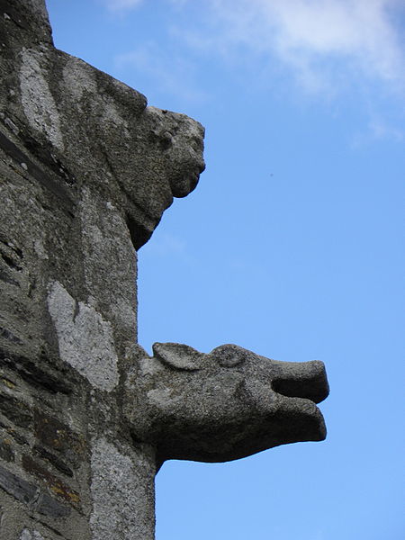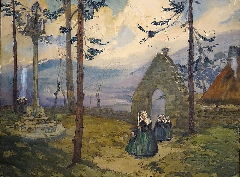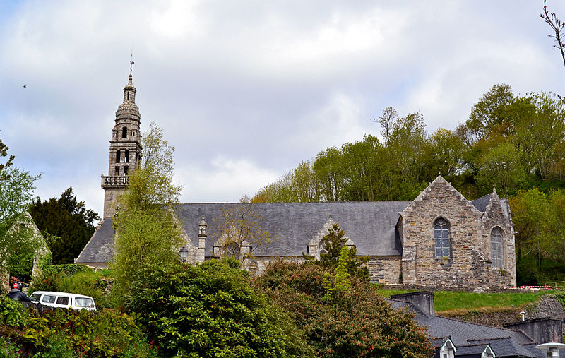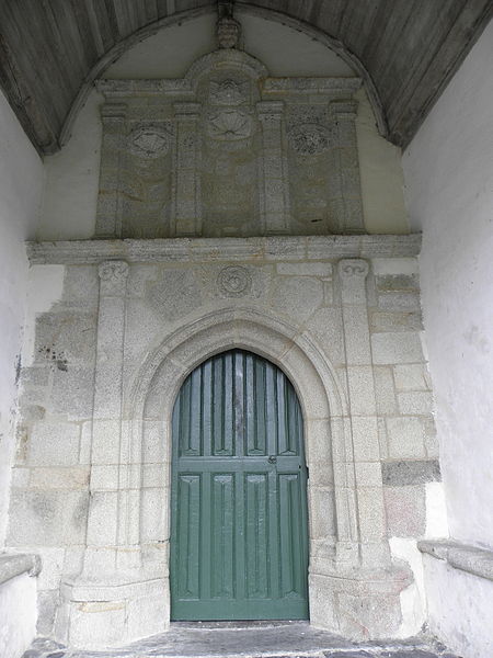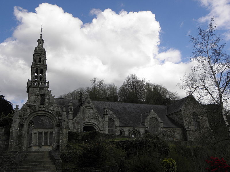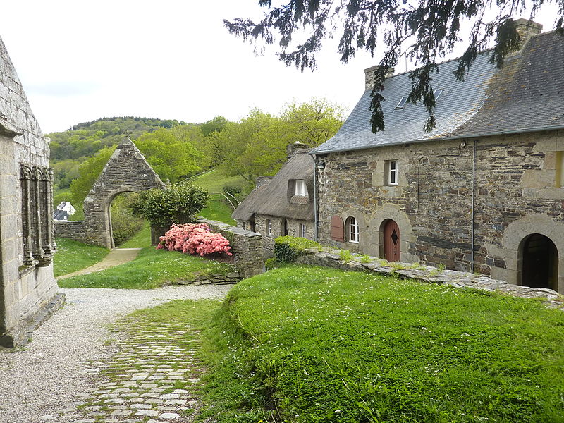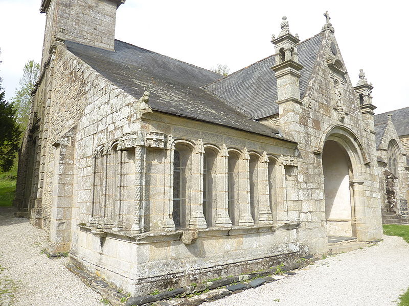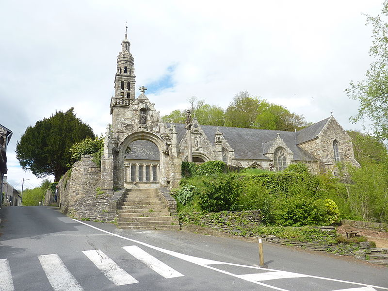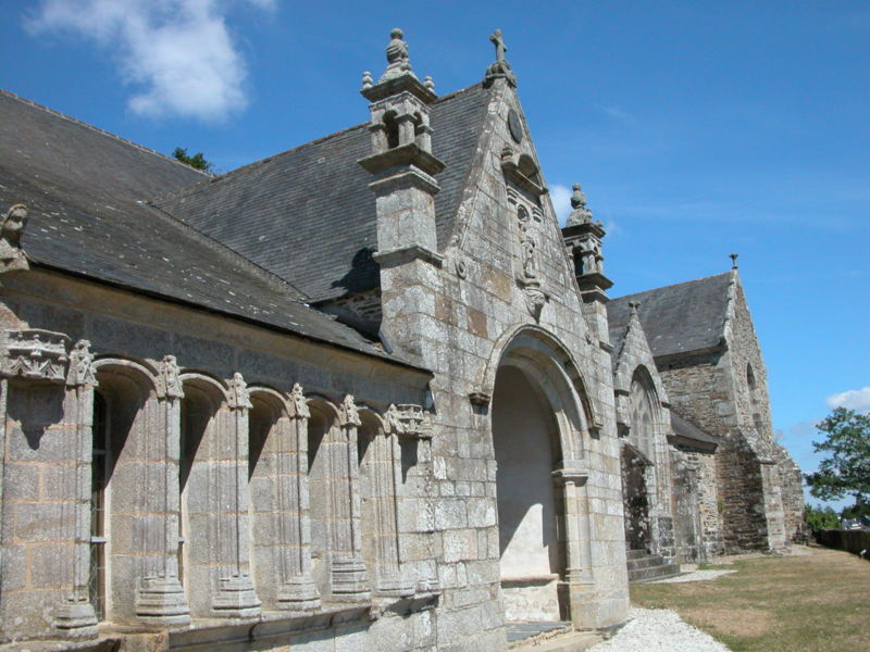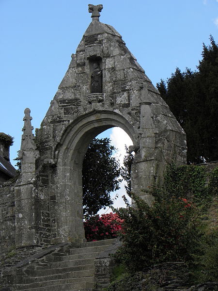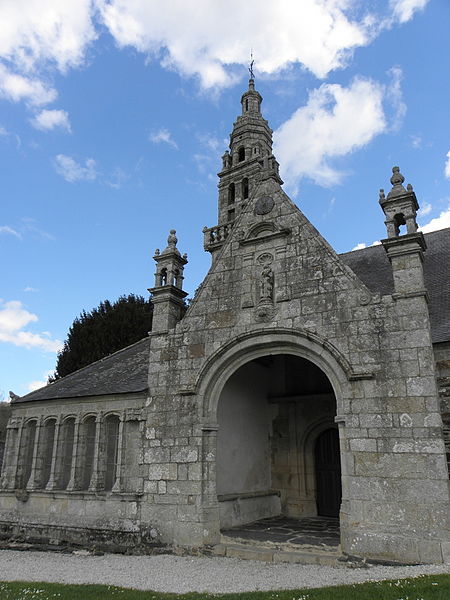 On accède à l'enclos paroissial par un arc de triomphe de la seconde moitié du XVe siècle qui mène à un petit placître offrant une vue dégagée sur la vallée de l'Aulne et les collines environnantes. L'ossuaire, attaché à la chapelle en 1575, est construit dans le style Louis XII et servait à entreposer les ossements retirés du sous‑sol de l'église et du cimetière ; des gravures du XIXe siècle montrent encore des ossements disposés entre ses colonnes. Le porche porte sur son pignon sud une inscription datée de 1722 et se distingue par un entablement classique surmonté de lanternons caractéristiques de la Renaissance bretonne.