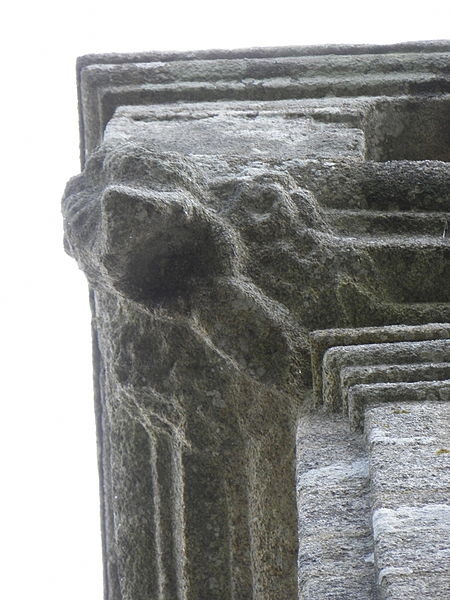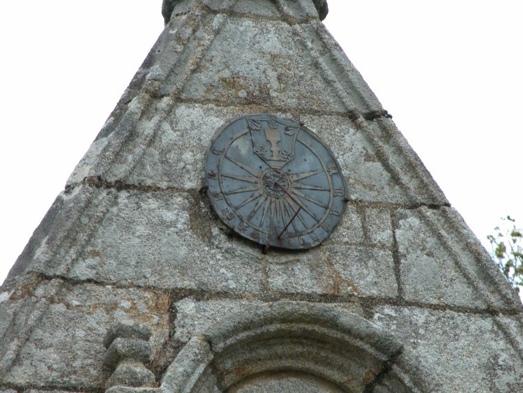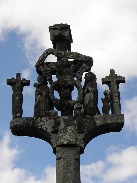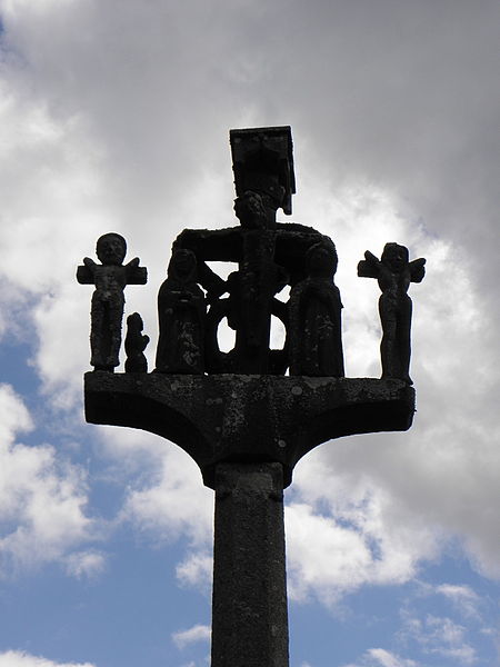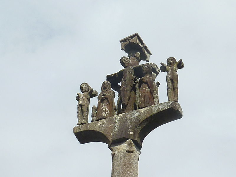 Le calvaire, taillé dans la pierre noire de Kersanton, présente sur sa face ouest la scène de la Crucifixion entourée de saint Jean, de la Vierge et des deux larrons ; la face est représente le Jugement dernier avec le Christ assis sur un arc‑en‑ciel et les morts ressuscitant au son d'une trompette. La banderole qui surmonte la composition porte une inscription partiellement déchiffrée (« GARDE... QU'IL FERA SELO(N) SES... JUGERA ») que Y.‑P. Castel rapproche de celle du calvaire d'Argol, et le calvaire serait contemporain d'Henri de Navarre, qui abjura le catholicisme en 1576.