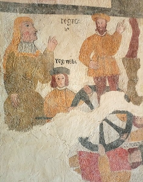 L'intérieur conserve des éléments de grande valeur : un ensemble de peintures murales datées de la fin du XVe ou du début du XVIe siècle, principalement sur le mur sud de la nef, présentées en deux registres superposés. À la partie supérieure figurent notamment les pieds d'un personnage vêtu d'une robe, une descente de croix avec Joseph d'Arimathie, la Vierge et saint Jean, la résurrection du Christ se dressant au‑dessus de soldats surpris, et la silhouette d'un Christ en croix près d'une main tenant une hampe. Au registre inférieur apparaissent un personnage attaché à une roue, tête en bas, entouré de trois hommes, une figure identifiée comme saint François, une sainte coiffée de tresses mentionnée comme sainte Cécile, une femme accompagnée d'une inscription incomplète, une mise au tombeau avec deux personnages tenant le linceul et, derrière le Christ, la Vierge et sainte Madeleine, ainsi qu'un personnage accompagné de la mention saint Mande. Par ailleurs, les murs sud et ouest portent une fresque datée de 1594 représentant la Crucifixion et plusieurs saints; le décor peint qui couvrait à l'origine l'entièreté des murs de la nef est aujourd'hui en très mauvais état.