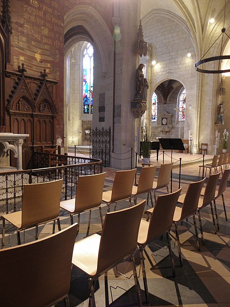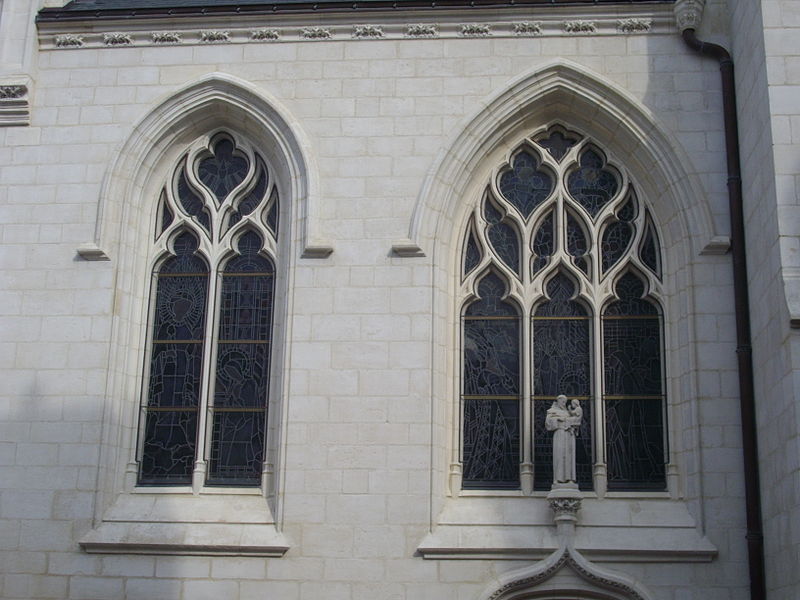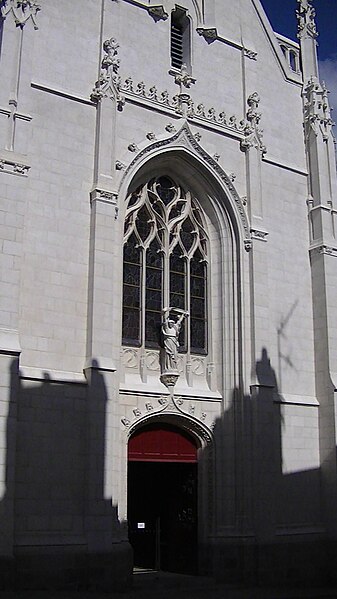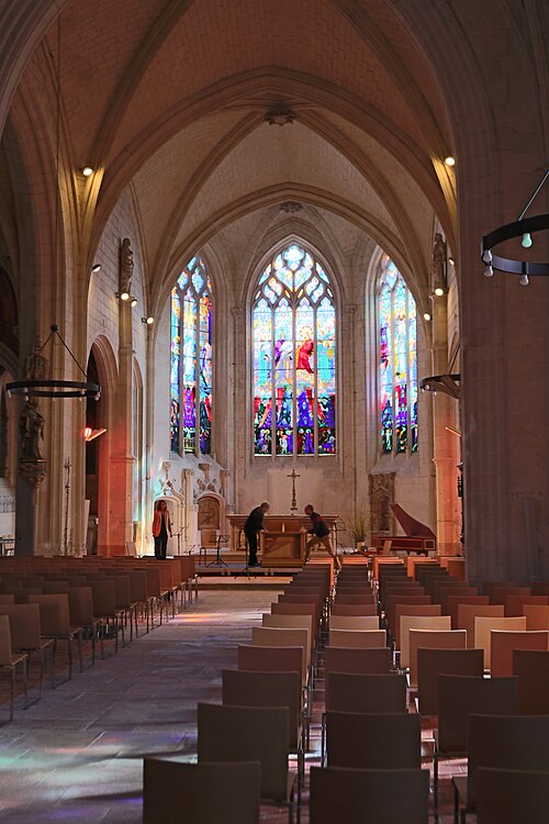L'édifice est construit en granite et tuffeau ; ses dimensions extérieures sont de 43 mètres de longueur, 25 mètres de largeur et 22 mètres de hauteur, la hauteur sous voûte atteignant 13,50 mètres. L'intérieur présente un style gothique flamboyant et la partie la plus ancienne est le chœur, dont la construction est contemporaine des travaux de la cathédrale voisine. Le plan respecte la croix latine classique, avec travée de nef, travée de chœur, deux chapelles latérales et une abside à trois pans, et les voûtes principales sont fortement accentuées, conformément aux caractéristiques de l'architecture gothique du XVe siècle ; certains auteurs y voient l'influence de Mathurin Rodier ou d'un de ses assistants.