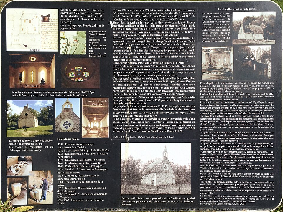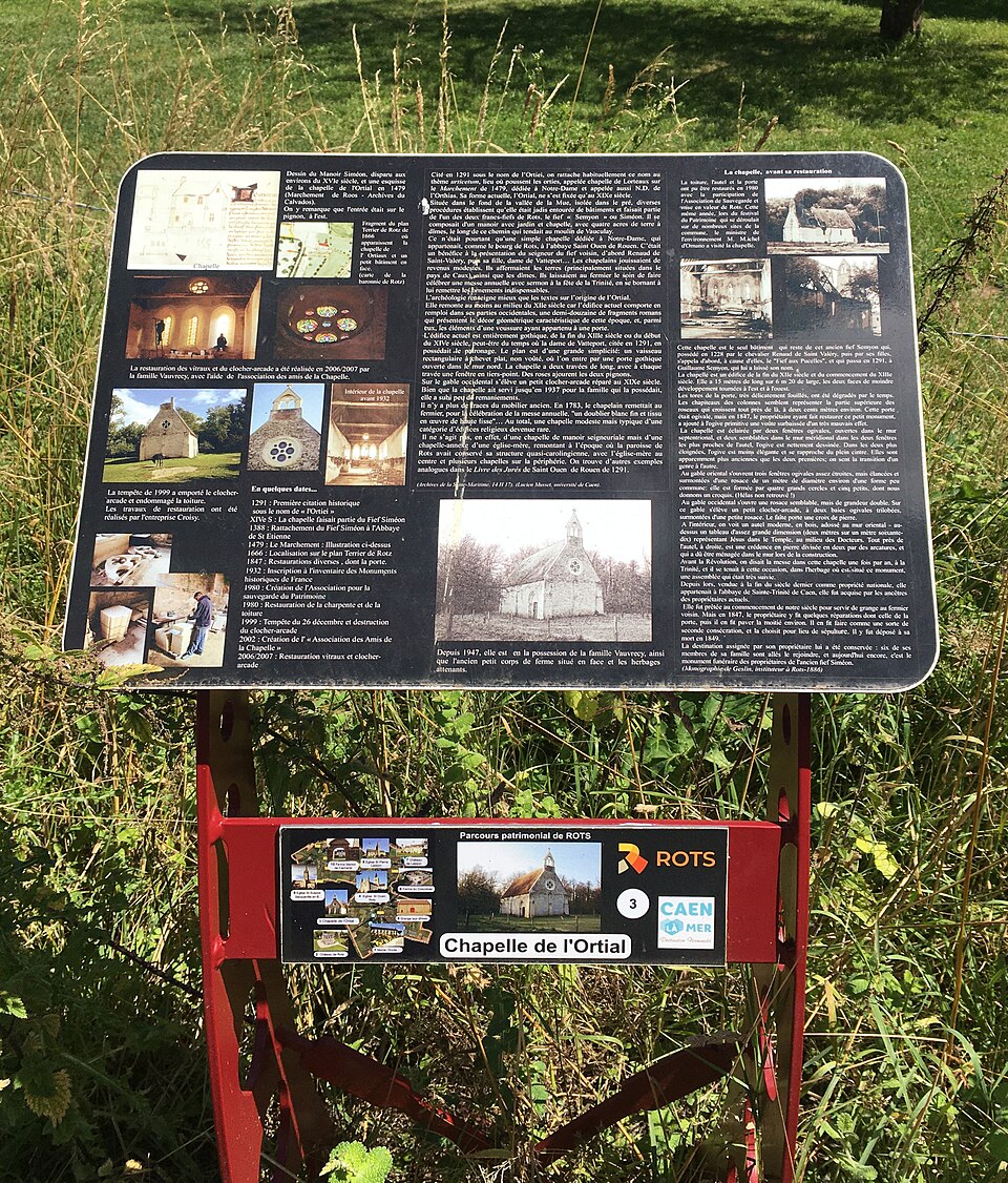 La chapelle Notre-Dame de l'Ortial est située à Rots (Calvados), dans la vallée de la Mue, à un kilomètre de l'église paroissiale, sur un lieu autrefois appelé fief Siméon. Des fragments de pierres de remploi aux décors géométriques romans, intégrés dans les murs ouest, montrent qu'une chapelle existait déjà au XIIe siècle. La chapelle est attestée dans les sources écrites à partir de 1291 et son nom actuel s'est fixé au XIXe siècle. L'édifice actuel a été construit à la fin du XIIIe ou au début du XIVe siècle. Il appartenait, comme le bourg de Rots, à l'abbaye Saint-Ouen de Rouen, tandis que le patronage de l'église relevait de l'abbaye aux Hommes de Caen. Il constitue un exemple rare de « chapelle-annexe d'une église-mère » issu du maillage religieux ancien de la paroisse. La population l'appelait aussi « chapelle Saint-Siméon » et une messe y était célébrée lors de la fête de la Trinité ; de plus, de la fin du XIXe siècle à 1937 l'édifice a servi de lieu de sépulture à la famille propriétaire d'un manoir proche. L'édifice est inscrit au titre des monuments historiques depuis le 4 octobre 1932. Après avoir été utilisée comme étable pendant environ vingt ans, la chapelle a fait l'objet en 1980 d'un bail emphytéotique de 45 ans, suivi d'importants travaux financés par des fonds publics et des associations de sauvegarde du patrimoine ; le clocher a été refait en 2007 et les vitraux restaurés en 2008. D'un point de vue architectural, l'édifice, de style gothique, intègre des éléments romans remontés en remplois. Le clocher, caractérisé par une arcade rare en Normandie, a été réparé au XIXe siècle. La nef, sans voûte, est rectangulaire et composée de deux travées ; une porte gothique ouvre dans le mur nord. La chapelle ne comporte pas de transept et est bâtie en calcaire local.