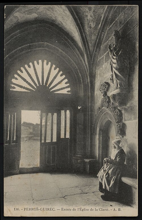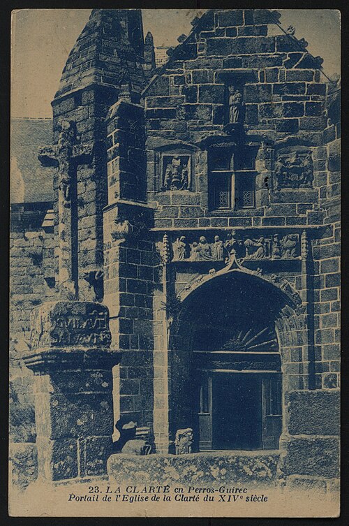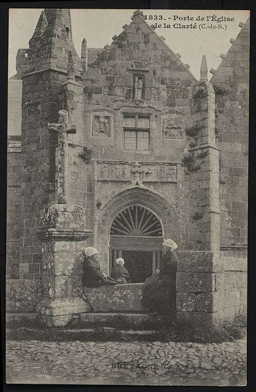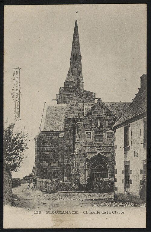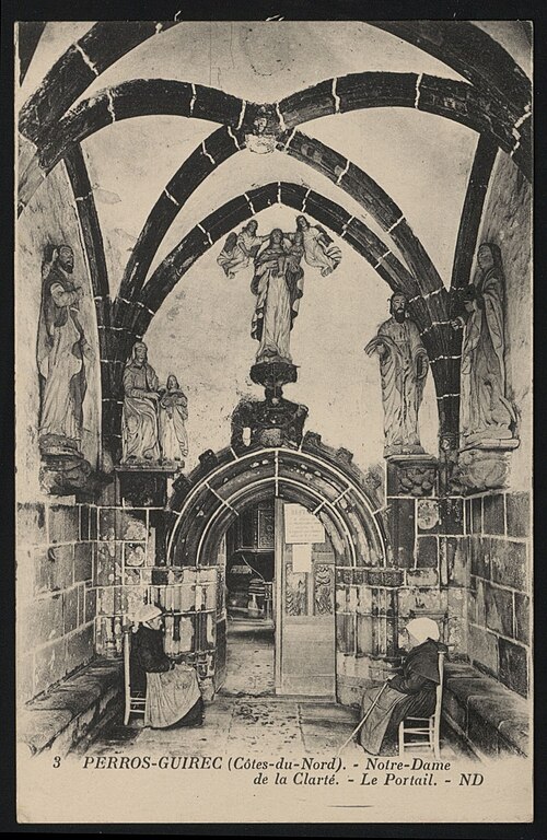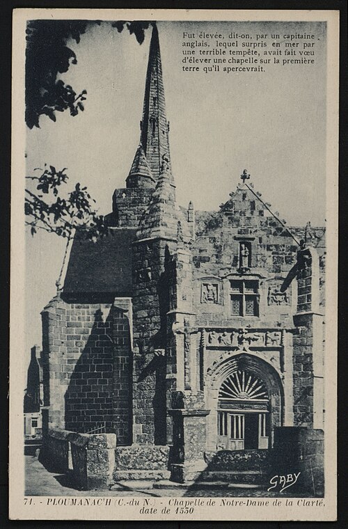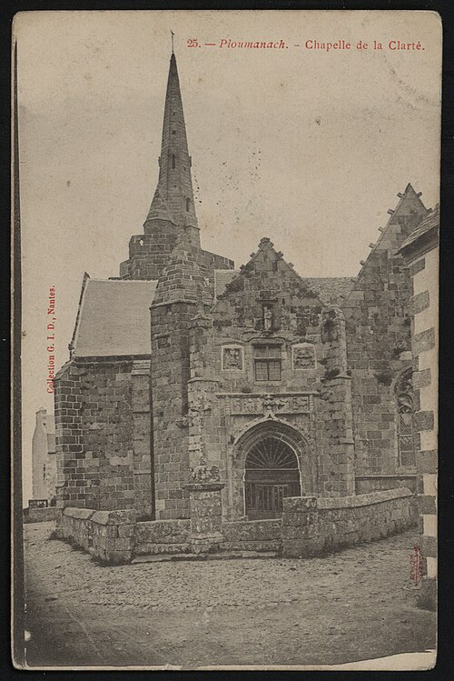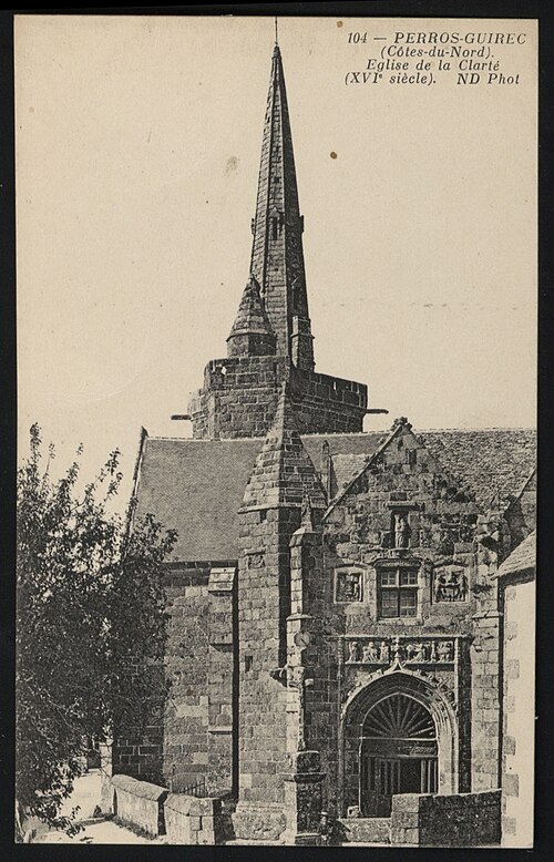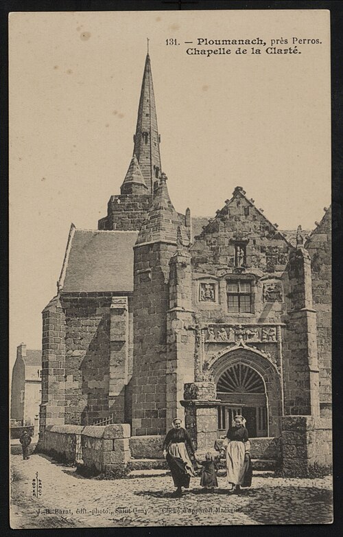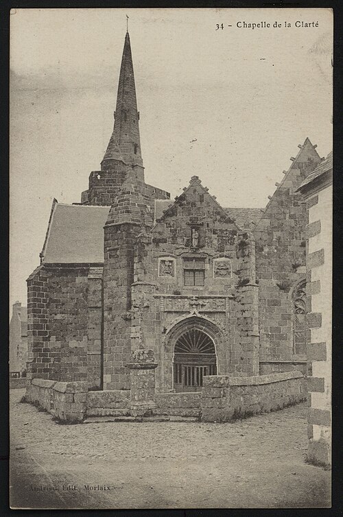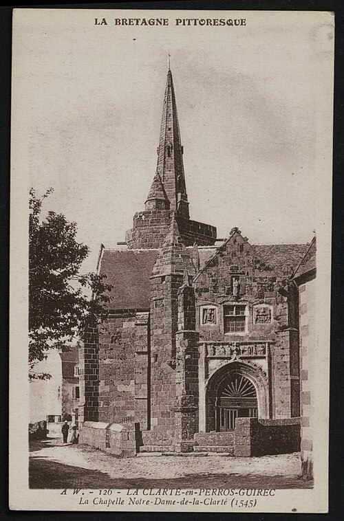 La chapelle Notre‑Dame‑de‑la‑Clarté à La Clarté, Perros‑Guirec (Côtes‑d'Armor, Bretagne), est dédiée à la Vierge Marie. Une inscription découverte sur le deuxième pilier nord lors de la suppression de la chaire indique que le chantier débuta en 1445 ; R. Couffon identifia le promoteur des travaux comme Guillaume Quintin, prêtre. Un procès‑verbal de 1629 signale dans la maîtresse‑vitre les armes de Bretagne sur le panneau supérieur et, en dessous, celles de la famille de Coëtmen, représentée alors par Roland V, familier du duc Jean V. Les travaux se poursuivaient en 1463, date à laquelle Jean du Parcneuff légua deux rannées de froment à l'œuvre de Notre‑Dame‑de‑la‑Clarté. Au troisième quart du XVe siècle, la famille de Lannion ajouta au sud du chœur une grande chapelle seigneuriale alignée sur le chevet et le porche méridional ; le commanditaire probable est Roland de Lannion, seigneur du Cruguil et premier écuyer du duc. Le garde‑corps qui couronne la tour fut édifié après 1594 avec des matériaux provenant du château de Ploumanac'h, détruit cette année‑là, et la flèche hexagonale n'est vraisemblablement pas antérieure à 1645. Les lambris de la nef furent refaits et repeints en 1712, et une sacristie carrée fut ajoutée en 1828 au nord de la travée orientale du bas‑côté. En 1873 la foudre frappa la flèche, réduisant sa hauteur et provoquant une lézarde dans le clocher ; l'incendie affecta les boiseries et la toiture, et Guillaume Lageat, architecte à Lannion, dirigea la restauration. Des travaux de rejointoiement intérieurs eurent lieu en 1930 ; lors de la suppression des badigeons on retrouva la porte, depuis l'escalier du clocher, qui desservait autrefois une tribune. La chapelle subit un incendie en 1995 et fit l'objet de restaurations dans les années suivantes ; malgré une réfection de la toiture entre octobre 2020 et mars 2021, des infiltrations apparurent en 2022 et un effondrement partiel de la charpente entraîna la fermeture de l'édifice par arrêté municipal le 3 mai 2023. L'édifice rassemble quatorze tableaux du chemin de Croix réalisés par Maurice Denis. La tradition locale rapporte qu'un seigneur de Barac'h, sauvé d'un naufrage près des Sept‑Îles, fit édifier la chapelle en ex‑voto après une percée du brouillard attribuée à Notre‑Dame. Selon des témoins de 1627, les armoiries présentes dans la maîtresse‑vitre et l'écusson au sommet du pignon oriental appartiennent à Roland IV de Coëtmen, parti en croisade en 1458 ; les archives départementales confirment Roland IV comme fondateur et indiquent que ses biens passèrent ensuite aux Coskaër de Rosanbo. De style flamboyant breton, la chapelle présente des singularités qui participent à son harmonie : un transept méridional unique, une tour carrée surmontée d'un clocher ajouré en granit rose et un enclos où se trouvent un socle de granit du XVIIe siècle muni d'un tronc en bois ferré pour les offrandes et une croix érigée par maître Guillaume Salaün en 1630. Le linteau du porche montre une Annonciation faisant face à une Pietà, tandis qu'autour d'une fenêtre à meneaux on lit l'inscription « Le Carro », des armoiries effacées et, plus haut, une Vierge‑Mère. Le porche, dallé de schiste de Brélévenez et voûté d'ogives, abrite des statues polychromes du XVIIe siècle représentant la Vierge à l'Enfant, sainte Anne instruisant Marie, saint Pierre et les quatre évangélistes ; les vantaux de la porte en chêne, classés Monuments historiques en 1994, portent des représentations du Baptiste, de Pierre, de l'Annonciation, de la Vierge à l'Enfant et de saint Paul. Dans la nef, on relève la trace d'un ancien jubé du XVe siècle et la disparition de la chaire ; l'entrée est ornée d'un bénitier du XVe siècle, classé en 1904, sculpté de têtes de Turcs ou de Maures rappelant la prise de Constantinople en 1453, avec d'autres motifs symboliques, et une pierre au sol rappelle la sépulture du chanoine Gouronnec. Le grave incendie de 1995 provoqua l'effondrement d'une partie de la voûte le 26 mai 2000 ; la voûte restaurée en 2006 est en bois, en forme de carène renversée, peinte principalement en jaune et mise en valeur par un éclairage contemporain discret. Les ex‑votos de marins comprennent des maquettes de bateaux, dont le brick L'Hériment inscrit à l'inventaire supplémentaire des Monuments historiques en 1994, un paquebot inscrit en 1983, ainsi qu'un wandera, un yacht à vapeur, un thonier et un trois‑mâts barque. Le transept droit, appelé aussi chapelle Saint‑Joseph ou Saint‑Samson, doit son origine à Yvon de Lannion, lieutenant général de l'amirauté du duc de Bretagne ; la famille de Lannion fut anoblie par Charles V à la suite des ravages causés par les Anglais. Le mobilier rassemble de nombreuses statues — saint Fiacre, sainte Anne du XXe siècle réalisée par un couple d'artistes du Finistère, saint Yves entre le riche et le pauvre, ainsi que des saints locaux dans le transept — un retable du XVIIIe siècle commandé à partir de 1767 et une statue de la Vierge du XVIe siècle classée en 1999. Les vitraux du XXe siècle, réalisés par l'atelier Sainte‑Marie de Quintin, comportent notamment une grande maîtresse‑vitre ornée d'armoiries. Le Chemin de Croix de Maurice Denis, peint après la fondation des Ateliers d'art sacré, développe quatorze tableaux aux tonalités claires et pastel mêlant références historicistes et accents orientalistes. La chapelle et le mur entourant le cimetière attenant sont classés au titre des monuments historiques depuis le 30 mars 1904 ; cette protection fut modifiée par décret le 28 mai 1915. Le pardon de Notre‑Dame‑de‑la‑Clarté, né au XVe siècle comme rite pénitentiel lié à la dévotion mariale, comporte une veillée la veille, une procession vers le tertre où l'officiant allume le « tantad » d'ajonc