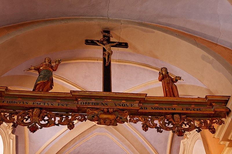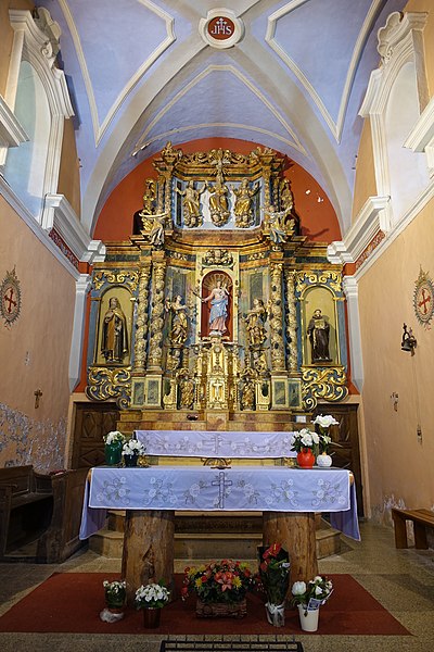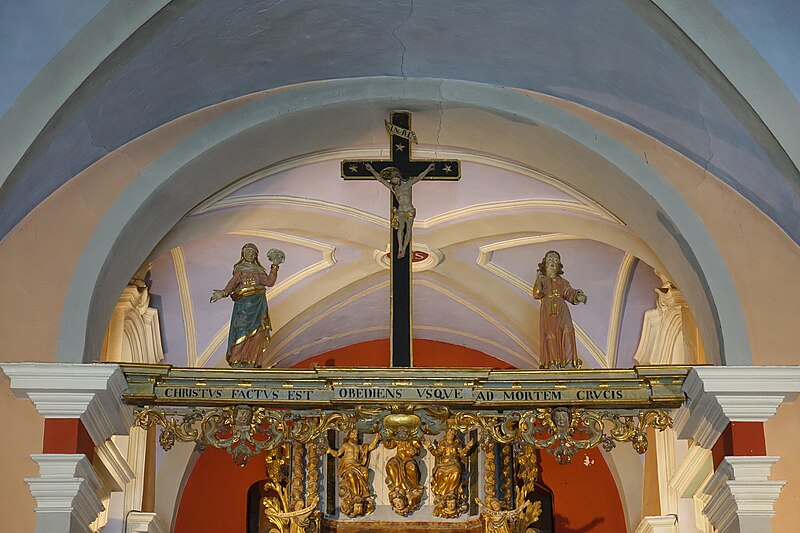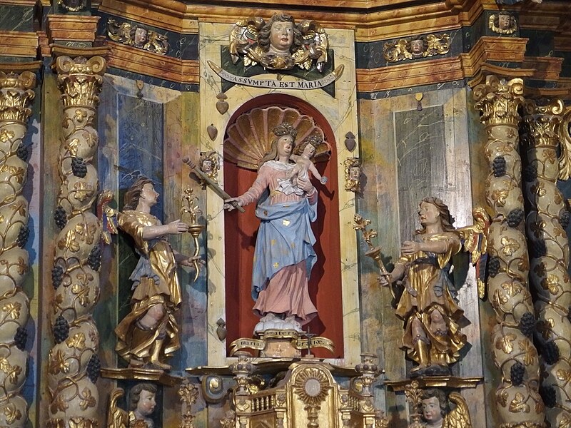 Le retable central représente la Vierge de l’Assomption honorée par deux anges et, tout en haut, Dieu le Père avec la Vierge à sa gauche et le Christ à sa droite, places inversées au XVIIIe ou XIXe siècle ; ce retable serait l’œuvre de Jacques Clairant. Les statues latérales actuelles, saint Bernard de Clairvaux et saint Antoine, ne sont pas d’origine. Le retable de gauche présente des colonnes ajourées et une frise figurant les anges gardiens consolant les âmes du purgatoire. Les piliers portent des croix de consécration reprenant les armes de Savoie et l’un d’eux accueille une statue de saint François de Sales ; une poutre de gloire, unique dans le Faucigny, complète le chœur.