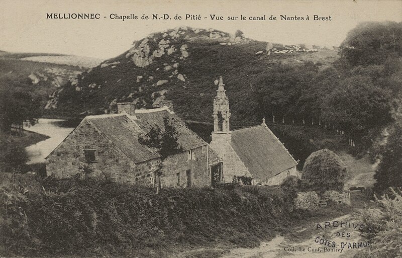 La chapelle Notre-Dame-de-la-Pitié est située à Mellionnec, à proximité du canal de Nantes à Brest, dans les Côtes-d'Armor. Elle est inscrite au titre des monuments historiques depuis le 17 septembre 1973. Sa datation varie selon les sources, qui la situent à la fin du XVe siècle ou au XVIe siècle. L'édifice illustre l'architecture caractéristique du centre de la Bretagne : le mur du chevet est soutenu par deux contreforts, tandis que l'ensemble du bâtiment repose sur quatre gros contreforts biais aux angles. À l'intérieur, la chapelle présente une voûte en berceau en bois, avec des entraits moulurés ornés d'engoulants très expressifs. Elle est dédiée à Notre-Dame-de-la-Pitié et aussi à saint Gildas ; une statue en bois peint de ce dernier fait partie des collections et a été classée au titre des objets historiques le 22 mars 1974. La construction aurait été initiée par la famille de Boutteville, seigneurs de Coat Couraval en Glomel ; leurs armes — cinq fusées de gueules disposées en fasce — figurent sur l'élévation ouest et, en alliance avec une famille non identifiée, sur le clocher, comme c'est le cas à l'église paroissiale. La verrière axiale a été dotée en 1994 d'un vitrail remarquable réalisé par l'atelier Hubert de Sainte‑Marie à Quintin et signé Mickael Messonnet.