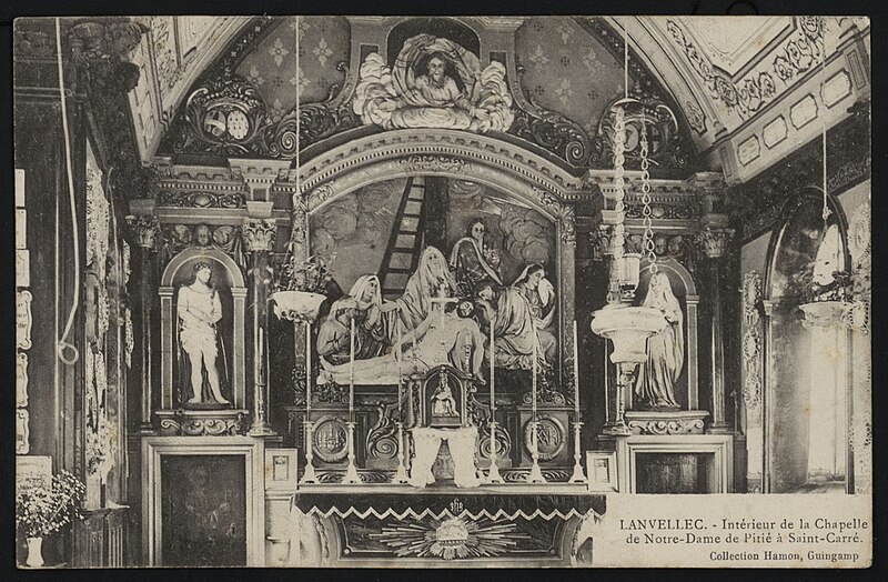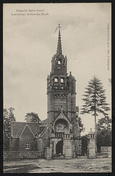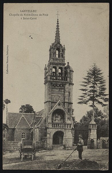 La chapelle Notre‑Dame‑de‑Pitié se situe dans le village de Saint‑Carré, à 5 km de Lanvellec (Côtes‑d'Armor). Elle remplace une ancienne chapelle frairienne mentionnée dès le XIIe siècle et ruinée lors des guerres de la Ligue. La reconstruction fut décidée après trois apparitions de la Vierge à Jean Bizien, paysan de Lanvellec, vers 1660, et un petit oratoire y fut édifié dans les années 1660 ; Monsieur de Perrien donna le terrain et Marguerite du Cosquer de Rosanbo fit une fondation. L'édifice actuel, réalisé entre 1695 et 1697, présente un plan en croix latine orientée à chevet plat, avec une nef simple, un transept et un chœur prolongé par une sacristie. Une inscription rappelle la construction achevée en 1696 par Yves Le Brigant, Jan Guyomard et Bizien Jan, et une seconde porte la date de 1697 pour l'élévation de la tour‑clocher. La porte, située à la base du clocher, est surmontée d'une loggia abritant une statue de la Vierge, objet d’un pardon à la Pentecôte. L'intérieur conserve un décor du XVIIIe siècle, notamment retable et statues, ainsi qu'une voûte lambrissée et des entraits peints en 1890. En 1875 la foudre endommagea la tour‑clocher et une partie de la nef ; le clocher fut reconstruit en 1878, comme l'atteste une inscription mentionnant M. Le Moing, chanoine honoraire et recteur de Lanvellec, et le conseil de fabrique. Le nouveau clocher comporte deux chambres de cloches surmontées d'une flèche et s'ouvre depuis une tour d'escalier hors‑œuvre ; une tribune extérieure ou oratoire a été aménagée au‑dessus du porche. La chapelle est entourée d'un placître dont l'enclos à échaliers se signale par un portail et deux croix ; la croix de placître, datée de 1622, porte l'inscription mentionnant Jean Le Roux et, plus tard, Jehan Bizien (1702), et la tradition locale veut que Jean Bizien ait été enterré au pied de cette croix. À l'extérieur de l'enclos se trouve une fontaine de dévotion datée de 1700, inscrite au nom des fabriques et réputée, selon la tradition, pour guérir le rachitisme, la dépression et la langueur ; un petit affluent du Roscoat y prend sa source. Le calvaire de la chapelle porte la date de 1700 et les deux piliers de l'enclos rappellent l'ancien toponyme breton Parc‑ar‑Feunteun (le champ de la fontaine). L'édifice fut vendu comme bien national en 1800 puis réintégré dans le domaine de l'évêché en 1804 pour non‑paiement de l'acquéreur. Au XIXe siècle, la chapelle fut parfois surnommée « la chapelle neuve », « chapelle de Saint‑Carré » ou, à tort, « église de Saint‑Carré ». Le clocher et les deux piliers du portail ont fait l'objet d'une première inscription au titre des monuments historiques le 6 mars 1925, puis la totalité de la chapelle, avec son placître et sa fontaine, a été inscrite ultérieurement.