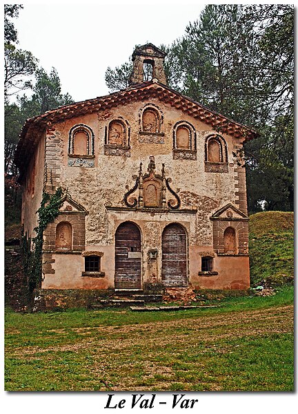 La chapelle Notre-Dame de Pitié est une chapelle rurale isolée située au Val, dans le département du Var, au col de Notre-Dame à la limite de la commune de Brignoles, adossée à la route départementale RD 554. On y accède par un chemin de procession bordé d'oratoires. L'édifice présente un plan rectangulaire avec des pans coupés au chevet et se compose de deux travées correspondant à un corps ancien, à l'arrière, et à une extension plus récente en façade. La partie arrière pourrait correspondre à une première chapelle, éventuellement dénommée Notre-Dame de Clivio et d'origine médiévale. Entre 1630 et 1668, un grand auvent puis la construction qui subsiste aujourd'hui ont été réalisés, mais les décorations, notamment celles en coquillages, n'ont pas pu être datées avec précision à cause de documents d'archives rares. Il est possible que l'autel et ses décors soient antérieurs à cet agrandissement et que leur réputation ait favorisé l'augmentation de la capacité pour accueillir les fidèles. L'édifice possède deux portes en façade, particularité plus fréquente sur des voies de pèlerinage, et une porte ouest, aujourd'hui rebouchée, donnait autrefois accès au presbytère aujourd'hui disparu. La façade comporte des niches d'inspiration romane, une niche à chapiteau qualifiée plutôt du XVIIIe siècle, et une Pietà en bas-relief datée de 1659 qui rend hommage à la mort du frère Barthélémy de Sainte-Croix ; cette Pietà est entourée d'éléments gothiques et surmonte un bas-relief figurant une vigne. Des liserés de coquillages et des scories noirs ornent la façade et les cinq niches hautes, et la présence de coquilles Saint-Jacques en décor de façade évoque la fréquentation pèlerine. À l'intérieur, l'arc triomphal et l'abside sont richement ornés de coquillages et de scories composant rinceaux, vases et autres compositions décoratives ; l'emploi de coquillages dans un décor religieux est exceptionnel. L'autel et l'abside comportent environ 9 000 coquillages de près de trente espèces issues du littoral méditerranéen, disposés en cornucopias, feuilles de laurier, rosaces et bouquets en vase autour de la reconstitution du Golgotha. Ce "mont" est un assemblage de morceaux de tuf haut d'environ 1,70 m et long d'environ 2 m, creusé d'une petite grotte garnie de coquillages où se trouvait une statuette de Pietà ; la scène est insérée dans une abside de 3,5 m de hauteur pour un mètre de profondeur. Des bougeoirs et des vases qui meublaient l'autel, eux aussi décorés de coquillages, ont disparu après avoir été volés, tandis que croix, figurines et outils du Calvaire figuraient parmi les éléments sculptés ; deux crânes humains étaient également disposés aux angles arrière du socle du "mont", et l'un d'eux pourrait être lié à Marie Gavotte, décédée en 1674, sous le cercueil de laquelle un liard daté de 1698 a été trouvé. La chapelle a accueilli des pèlerinages, notamment une messe de confirmation parcourant un chemin de croix composé de quatre oratoires à chapiteaux d'inspiration romaine, dont trois ont fait l'objet de travaux de restauration. La chapelle de Notre-Dame de Pitié fait partie d'un petit ensemble de monuments en France décorés de coquillages et présente des analogies avec la baume Joachim de Barjols, qui montre des aménagements et un autel ornés de coquillages et de scories. Les quatre oratoires liés à la chapelle ont été inscrits au titre des monuments historiques le 16 décembre 1998, puis la chapelle a été protégée dans son ensemble par un classement le 1er mars 2000.