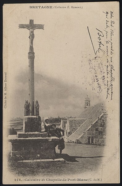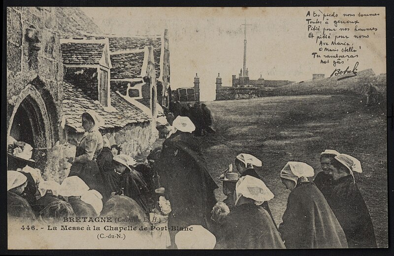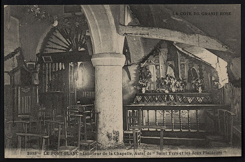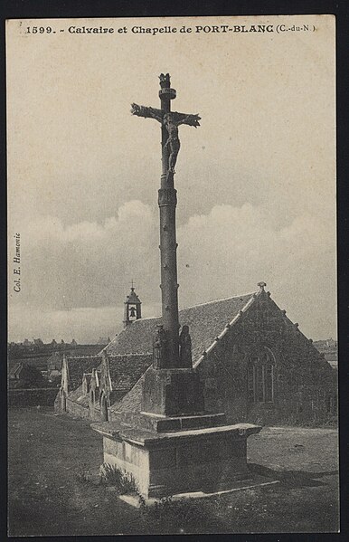 La chapelle Notre-Dame de Port-Blanc, à Penvénan (Côtes-d'Armor), est une chapelle à demi-enterrée du XVIe siècle, bâtie sur les fondations d'une tour de guet du XIIIe siècle. À l'intérieur sont suspendues trois maquettes navales : un trois-mâts carré de la fin du XIXe siècle, aux œuvres vives bleues, orné d'une figure de proue et portant à la poupe le nom « ND de Port-Blanc », sous grand pavois ; un second trois-mâts carré (ou franc), à coque blanche et marron, dédié à saint Yves et portant à la proue le nom et le port d'attache Port-Blanc, daté de la fin du XIXe‑début du XXe siècle ; enfin une goélette anonyme à coque bleue au-dessus de la flottaison et marron en dessous, du début du XXe siècle. Ces maquettes ont été réalisées par des marins locaux pendant leurs voyages au long cours ou lors des saisons de pêche, à partir de pièces de bois évidées. Un vitrail complète ces éléments maritimes et la chapelle présente un patrimoine religieux riche. Le pardon se tient le 8 septembre, jour de la Nativité de la Vierge. La croix bleue des marins ouvre la procession ; quatre garçons de huit ans, vêtus en marins, se relaient pour porter une goélette en mémoire de la grande pêche d'Islande. Des fillettes portent une petite Vierge dorée tandis que d'autres l'escortent en tenant des rubans bleus, et la statue de Notre-Dame est portée par deux marins-pêcheurs. Pendant la procession, on chante des cantiques à la Vierge et des chants bretons, puis le cortège se rend au port où l'on jette une gerbe à la mer en mémoire des personnes disparues durant l'année écoulée ; on y prie pour une bonne pêche et la protection des marins. La chapelle est protégée au titre des monuments historiques : l'escalier extérieur a été classé en 1936, et la chapelle, le calvaire et l'enceinte du cimetière ont été classés en 1968.