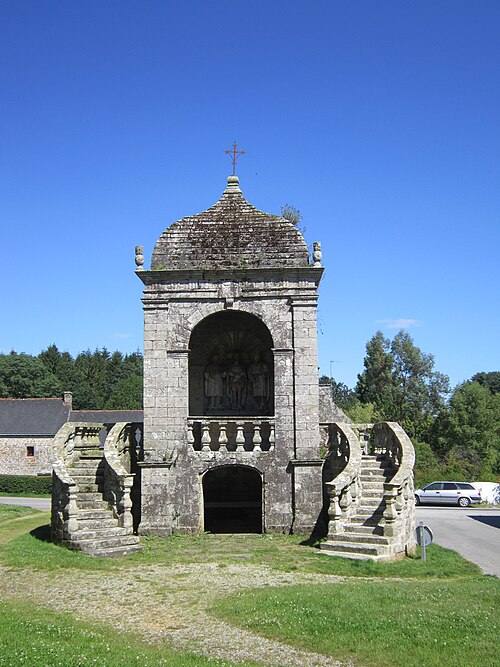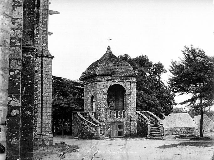 Sur le placître, la Scala Sancta forme une loggia carrée coiffée d’un dôme à quatre pans, accessible par deux escaliers courbes à balustres ; elle sert d’oratoire avec autel et de chaire à prêcher et abrite plusieurs statues et un Christ gisant sous une dalle monolithique, lieu que la tradition appelle « le tombeau ». En contrebas, la fontaine flamboyante de la vallée, composée de deux bassins et d’une niche abritant une Vierge sur une console en forme d’ange, est entourée d’une enceinte en pierre de taille et accessible par un perron polygonal. Les bases cylindriques devant la fontaine témoignent d’un ancien toit d’ardoise qui abritait autrefois les pèlerins assis et servait de petit lavoir, pratique confirmée par des dessins et des répertoires du XIXe siècle. Enfin, les cérémonies du pardon conjugent messe en français et en breton, procession de la « Vierge ouvrante », descente de l’ange pyrophore depuis le clocher et l’embrasement du tantad, dont les tisons sont conservés comme porte‑bonheur par les pèlerins.