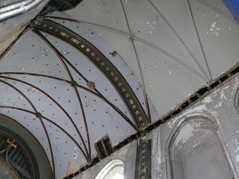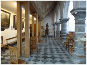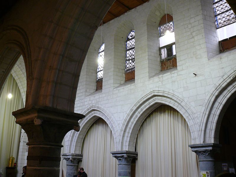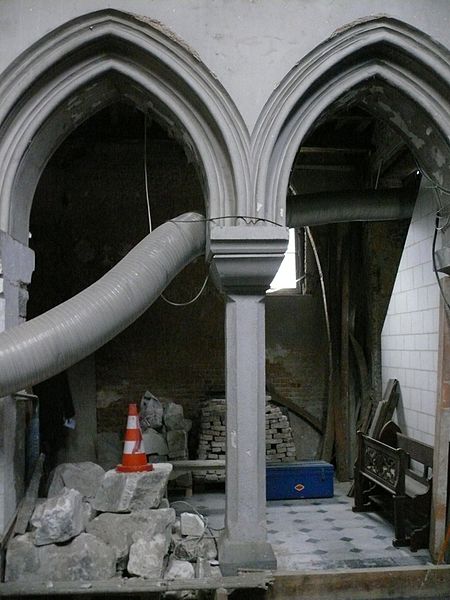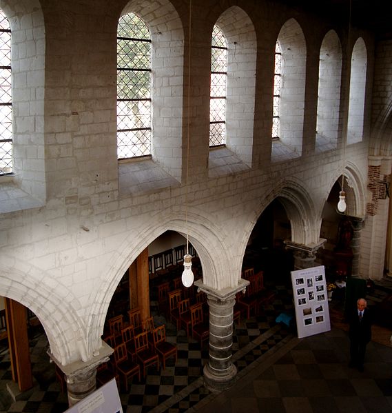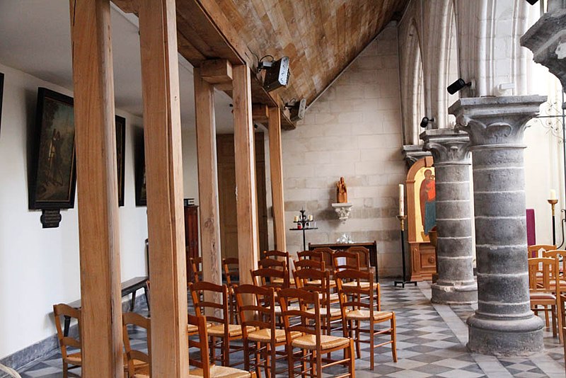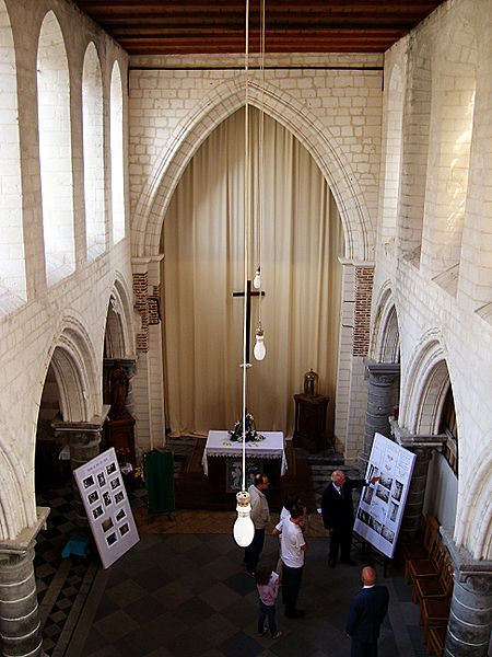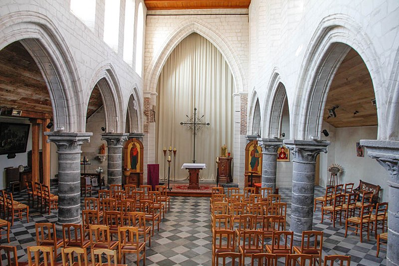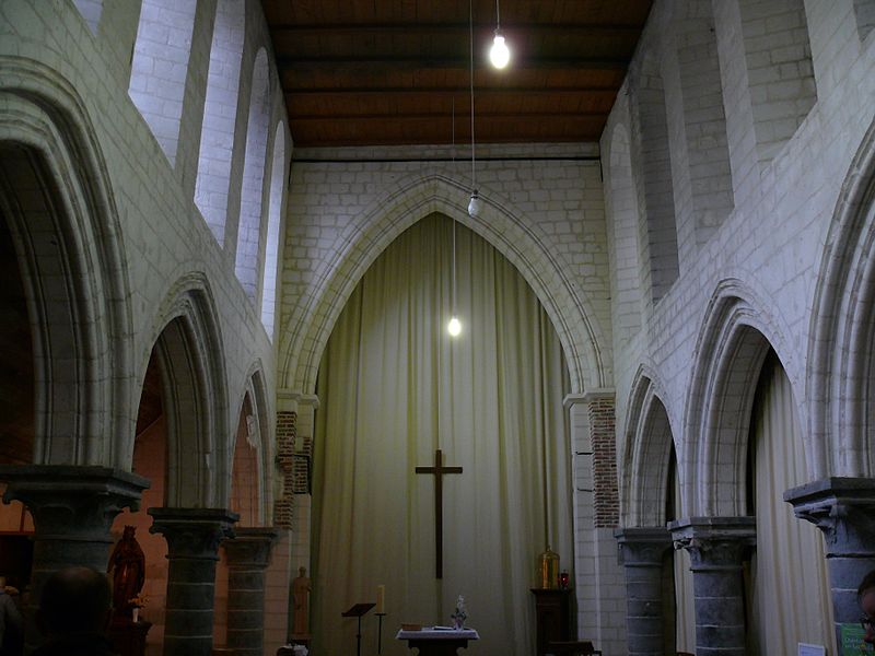 De style intermédiaire entre le roman et le gothique, la partie la plus ancienne — la nef et le chœur — est bâtie en pierre. La nef est séparée des collatéraux par deux rangées de cinq colonnes en pierre bleue de Tournai ; les bas‑côtés sont percés de deux séries de sept fenêtres. Le chœur est distinct de la nef par un arc de pierre. Les restaurations et adjonctions du XIXe siècle, comme la façade, les chapelles latérales et la sacristie, ont été réalisées en brique.