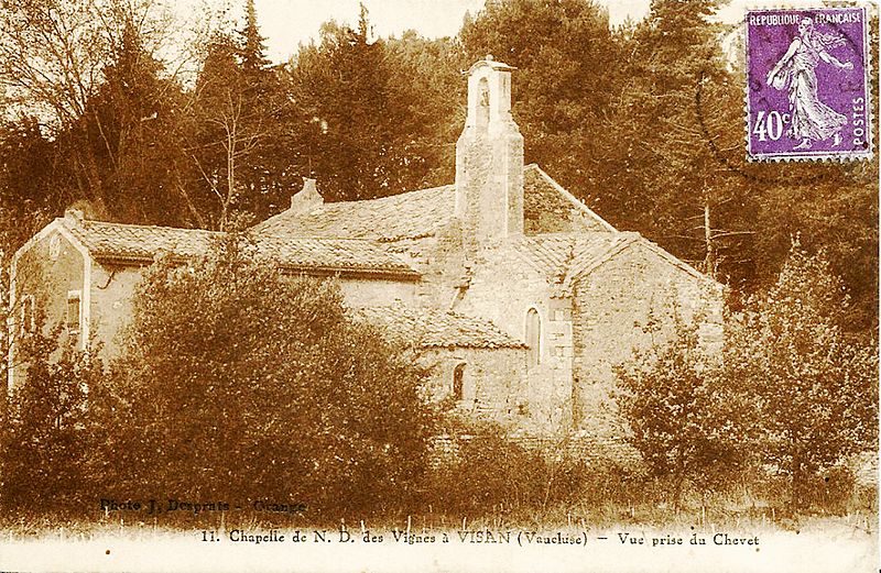 La chapelle Notre-Dame-des-Vignes de Visan, dans l'enclave des papes, est un lieu de culte rural dont la construction primitive est datée de la première moitié du XIIIe siècle. Elle porta jusqu'au XVIIIe siècle le nom de Notre-Dame-d'Entre-les-Vignes et fut placée sous la responsabilité de rectoresses. Elle demeure un lieu de pèlerinage pour la Confrérie Saint-Vincent de Visan, qui, lors de son chapitre d'été, bénit un pied de vigne, la « souco », en espérant une bonne vendange ; la cérémonie se déroule en présence du roi, de la reine et du lieutenant nouvellement élus de la confrérie. Des vestiges d'époque romane subsistent à proximité et, dans les murs extérieurs de la chapelle actuelle, deux pierres réemployées portent des inscriptions lues BIIT / QAR / RPT et VIIK / APLT, dont la graphie est datée entre la première moitié et le milieu du XIIIe siècle. La chapelle, reconstruite, est citée pour la première fois en 1492 sous le nom de Notre-Dame-d'Entre-les-Vignes. Le chœur fut construit en 1508 par André Colombet. Le clocher sur la façade fut achevé en 1514 par Claude Thénot, de Valréas. Un vœu d'Antoine de Piolenc, consul de Visan, fut formulé le 25 août 1629 pour protéger la ville de la peste. Le chœur fut restauré et décoré à partir de 1637. En 1731, des dominicains s'installèrent à Notre-Dame-des-Vignes et construisirent le couvent qui occupe l'emplacement de la chapelle romane ruinée. La nef, couverte d'une charpente, fut fortement endommagée par le débordement du torrent voisin en 1753 et réparée à plusieurs reprises. En 1777, un marché fut passé avec les maçons et plâtriers Augustin Geoffroy et Jean-Pierre Pellissier, de Visan, pour établir une fausse voûte en berceau de la nef sur des doubleaux en pierre de Beaumes-de-Venise, élever un clocher sur la sacristie et refaire le porche et la porte ; un culot de la nef porte la date 1778. Un cadran solaire fut rapporté en 1876. Le porche fut reconstruit en 1911, sa voûte remplacée par une charpente en 1927. Depuis 1975, une communauté de dominicaines vit à demeure dans le couvent jouxtant la chapelle du XVe siècle. L'entretien des bâtiments a été assuré par les rectoresses de la communauté de Visan et le service religieux a été rendu successivement par des ermites ou des religieux. La chapelle a été classée au titre des monuments historiques le 23 août 1990. De la moitié du XVe siècle jusqu'à la Révolution, l'administration de la chapelle fut confiée à deux rectoresses annuelles, dont les noms sont consignés dans les archives. Les archives mentionnent des rectoresses dès Marguerite Marcheyer (1450-1500) et jusqu'à Rose Vigne en 1794, illustrant la continuité de cette pratique. Les rectoresses étaient désignées chaque année par le curé, assisté de celles qui quittaient leur charge ; l'une détenait la clef du tronc et l'autre réglait les dépenses. Pour les dépenses excédant trente sols, l'accord des deux rectoresses, du curé et du premier consul de Visan était requis ; les sommes inférieures pouvaient être engagées avec l'accord du curé et d'une rectoresse. La rectoresse dépositaire des fonds rendait compte annuellement de sa gestion, approuvée par sa collègue, le curé, les consuls et les successeurs élus. Fondée en 1475, la Confrérie Saint-Vincent de Visan possédait une chapelle hors du village et organisait chaque 22 janvier une procession à laquelle les confrères devaient participer, précédée d'une bravade. À partir du XVIIIe siècle, la cérémonie de la souche s'ajouta à cette procession ; elle est mentionnée pour la première fois en 1714, jugée païenne par le clergé et supprimée en 1735. Lors de la renaissance de la confrérie, en août 1978, les membres choisirent Notre-Dame-des-Vignes comme lieu de pèlerinage pour leur chapitre estival, qui se déroule le troisième dimanche de juillet. L'arc triomphal de la chapelle porte l'inscription Posuerunt me custodem in vineis. Sur le parvis, après un sermon prononcé en provençal, le curé bénit la souche de vigne ; le cep est ensuite rapporté sur la place du Marot pour y être brûlé devant les ruines du château delphinal.