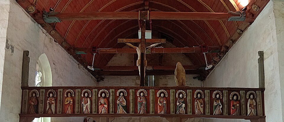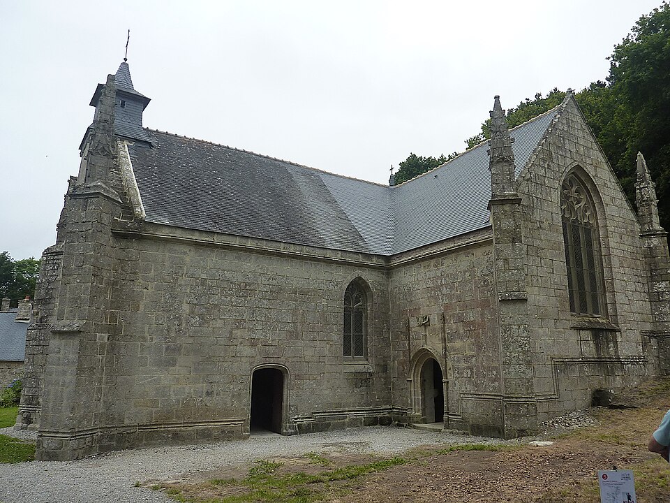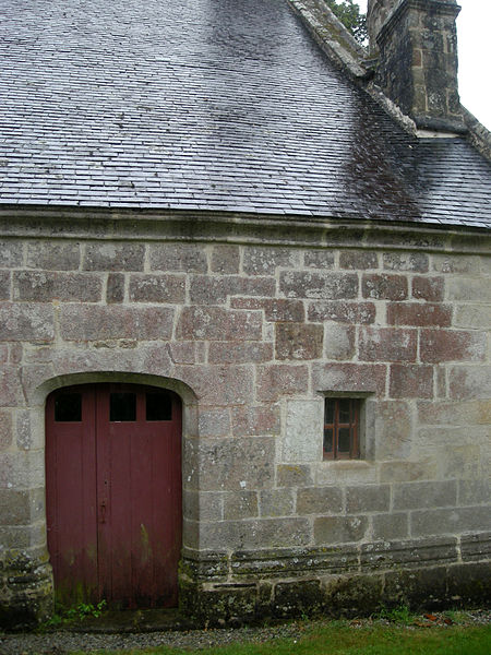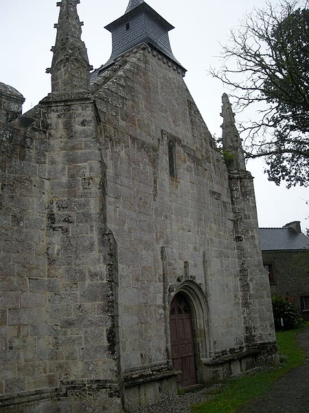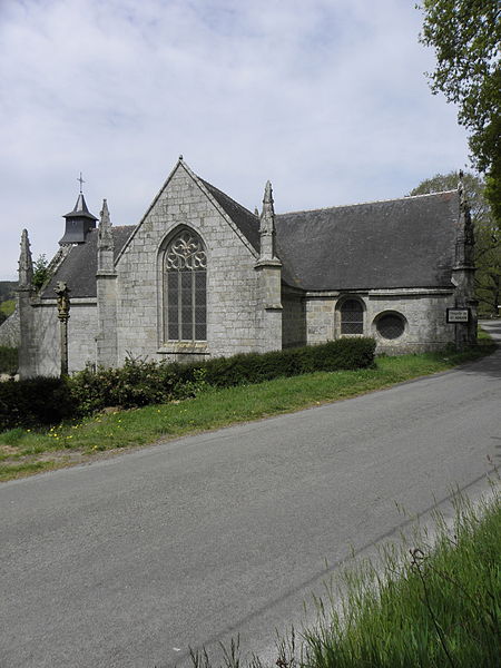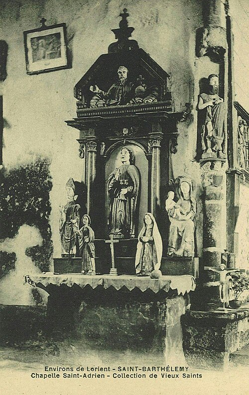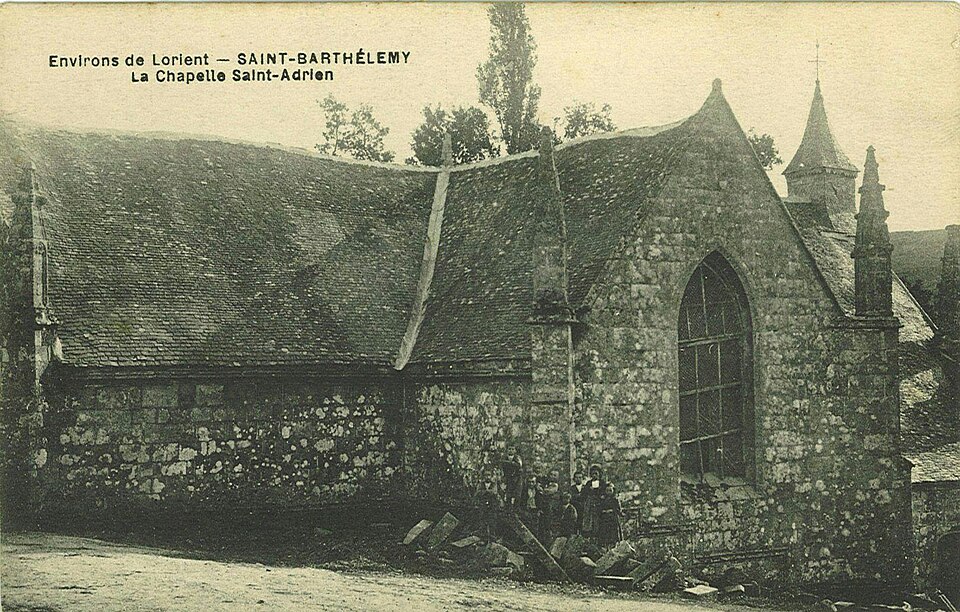 La chapelle Saint-Adrien, située au lieu-dit Saint Adrien sur la commune de Saint-Barthélemy (Morbihan), est dédiée à saint Adrien. Elle est classée au titre des monuments historiques depuis le 25 août 1932. L'édifice, en forme de croix latine avec chevet plat enterré sur 1,50 m, date essentiellement de la fin du XVe siècle et a été édifié par la famille de Rohan ; leurs armes, bûchées, figurent au chevet et sur la porte du bras sud. La datation s’appuie notamment sur les sablières, attribuées au même auteur que celles, datées des années 1480, de Notre-Dame de Quelven en Guern. Les armes des Rohan y sont associées à celles de la famille de Baud, qui attestent de leur légitimité locale à cette époque. Une inscription portant la date 1565 pourrait correspondre à plusieurs interventions — construction de la sacristie, reprise d'ouvertures, mise en place de vitraux — et certains fragments de verrières portent les armes des Rimaison, présents alors que la famille de Rohan s'était effacée. En 1937, la maîtresse-vitre et la verrière du transept sud représentant la Passion furent déposées et le meneau de la fenêtre sud refait ; d'autres verrières, dont celle du transept nord (Annonciation) et celle de la nef sud (Trinité), ont été déposées à des dates mal documentées. Le retable majeur, déposé depuis le début du XXe siècle, occultait en partie la maîtresse-vitre dont la baie est désormais partiellement bouchée. Au XIXe siècle, une voûte en plâtre a dissimulé les lambris de couvrement ; ces lambris ont été dégagés au-dessus du chœur dans les années 1970 et refaits sur la nef. La chapelle s'implante sur un site où un ancien culte de l'eau était pratiqué : la chapelle primitive remonterait aux premiers temps du christianisme et aurait remplacé ce culte. Deux menhirs se trouvent à proximité et une fontaine de dévotion surmontée d'une croix est située à l'extérieur ; deux autres fontaines subsistent à l'intérieur, l'une dans le chœur et l'autre dans le bras droit du transept. L'intérieur conserve un jubé très simple, sculpté côté nef et peint côté chœur ; les sculptures représentent le Christ entouré des douze apôtres, vêtus comme des chevaliers du Temple, ce qui alimente la tradition d'une appartenance templière. L'édifice présente également des sablières sculptées, des pinacles à crochets et des éléments architecturaux notables tels que la porte ouest du transept sud, le chevet et le transept nord ; on relève enfin des portes sur les façades ouest et nord et un calvaire aux faces nord‑est et nord‑ouest.