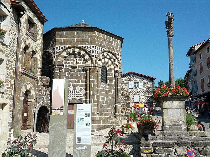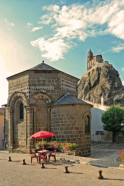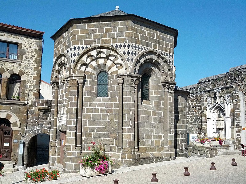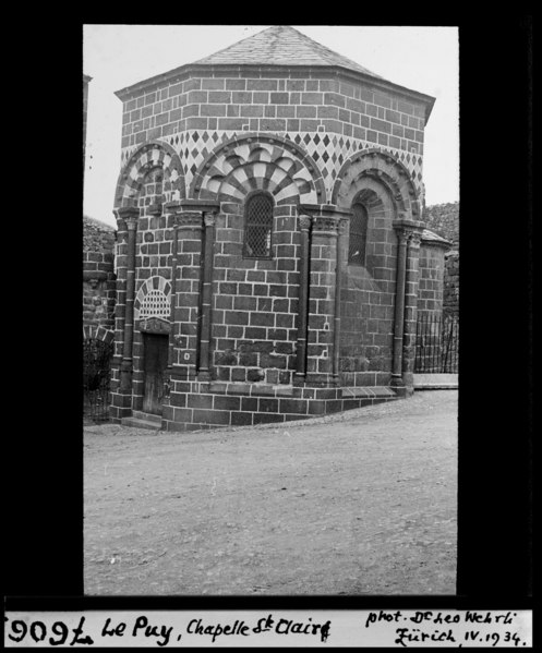 La chapelle Saint-Clair, également dénommée Temple de Diane, est un édifice roman auvergnat situé à Aiguilhe, en Haute-Loire (Auvergne-Rhône-Alpes). Elle se trouve au pied du piton volcanique qui supporte l'église Saint-Michel d'Aiguilhe. Édifiée au XIIe siècle comme chapelle de l'hôpital Saint-Nicolas fondé par Bernard, gardien du sanctuaire en 1088, elle est classée au titre des monuments historiques depuis 1889. Construite en pierre de taille volcanique et en arkose, la chapelle est couverte d'ardoise. Son plan est centré et octogonal, prolongé par une abside semi-circulaire. Chaque façade est ornée de mosaïques de pierres polychromes disposées au-dessus d'un arc en saillie qui repose sur deux colonnes munies de chapiteaux très stylisés. Les voussures de certains arcs sont décorées de boules et de claveaux polychromes, et quelques arcs présentent un trilobé, forme simple de l'arc polylobé. Ce type d'arc, hérité de l'architecture omeyyade du califat de Cordoue, s'est diffusé dans l'architecture romane française sous l'influence des pèlerins le long des grandes routes de Saint-Jacques-de-Compostelle, notamment la Via Podiensis qui passe par Aiguilhe. L'artiste plasticien Dominique Kaeppelin, du Puy-en-Velay, a aménagé le chœur et réalisé une croix. L'ensemble du site comprend, outre la chapelle, l'ancien hôpital Saint-Nicolas et des éléments de la porte de la ville, avec une porte principale sud pourvue d'un linteau monolithique et une petite porte nord. On y remarque également une coupole reposant sur des chapiteaux, un chapiteau historié et, sur la place, une copie d'un calvaire de la Renaissance ainsi que l'église Saint-Michel.