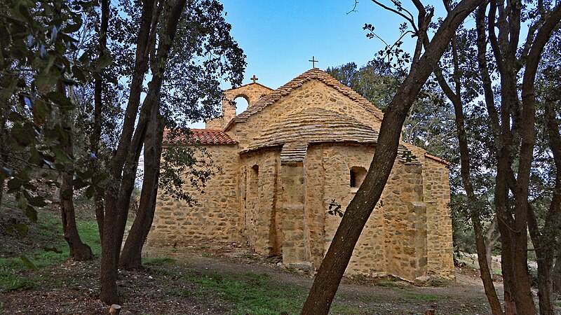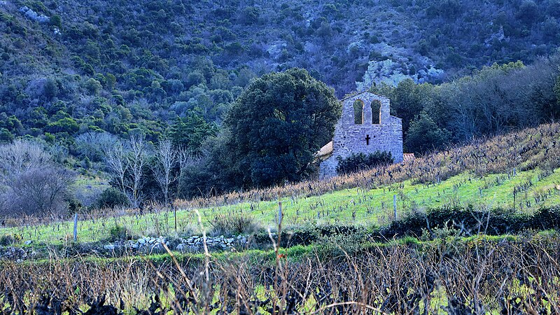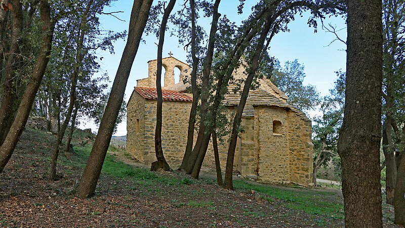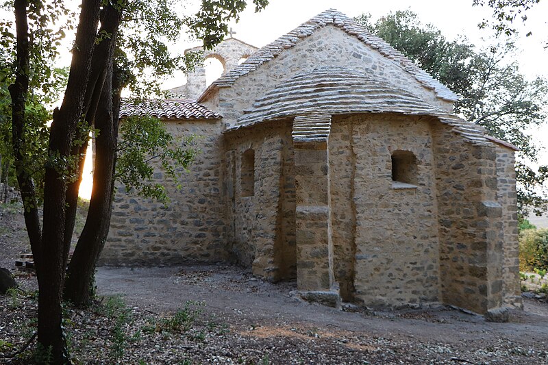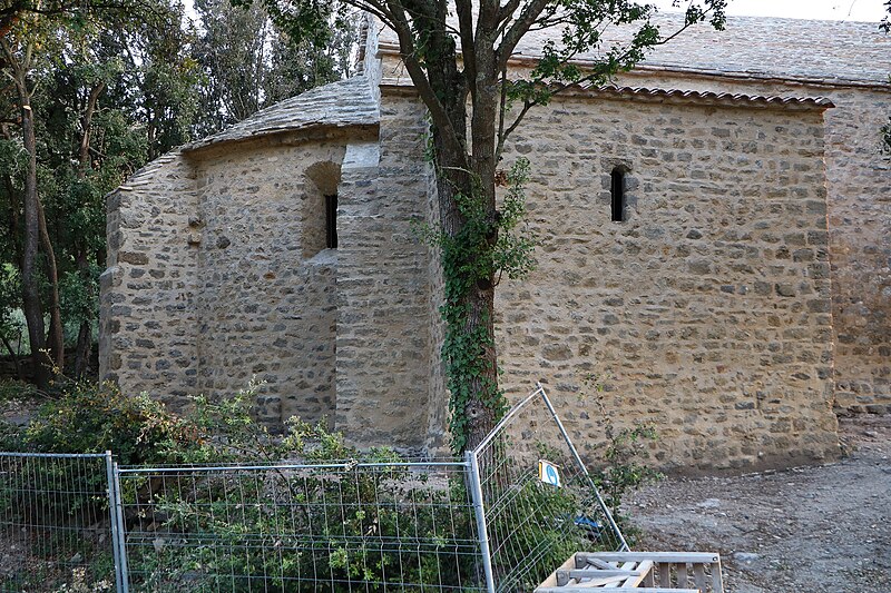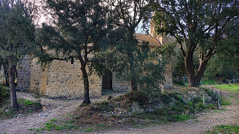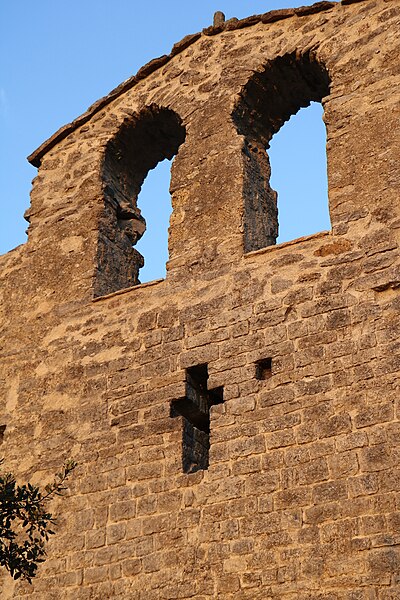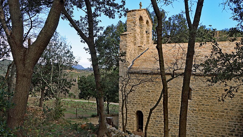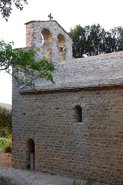 La couverture, initialement en dalles et à pente assez forte, a ensuite été transformée par l'exhaussement des murs goutterots et la pose de tuiles canal sur charpente. Le mur de fond est percé d'un oculus cruciforme, rappelant ceux des églises de Catalogne. La surélévation du mur en clocheton, de facture différente, abrite deux baies ; les baies campanaires conservent cependant un aspect très archaïque.