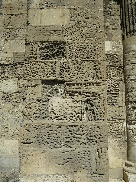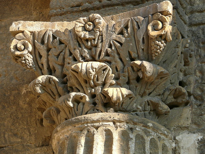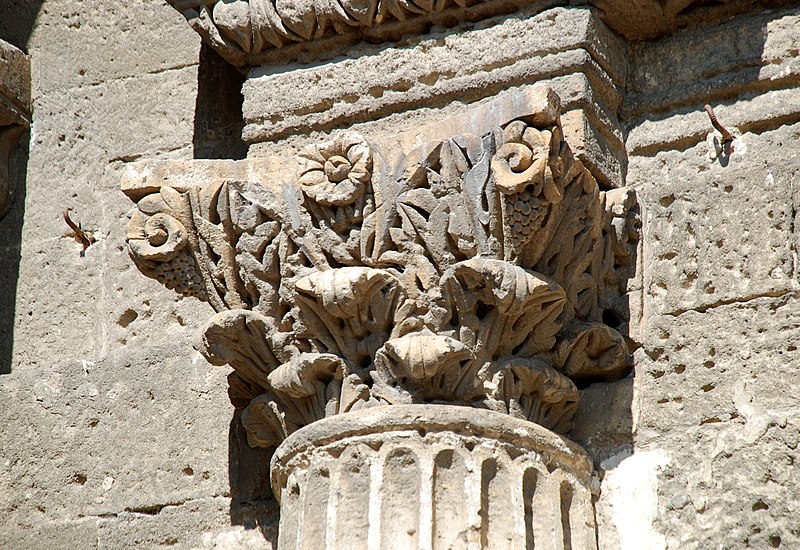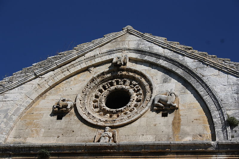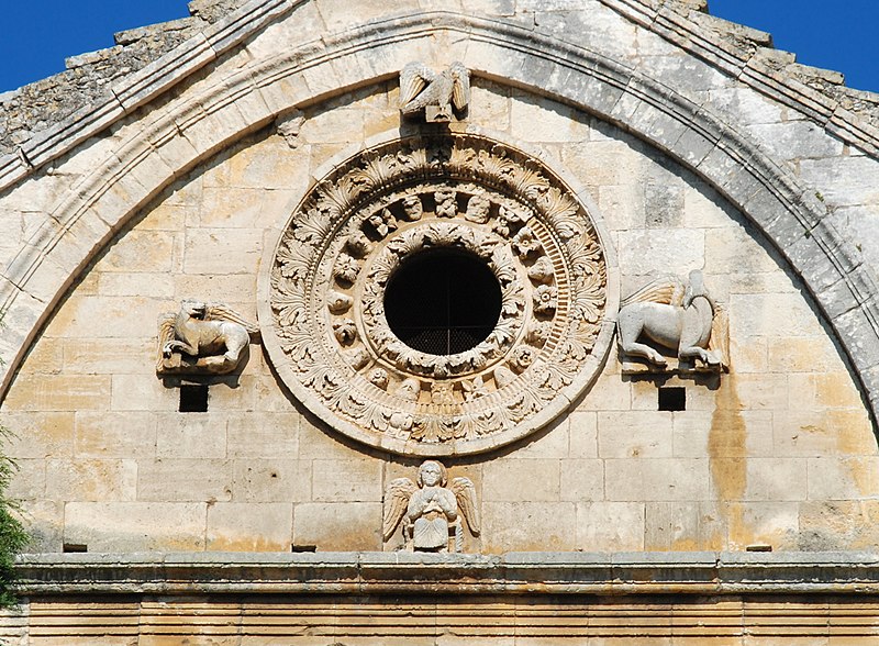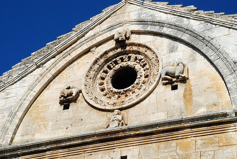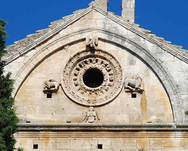 La décoration sculptée associe motifs antiques et compositions romanes. Le tympan du premier portail représente à gauche la scène de Daniel dans la fosse aux lions (scène présentée dans le texte comme liée à l’annonce messianique par Gabriel) et à droite la chute d’Adam et Ève autour de l’Arbre de la connaissance entouré du Serpent. Le fronton triangulaire du second portail porte un bas-relief disposé en trois arcades où figurent, à gauche et au centre, l’Annonciation et, à droite, la Visitation ; l’ensemble est surmonté d’un agneau pascal. L’oculus est encadré par le tétramorphe — l’aigle de saint Jean en haut, l’ange de saint Matthieu en bas, le lion de saint Marc à gauche et le taureau de saint Luc à droite — une disposition rappelant une réminiscence carolingienne.