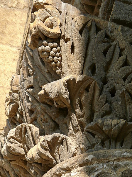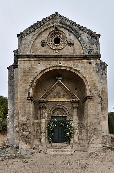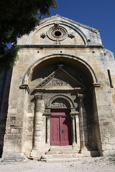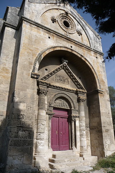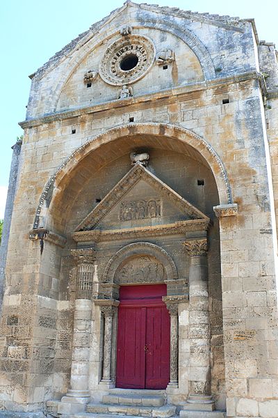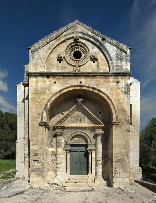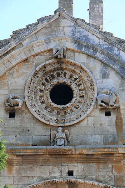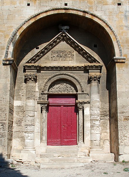 La façade, inspirée des décorations romaines du Bas-Empire, présente une composition complexe : un petit portail inscrit dans un second, surmonté d’un fronton triangulaire à l’antique, le tout abrité sous un grand arc de décharge en plein cintre, lui-même couronné par un oculus entouré du tétramorphe et logé sous un arc brisé. Le premier portail est encadré par deux colonnes aux chapiteaux à feuilles d’acanthe, avec des frises d’oves et de méandres ; il est surmonté d’un tympan sculpté bordé d’une frise d’oves. Le second portail, qui englobe le premier, est flanqué de colonnes à l’origine cannelées et couronné par un fronton orné de frises d’oves et de feuilles d’acanthe. L’arc en plein cintre s’appuie sur des corniches sculptées d’acanthes et est également bordé d’une frise d’oves, tandis que l’oculus comporte plusieurs registres décoratifs dont deux à motif d’acanthe.