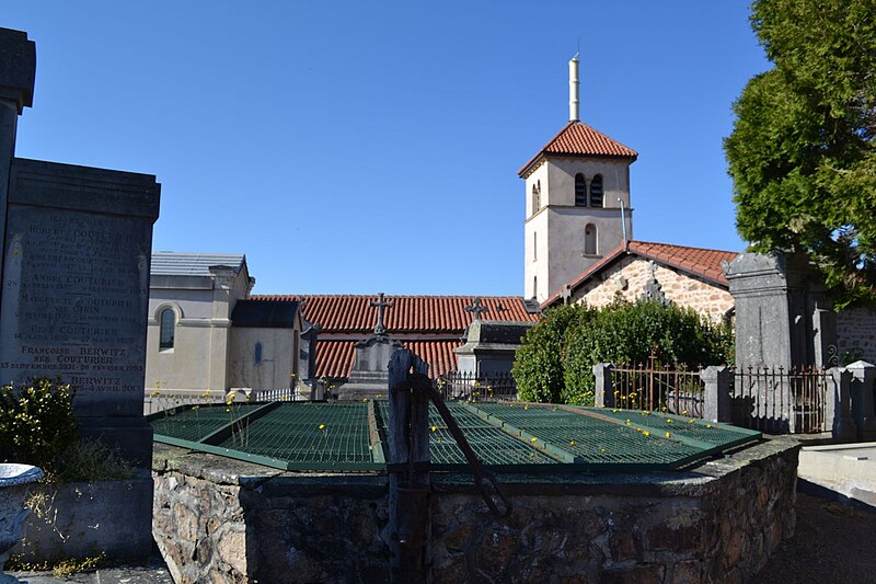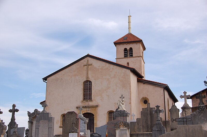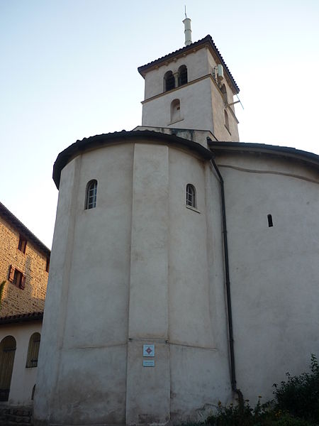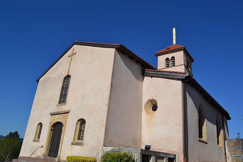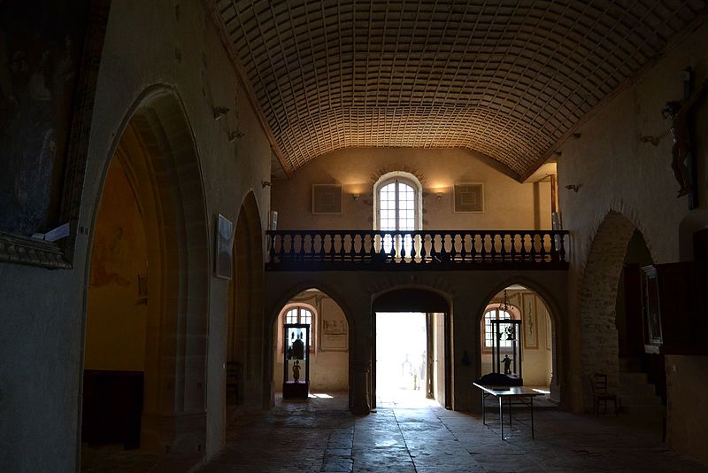 L'intérieur conserve des éléments lapidaires du XIIe siècle provenant du prieuré de Bourg-de-Thizy et de nombreuses peintures murales datées des XVe, XVIe et XVIIe siècles ornant les chapelles latérales et le transept. Dans la troisième chapelle en partant de l'ouest figurent les armoiries de Pierre Tricaud, notaire, sur la clé de voûte et une peinture représentant celui-ci avec son épouse et leurs cinq enfants ; sur le mur opposé se lisent une Descente de Croix et une Mise au tombeau. La deuxième chapelle porte les initiales « ZB » de Zacharie Béred sur la clé de voûte et une représentation d'un personnage agenouillé sur le mur. La chapelle du transept présente les armoiries des Moncorgé, une Crucifixion et deux personnages accompagnés de la date 1556. Sur la voussure du transept nord, à l'est, figure une Vierge à l'Enfant sur un trône à pinacles ; à l'ouest, une église placée sous la protection d'un personnage, le tout entouré d'un semis de motifs châbloués et d'un petit damier courant le long de l'arc sud.