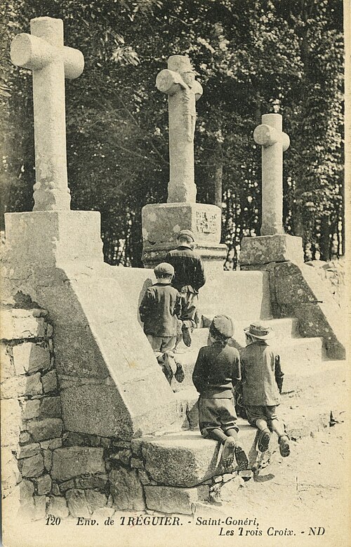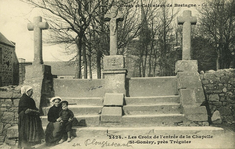 La chapelle Saint-Gonéry se situe à Plougrescant, dans les Côtes-d'Armor. Elle comprend un clocher-porche à deux étages, une nef unique et un chœur à chevet plat formant un tau. Le noyau le plus ancien est un oratoire probablement édifié au XIIe siècle, profondément remanié par la suite. La partie ouest conserve un clocher-porche roman massif, coiffé d'un toit en bâtière et élevé en maçonnerie à joints gras ; dans le mur ouest s'ouvre une porte en arc de plein cintre à claveaux non taillés. Des transformations postérieures sont visibles, comme des baies rebouchées, une fenêtre géminée gothique à l'étage côté sud et une tourelle d'escalier circulaire à l'angle sud‑est. Au XVe siècle, à la suite de l'essor du pèlerinage, l'édifice fut prolongé vers l'ouest par une nef et un chœur lambrissés ; l'ancienne chapelle fut alors transformée en clocher-porche et l'on perça de nouvelles baies en annexant une tourelle desservant l'étage destiné aux archives et reliques. À la fin du XVe siècle, les lambris de la nef furent entièrement décorés de peintures : chaque versant de la voûte est divisé en deux registres représentant en haut des scènes de l'Ancien Testament (Création) et en bas des scènes du Nouveau Testament (Nativité, Passion). Le plafond voûté comporte notamment l'Adoration des Mages, la Fuite en Égypte avec l'enfant et sa mère, ainsi que la Cène, avec un détail représentant Judas Iscariote accompagné d'un diable. En 1599 fut élevé le tombeau de Guillaume du Halgouët, évêque de Tréguier originaire de Plougrescant, placé à la limite du chœur et de la chapelle nord, l'évêque s'engageant alors à réparer un pignon menacé. En 1612 on ajouta sur le toit du clocher-porche une flèche en plomb dont la base, insuffisamment solide, s'est penchée d'un côté tandis que la flèche s'est inclinée de l'autre ; malgré des travaux de consolidation elle a conservé cette silhouette particulière. En 1614 fut encore élevé un nouveau tombeau à Saint Gonéry dans la tour-porche, face à un ancien sarcophage mérovingien. Aux XVIe et XVIIe siècles, la chapelle était entourée d'un placître comprenant un enclos, une porte triomphale, une fontaine sacrée et une chaire extérieure ; l'entrée nord-ouest date de 1780. La partie gothique est éclairée au sud et à l'est par des baies flamboyantes à remplage, le mur nord restant aveugle ; la tour communique avec la nef par un arc brisé et la nef est séparée du chœur par un arc brisé dont les deux voussures se fondent directement dans les piliers latéraux. La chapelle possède de belles sablières sculptées à engoulants, probablement du début du XVIe siècle, et dans l'enclos paroissial subsiste une chaire extérieure. Deux fragments de vitraux des XVe ou XVIe siècles représentant la Vierge et saint Jean se trouvent dans une baie proche de l'entrée. Le mobilier et le décor comprennent les lambris peints de la nef, le vitrail représentant la Vierge et saint Jean, le tombeau de Guillaume de Halgouët (1599), une statue de la Vierge, la porte ornée de trois saints (Tugdual, Yves et Gonéry), un bahut et un reliquaire ; plusieurs de ces éléments sont protégés au titre des monuments historiques (certains classés depuis 1908, le reliquaire depuis 1948). La chapelle est classée au titre des monuments historiques depuis le 19 janvier 1911 et le cimetière adjacent depuis le 11 juillet 1942.