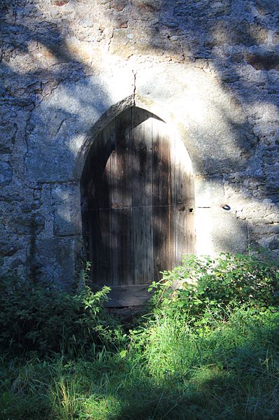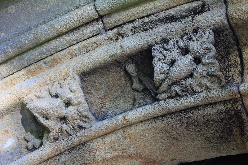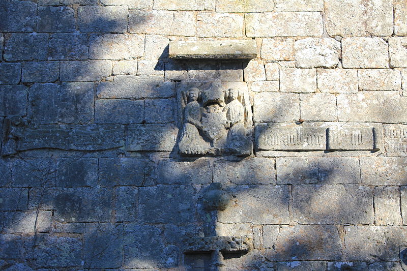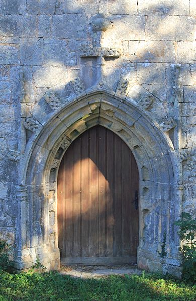 La façade est encadrée par deux pilastres prismatiques ornés de feuilles de chou stylisées et d’éléments gothiques ; le blason seigneurial est soutenu par deux angelots. Des transformations ont eu lieu au XVIIe siècle, notamment l’ajout du clocheton sur le pignon ouest, et l’on signale probablement l’installation, au nord, d’un retable de chevet éclairé par une fenêtre peut‑être percée au XVIIIe siècle, ce qui aurait entraîné la condamnation de la grande baie axiale.