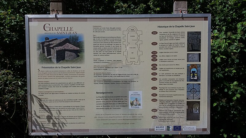 La chapelle Saint-Jean est une chapelle romane située sur la commune de Crupies, dans le département de la Drôme en région Auvergne-Rhône-Alpes. Elle est mentionnée pour la première fois en 1107 et dispute avec l'église Saint-Jean-Baptiste de Charols le titre d'édifice religieux le plus ancien du département. La chapelle dépendait de l'abbaye bénédictine de Savigny, plus précisément du prieuré Saint-Michel de Bourdeaux. Elle est inscrite au titre des monuments historiques depuis le 26 décembre 1980. Des ressources en ligne — Clochers de France, l'Observatoire du patrimoine religieux, la base Mérimée et le site de la chapelle — permettent d'approfondir la documentation ; voir également la liste des monuments historiques de la Drôme.