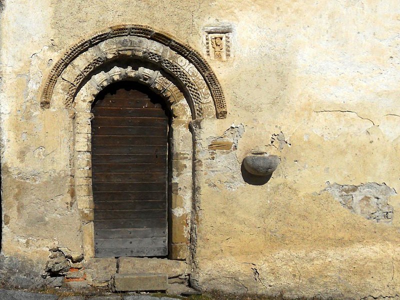 Ajout du portail roman orné et du bas-relief de saint Pierre.
