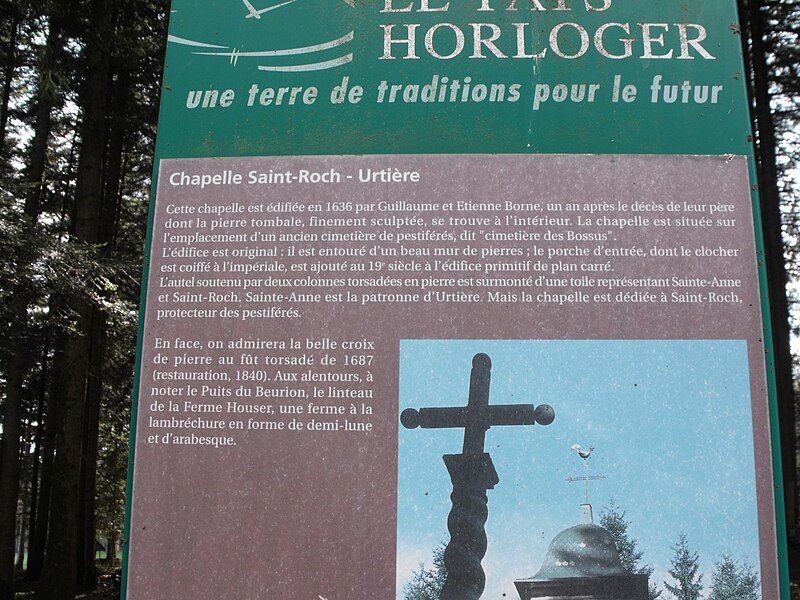 La chapelle Saint-Roch d'Urtière est un petit édifice catholique situé dans le village d'Urtière, dans le département du Doubs. Elle a été élevée en 1636 par Guillaume et Étienne Borne sur l'emplacement d'un ancien cimetière de pestiférés, dit le « cimetière des bossus », en mémoire de leur père Pierre Borne, décédé en 1635 et inhumé sur place ; la date figure sur le linteau de la porte. En 1687, une croix torsadée fut dressée en vis‑à‑vis de l'entrée. Un clocher a été ajouté au XIXe siècle ; il présente un dôme galbé à l'impériale, de tradition comtoise, et est couvert de tavaillons en bois. L'enclos, la chapelle et la croix sont inscrits au titre des monuments historiques depuis le 6 avril 1994. La chapelle, de plan carré et de dimensions modestes, se situe dans une clairière au milieu d'un bois, un peu à l'écart du minuscule village d'Urtière (8 habitants en 2011). Elle dépend de la paroisse de Maîche, dans le diocèse de Besançon. L'enclos est ceint d'un muret de pierres et la croix monumentale fait face à la porte. À l'intérieur, le tombeau de Pierre Borne est signalé par une pierre tombale finement sculptée portant l'inscription « CI GIT PIERRE BORNE DURTIR DECEDE L'AN 1635 DIEU AIT SON AME ». L'autel, soutenu par deux colonnes torsadées en pierre, est surmonté d'un tableau représentant sainte Anne avec saint Roch ; sainte Anne est la patronne du village.